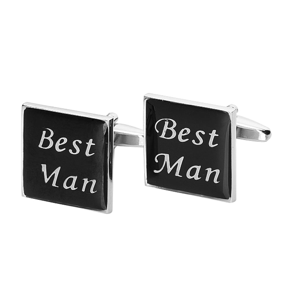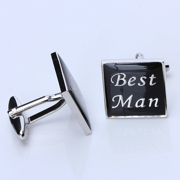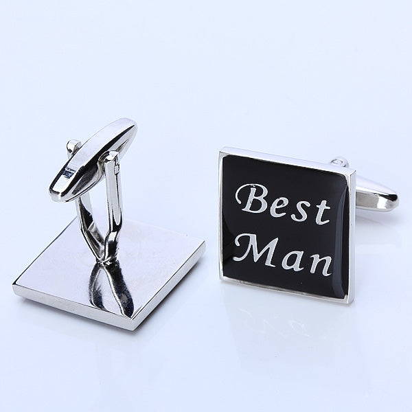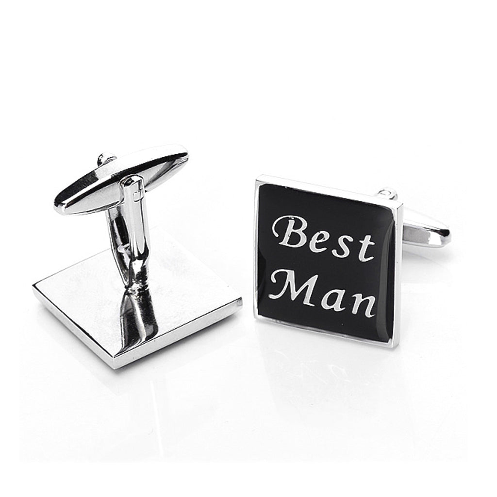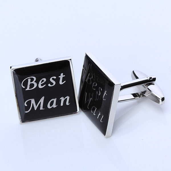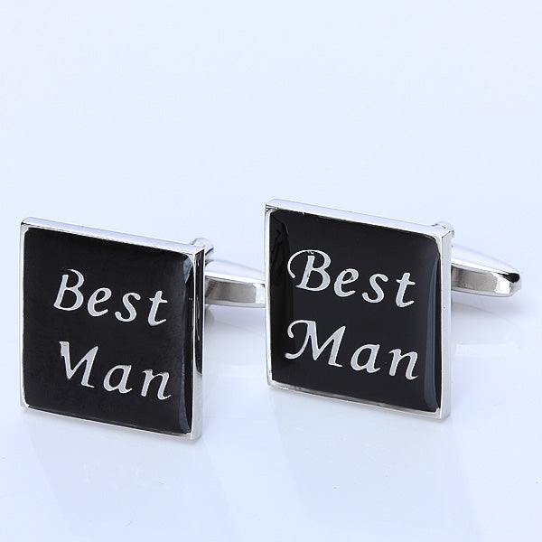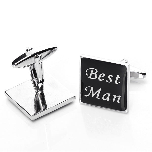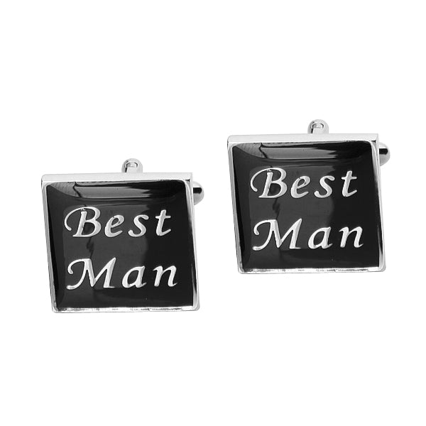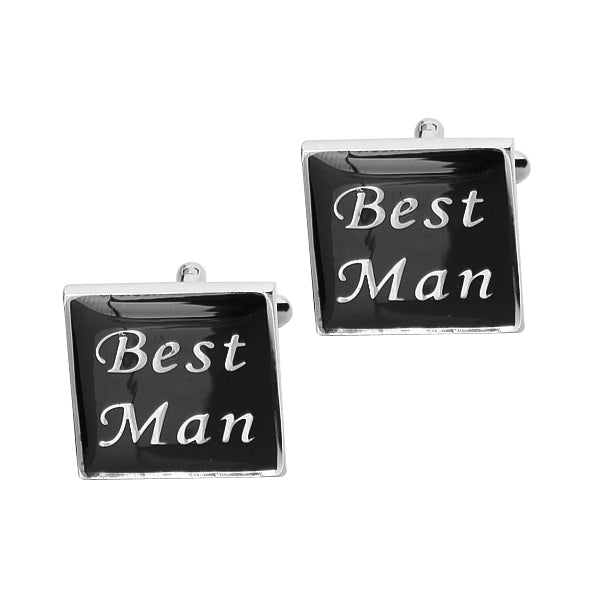 • A large square base with black enamel background with the silver word 'BEST MAN' on cufflinks, written in slightly raised text