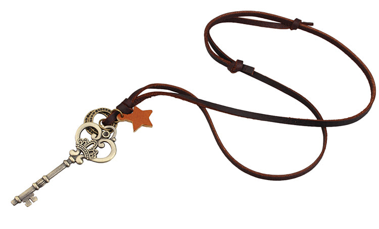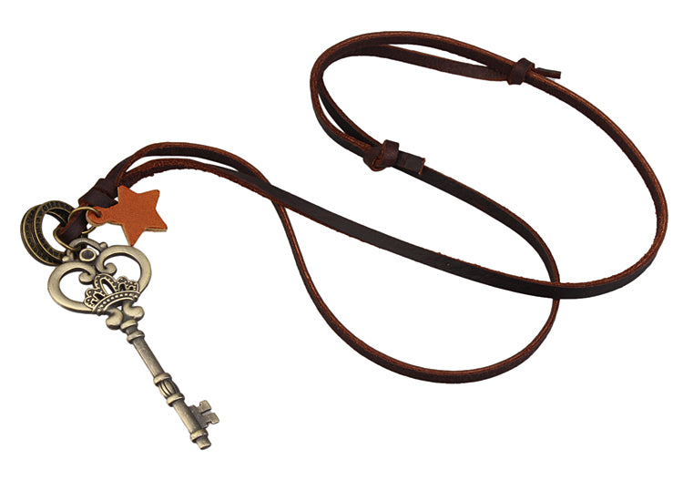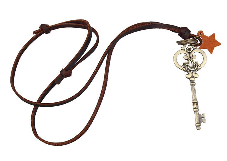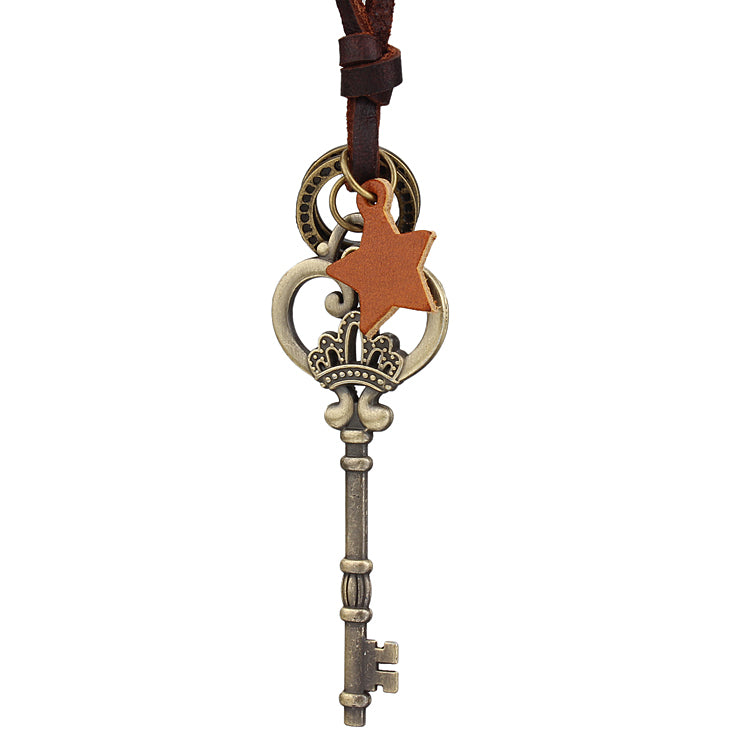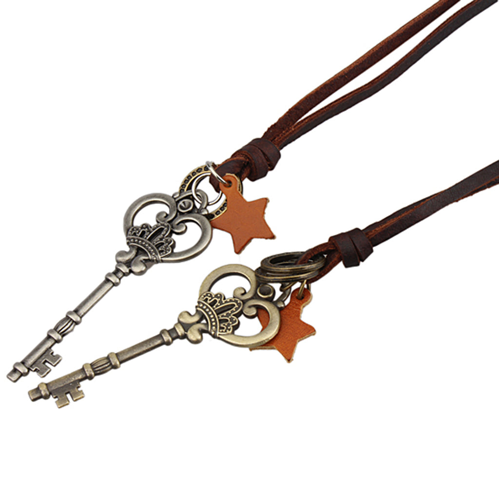 Vintage Unisex Crown Key Pendant Leather Necklace Chain Bronze