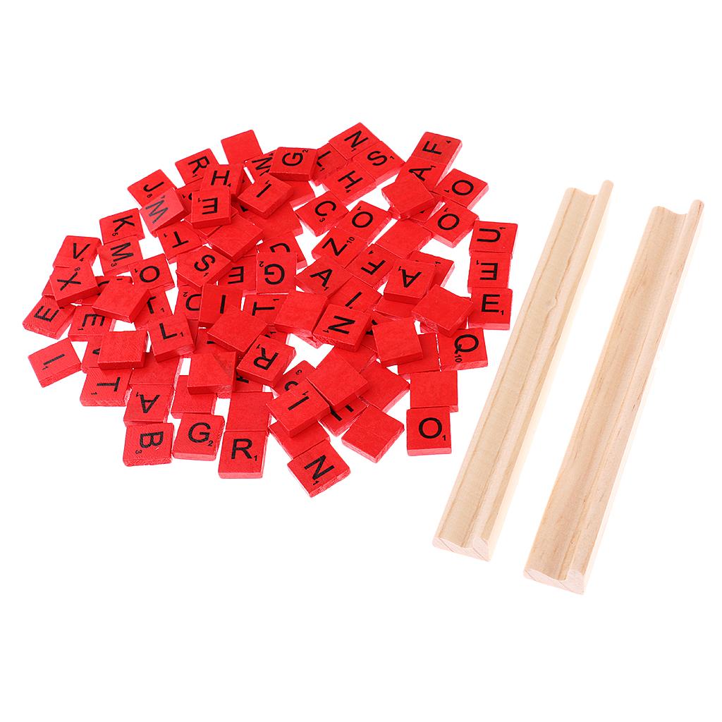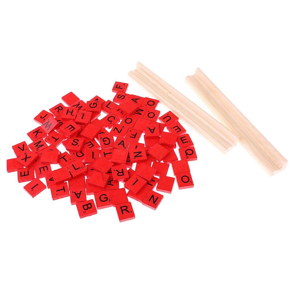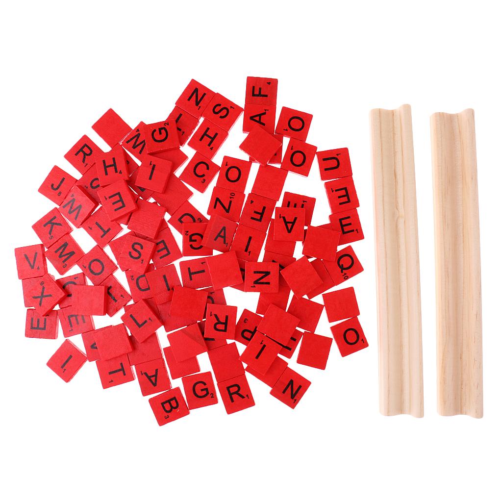 100pcs Wooden Red Letter Tiles with 2pcs Tile Racks for Crafts Scrapbook Game