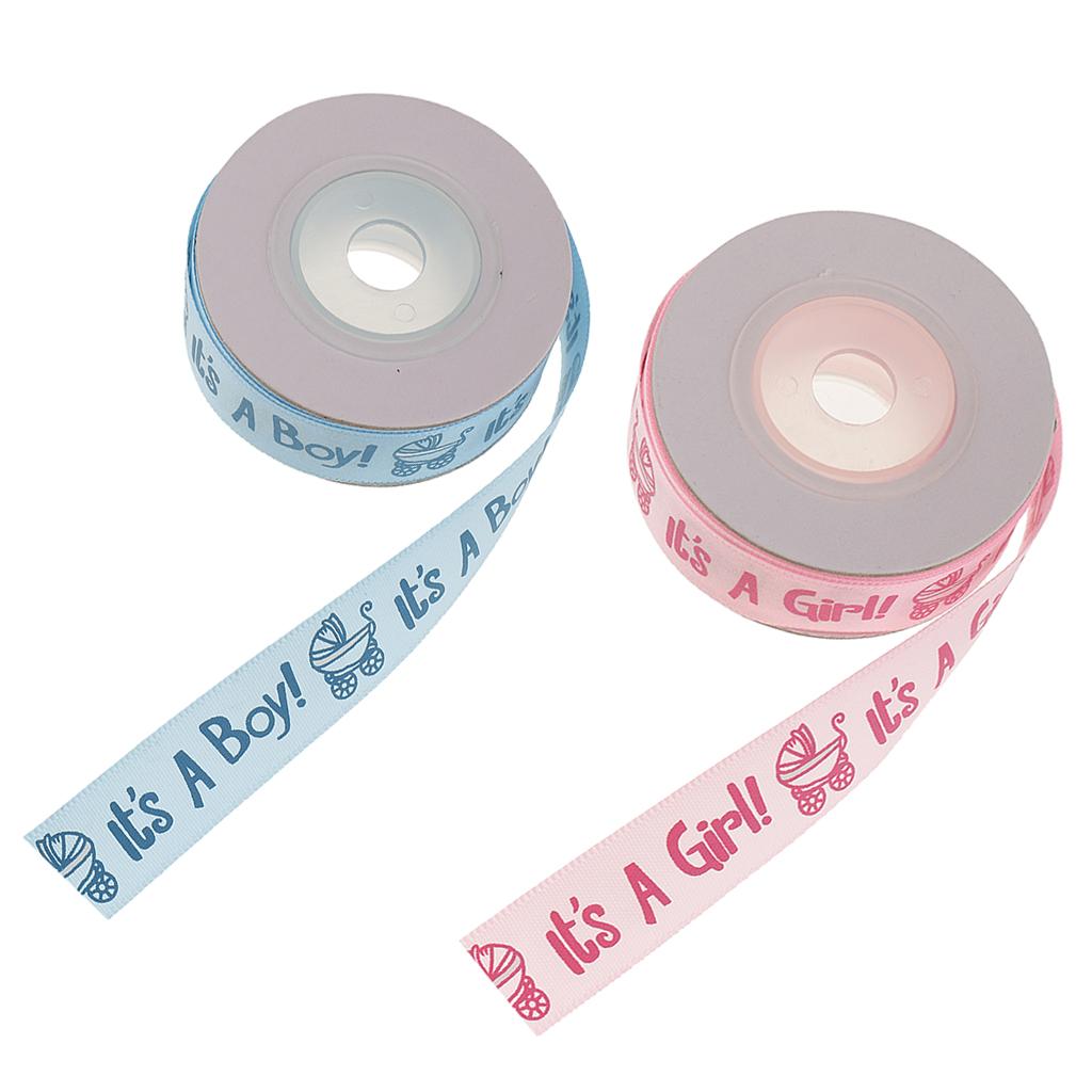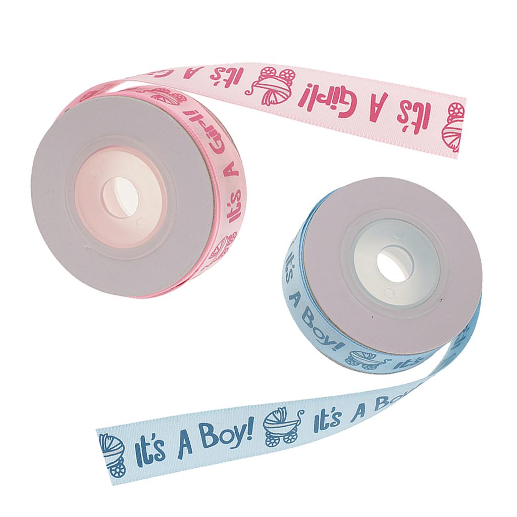 Lovely satin ribbon, printed with baby pram stroller and It's A Girl or It's A Boy Letters.
