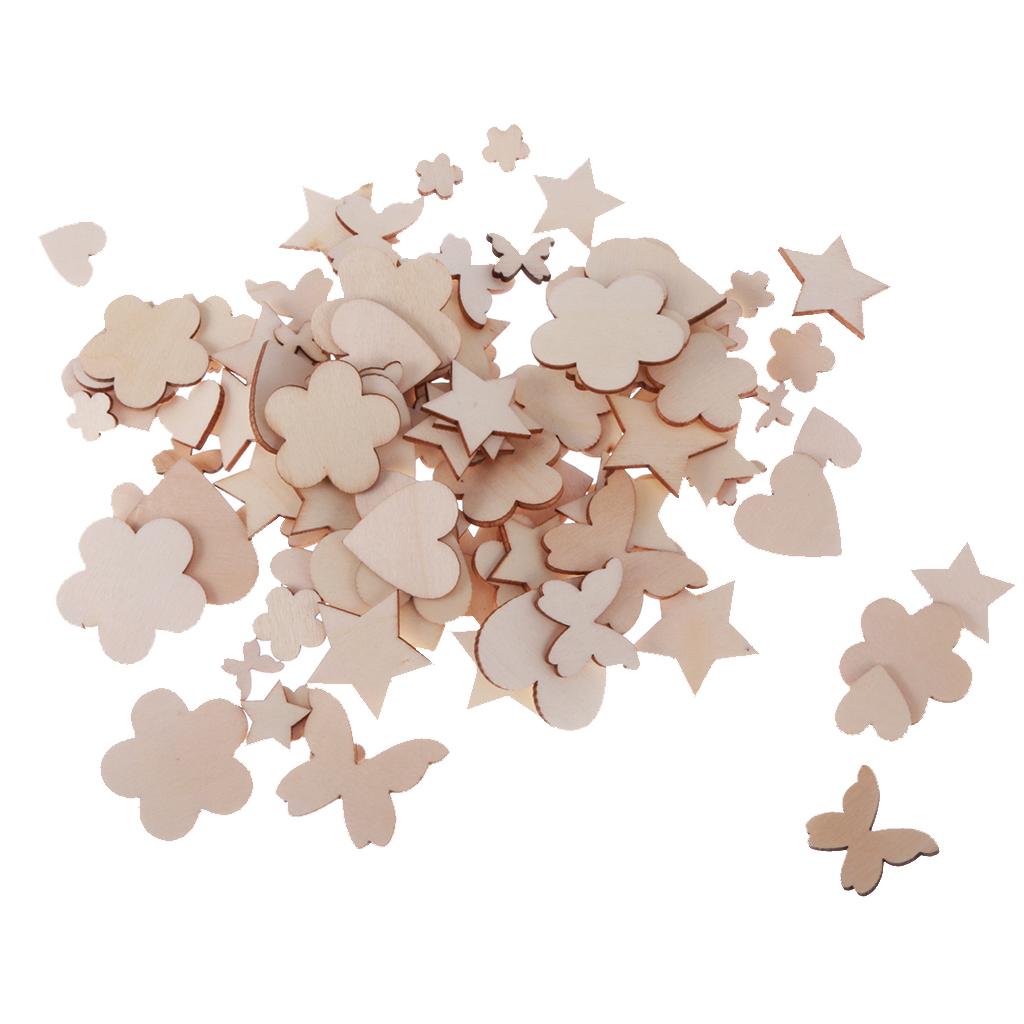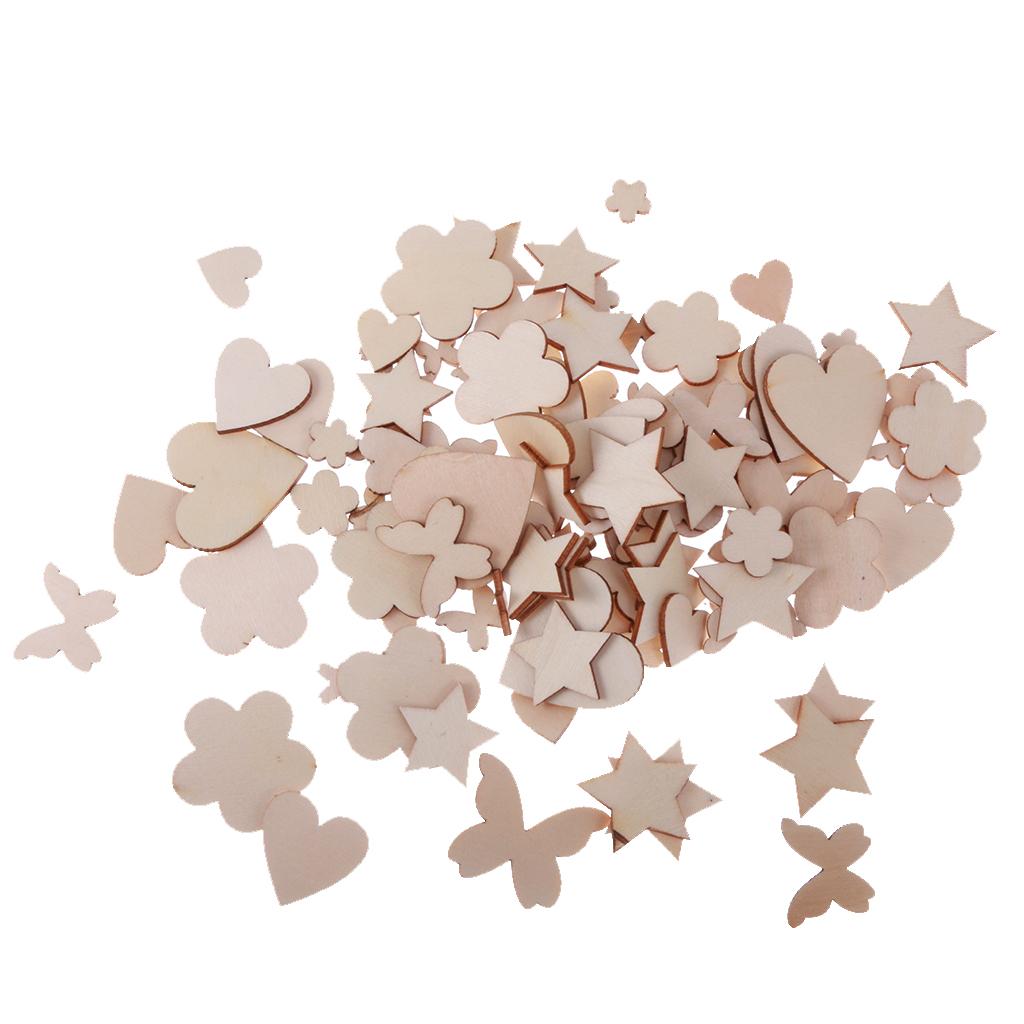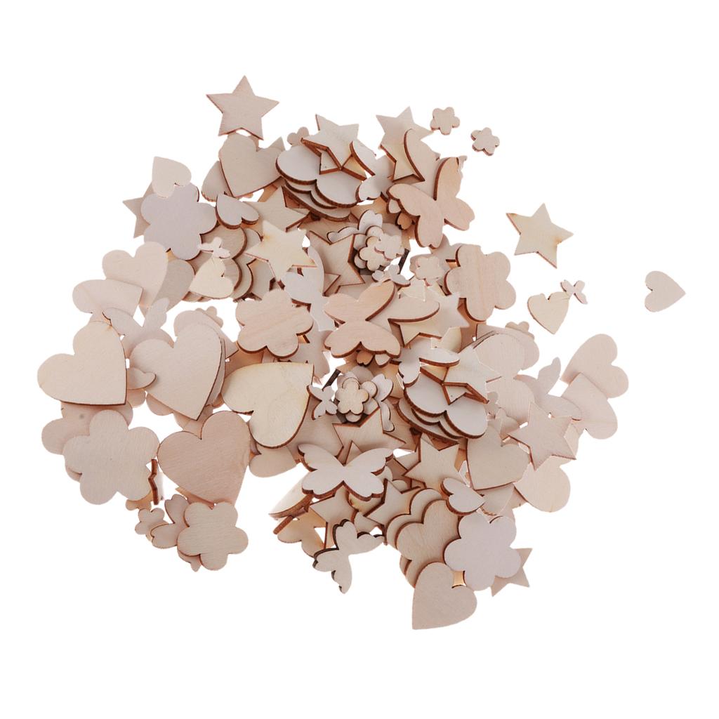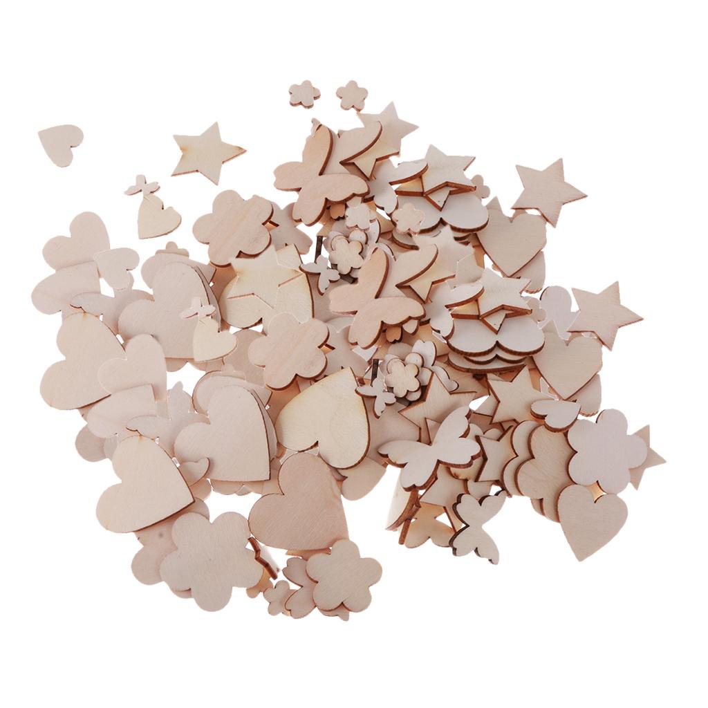 200Pcs Lots natural cutout wood embellishment crafts comes with star heart plum butterlfy shapes, assorted sizes meet all your needs.