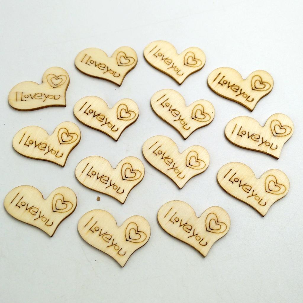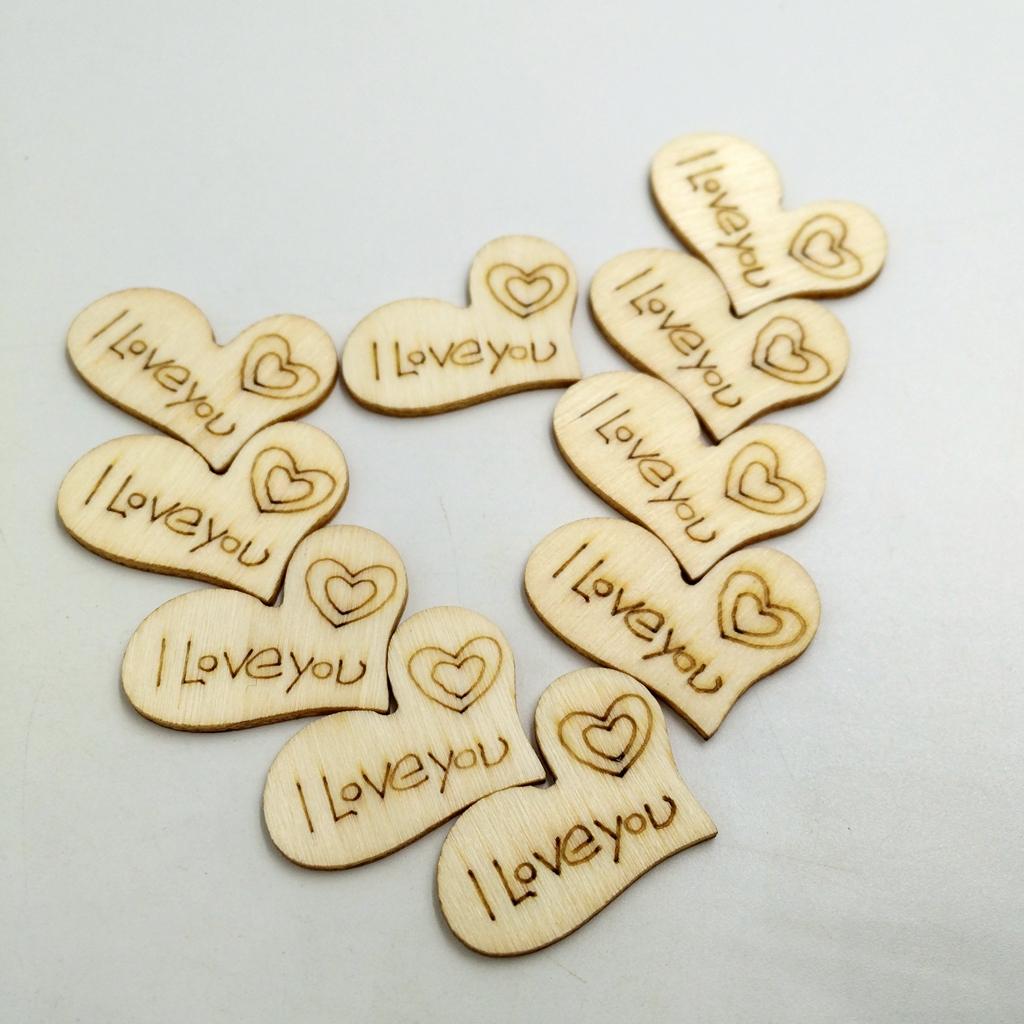 Very romantic shabby chic style heart-shaped wood slices with engraved "I Love you" & Heart pattern.