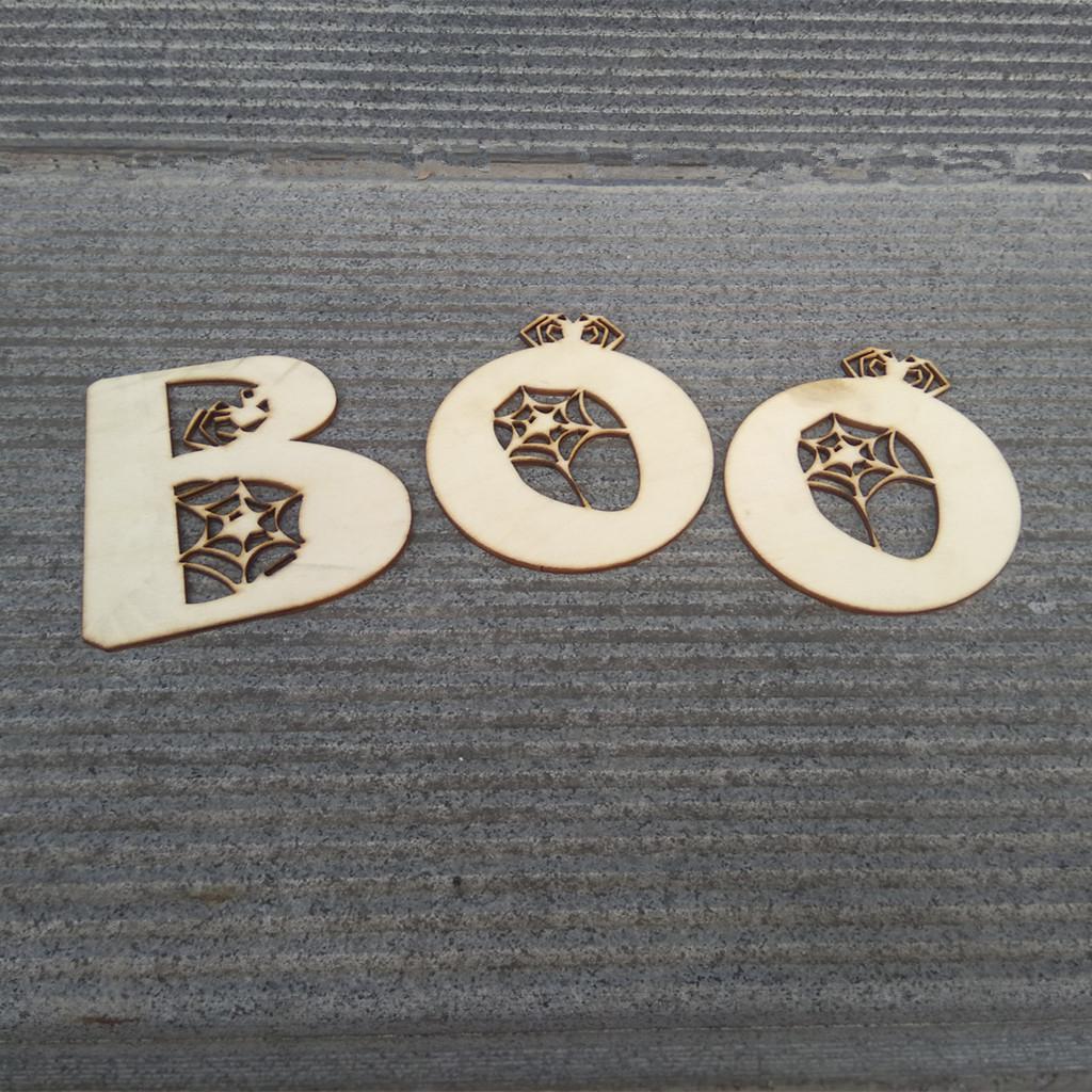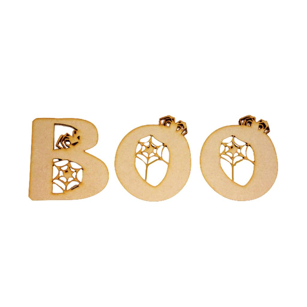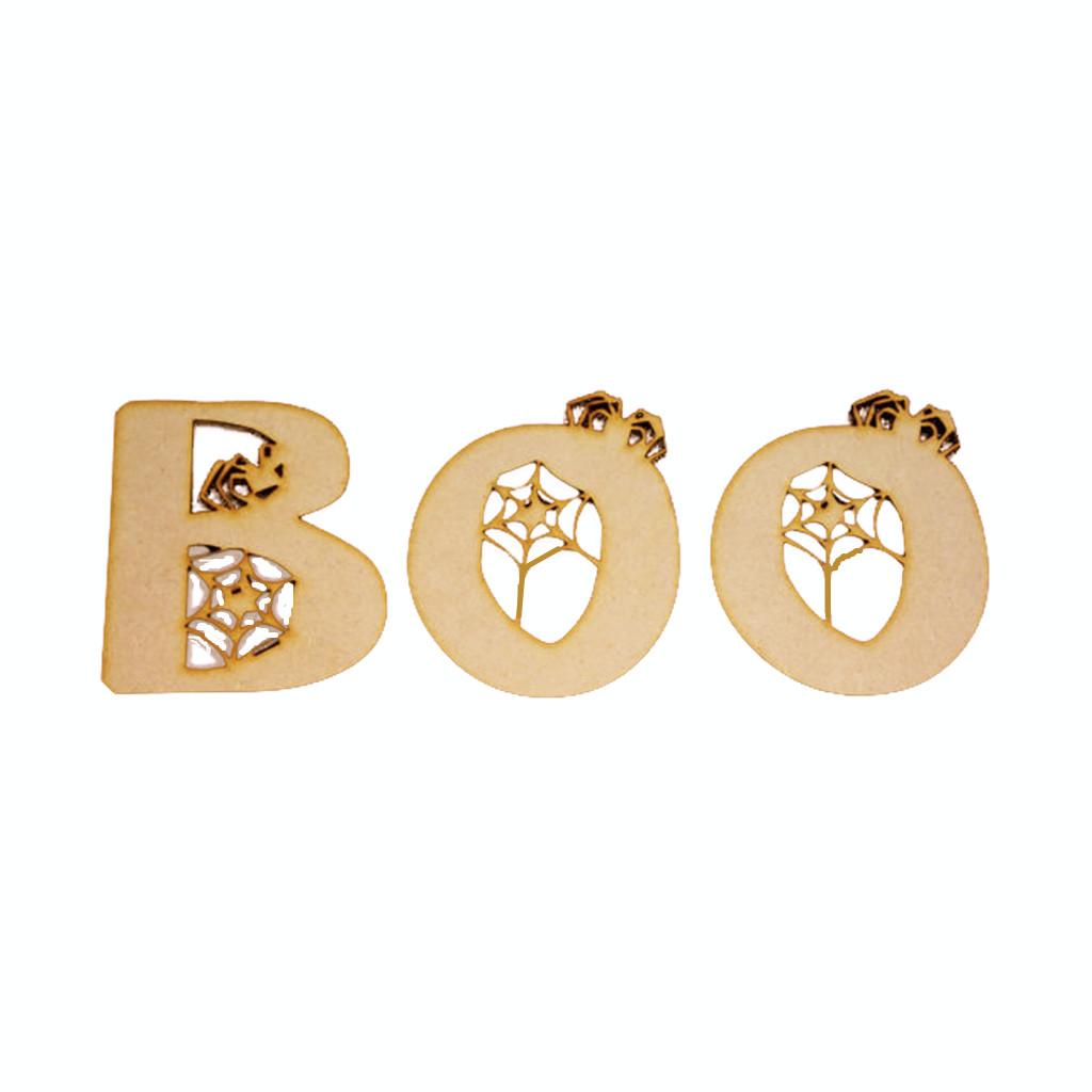 Plain unfinished cutout funny BOO with spider web cut hallowen embellishment.