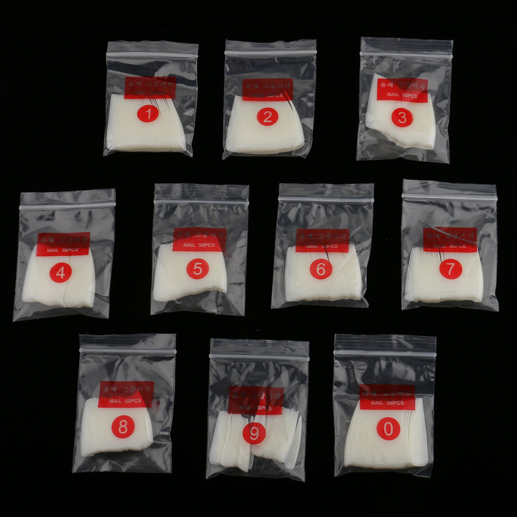 Total 500 tips, 10 sizes nail tips, each size with 50 tips.