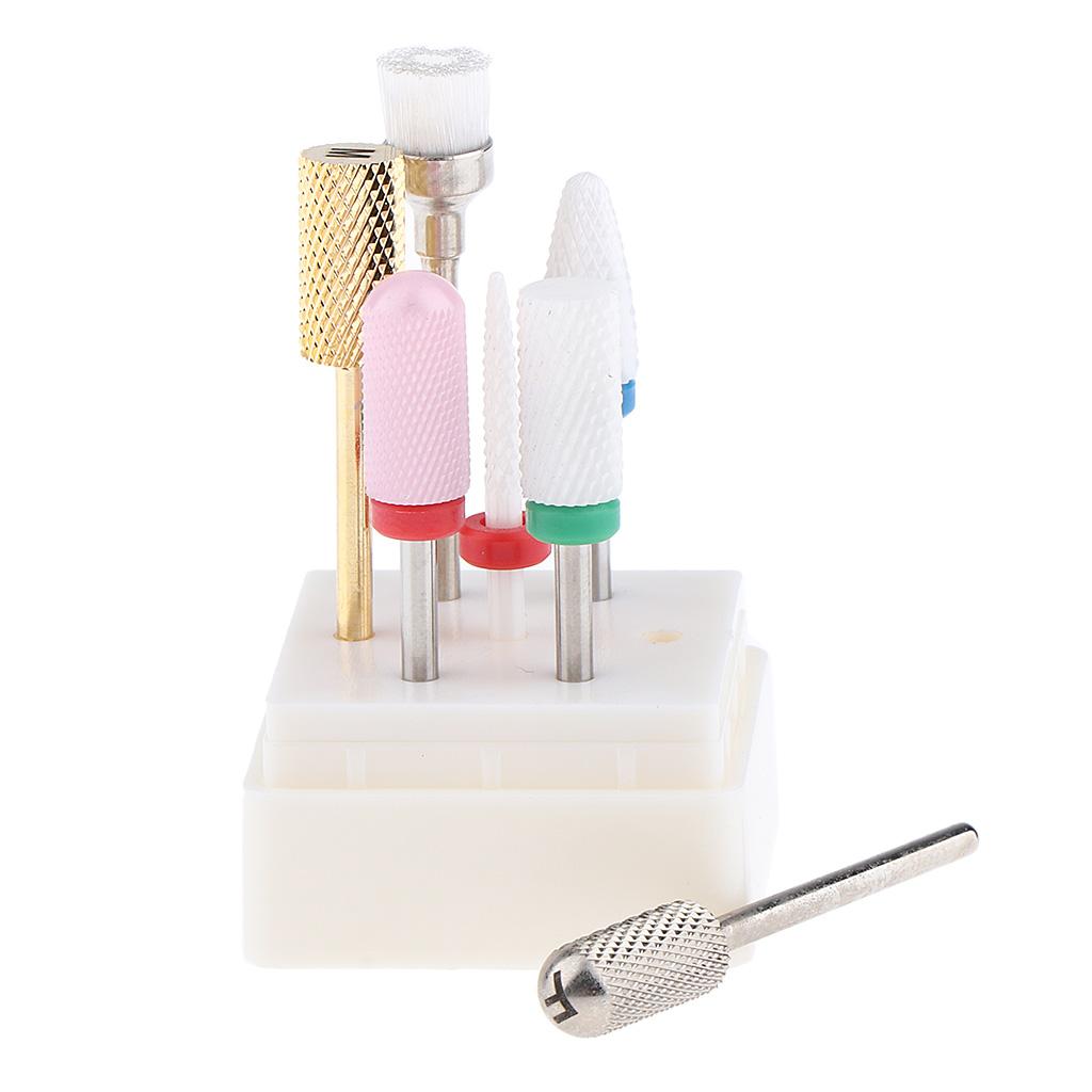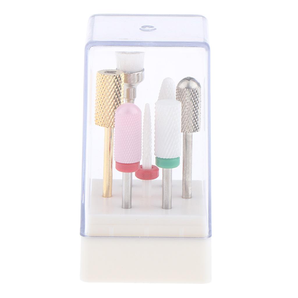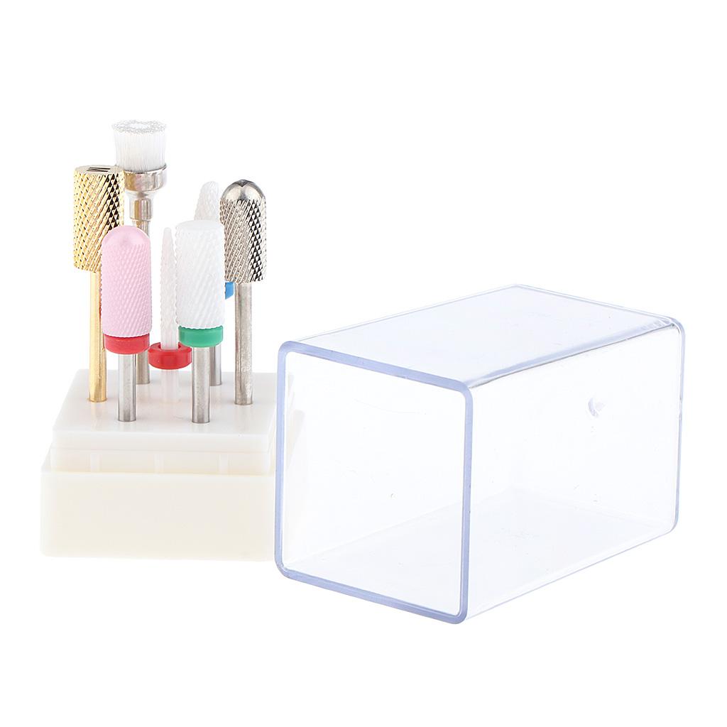 Set of 6 different nail drill bits and 1 cleasing brush, perfect 7-in-1 manicure tools kit.
