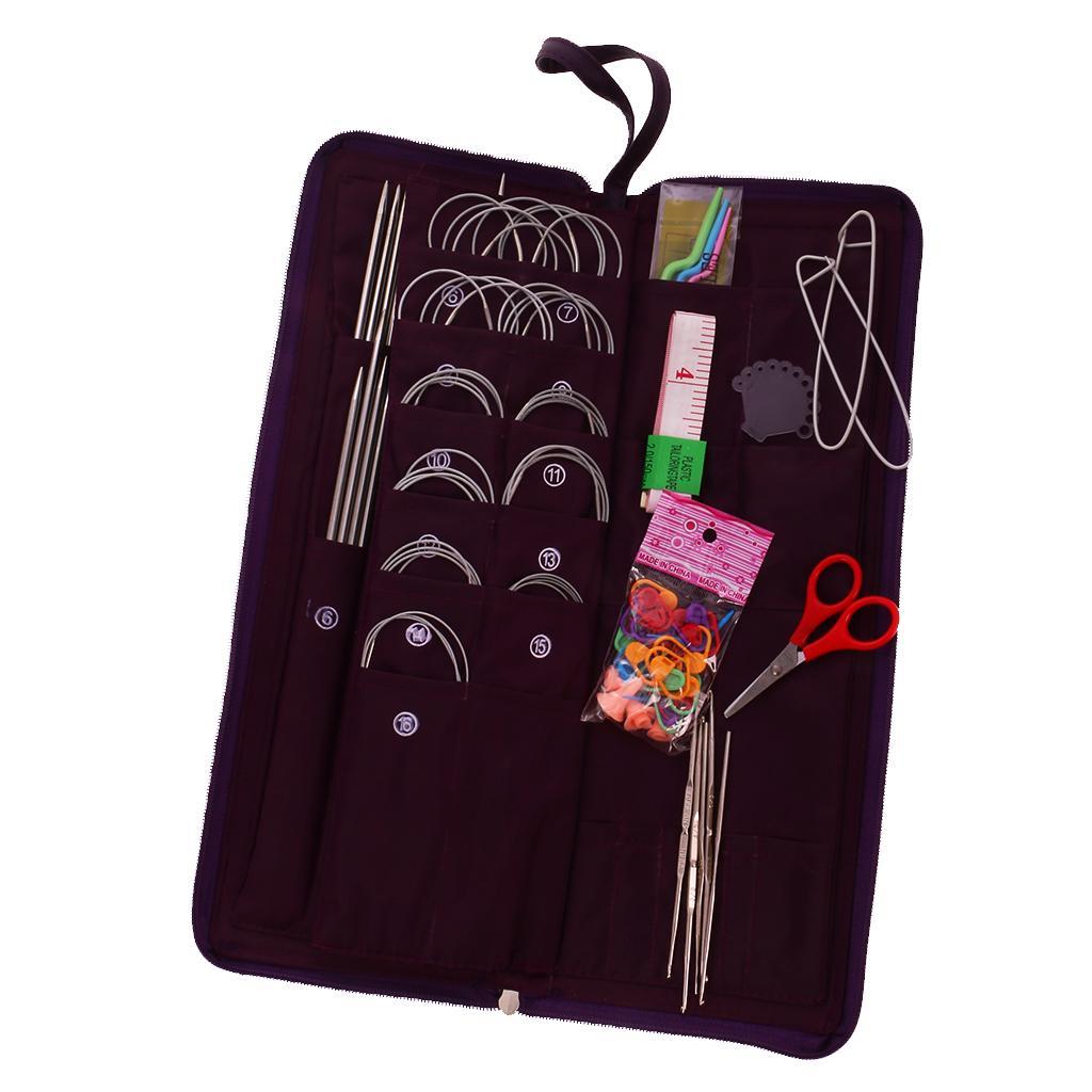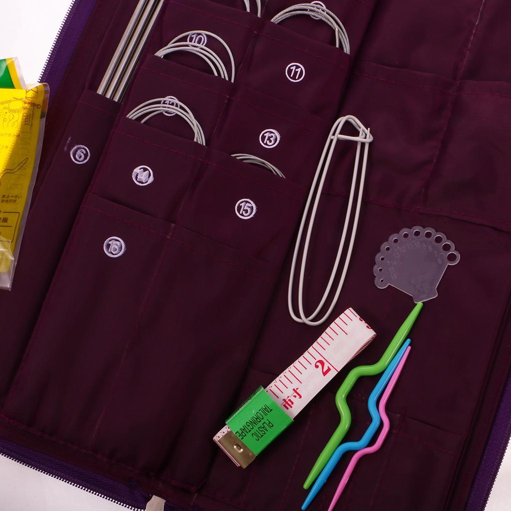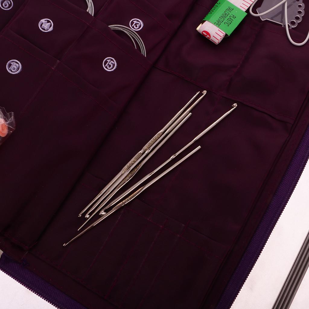 Package included16x36cm long needles,14x25cm needles,58x24cm needles,11x Circular needle,5xbearded needle,4x Plastic twist needle,1x tape measure,1x small scissors,1x plastic ruler gauge needle,2x Medium solution buttons,18x Small numbermarkers,4x Needle caps