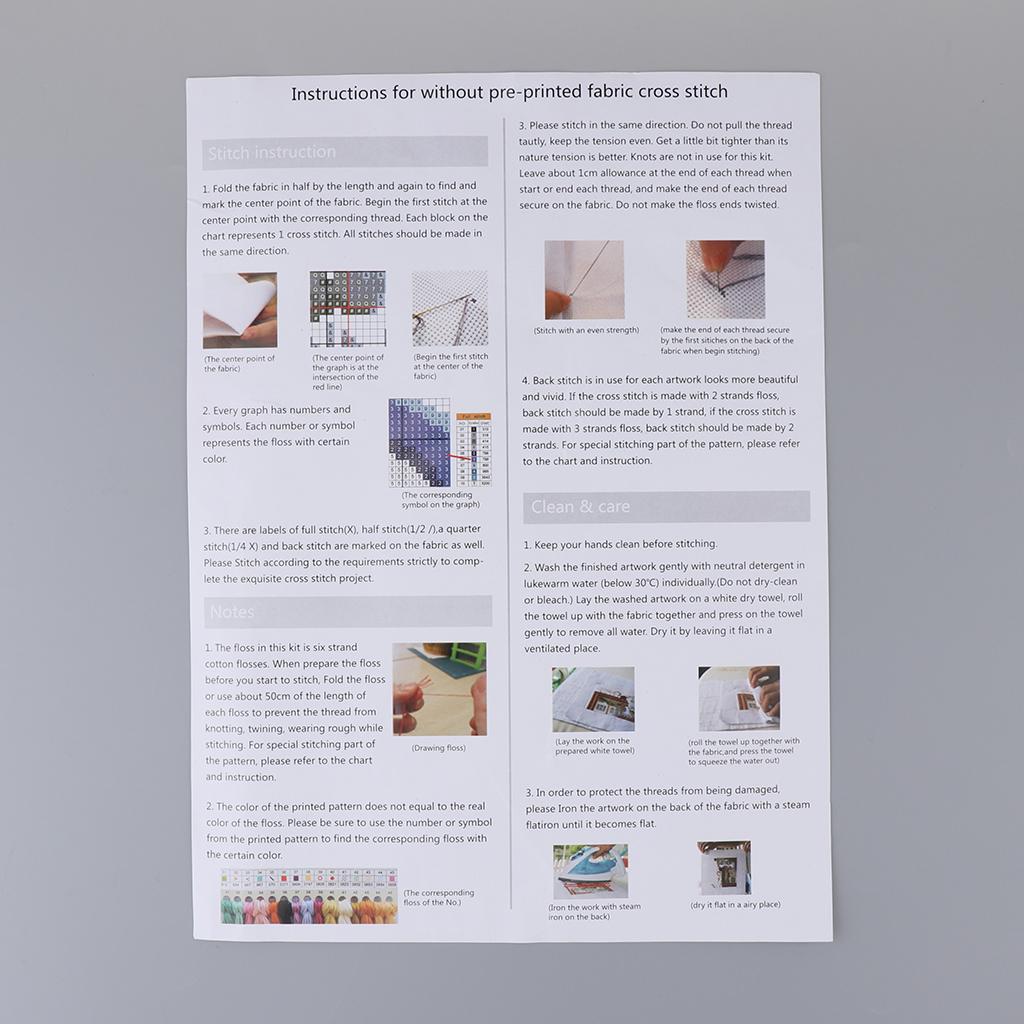 Package includes: embroidery cloth, pre-sorted thread, 2 needles, instructions and drawings.