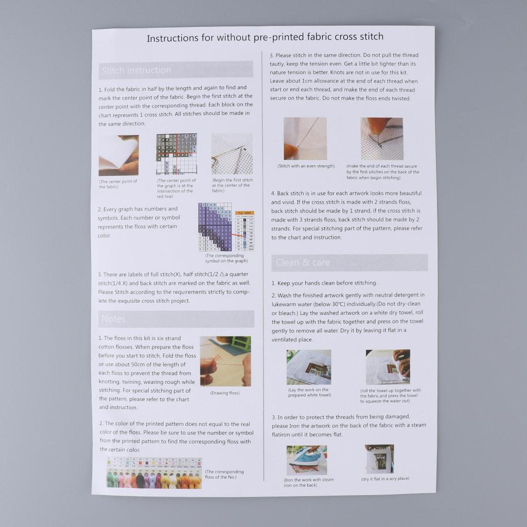 Package includes: embroidery cloth, pre-sorted thread, 2 needles, instructions and drawings.