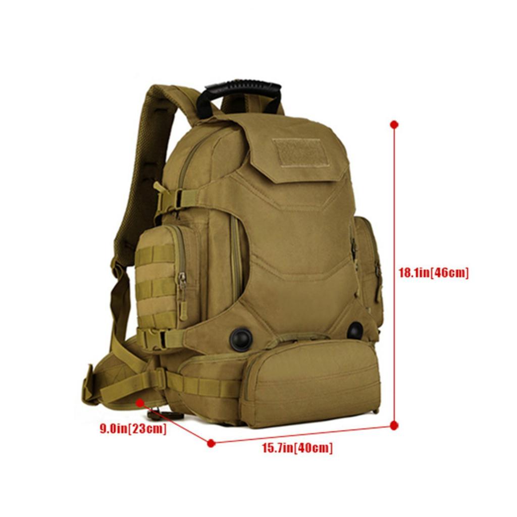 40L Large Capacity - One roomy main pocket, one zipped front pocket, one detachable waist pack, two zippered side pockets (you can put 14 inch laptop or A4 magazine into the main pocket)