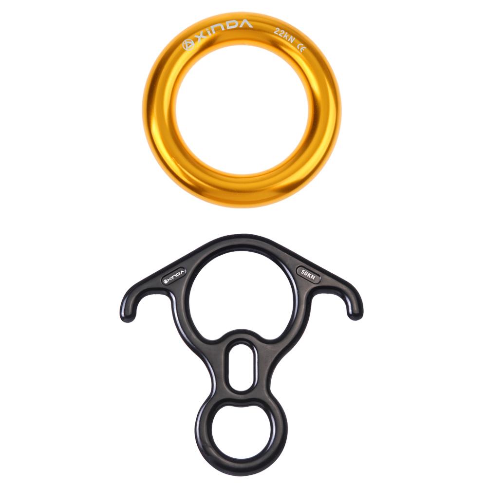 1 Set of 8 Shape 50KN Climbing Descender (Black) + 22KN Rappel Ring (Gold)