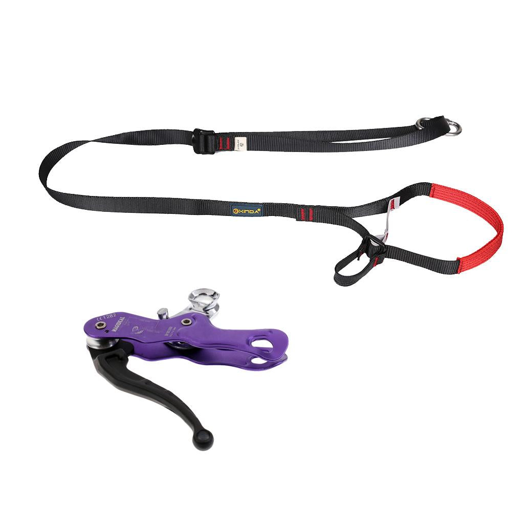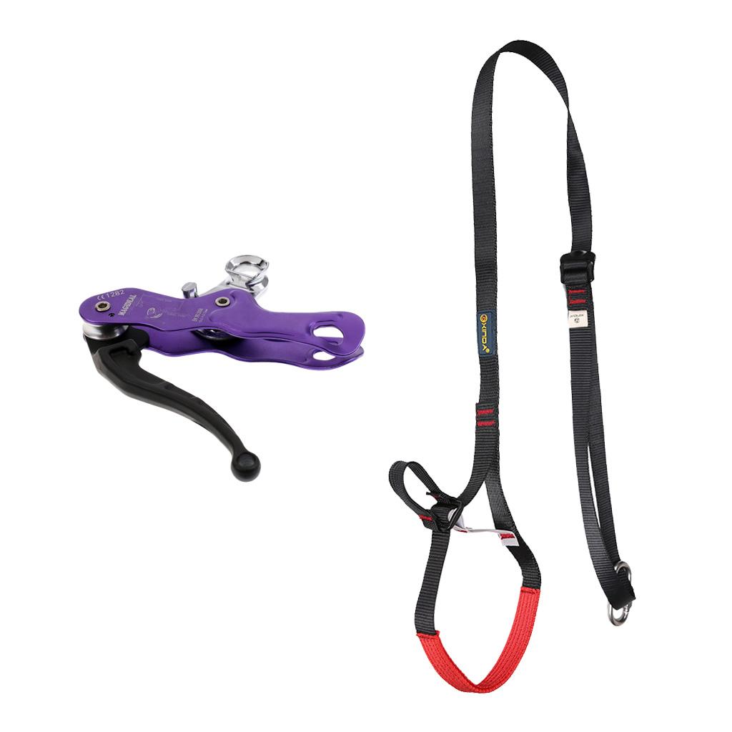 Double lock self braking stop descender with foot loop ascender webbing strap