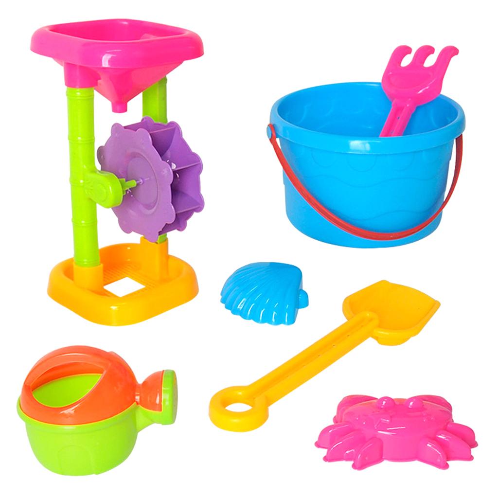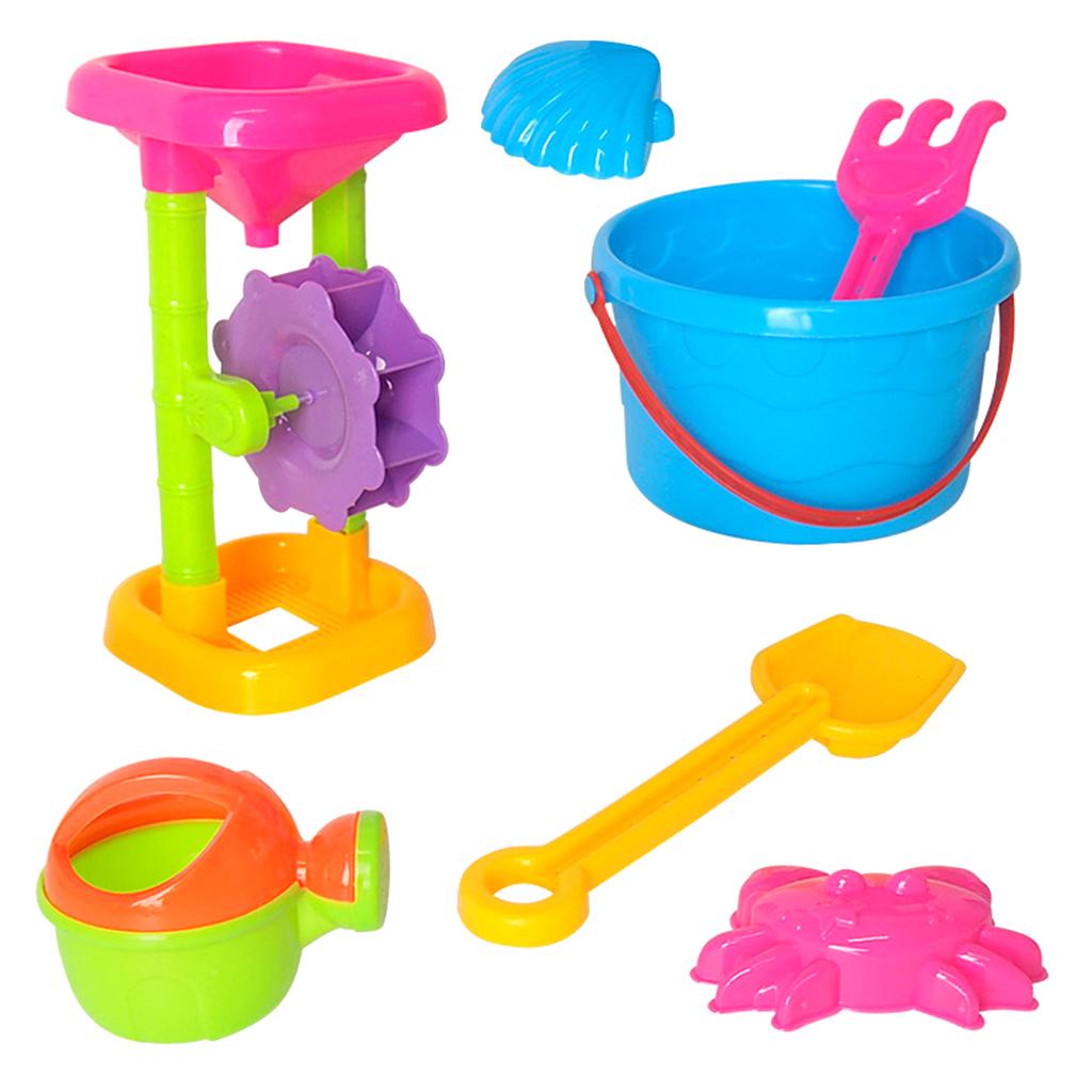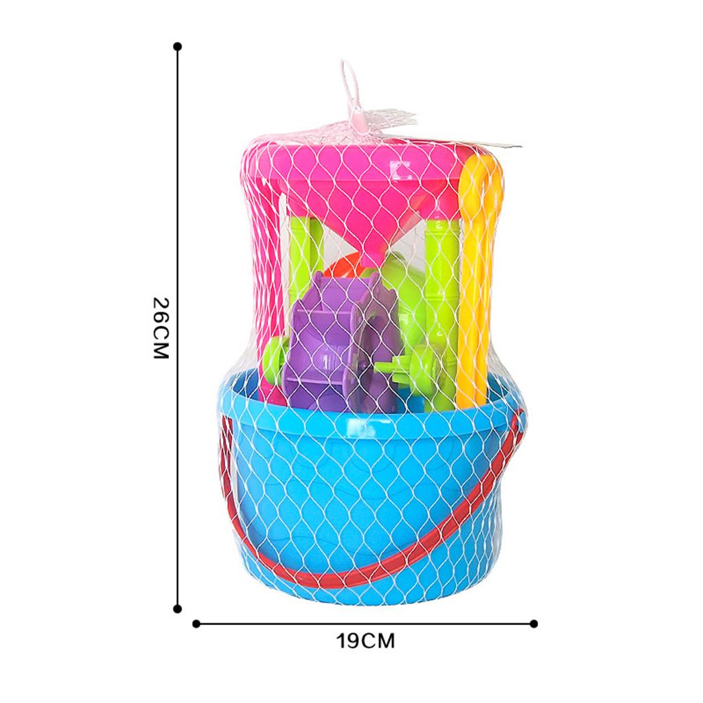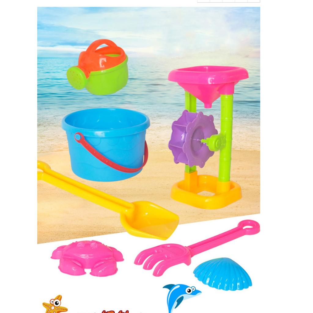 Includes 1x sand wheel, 1x bucket, 1x sand shovel, 1x sand rake, 1x watering can, 2x sea animal shape molds (The shape of molds will be random)