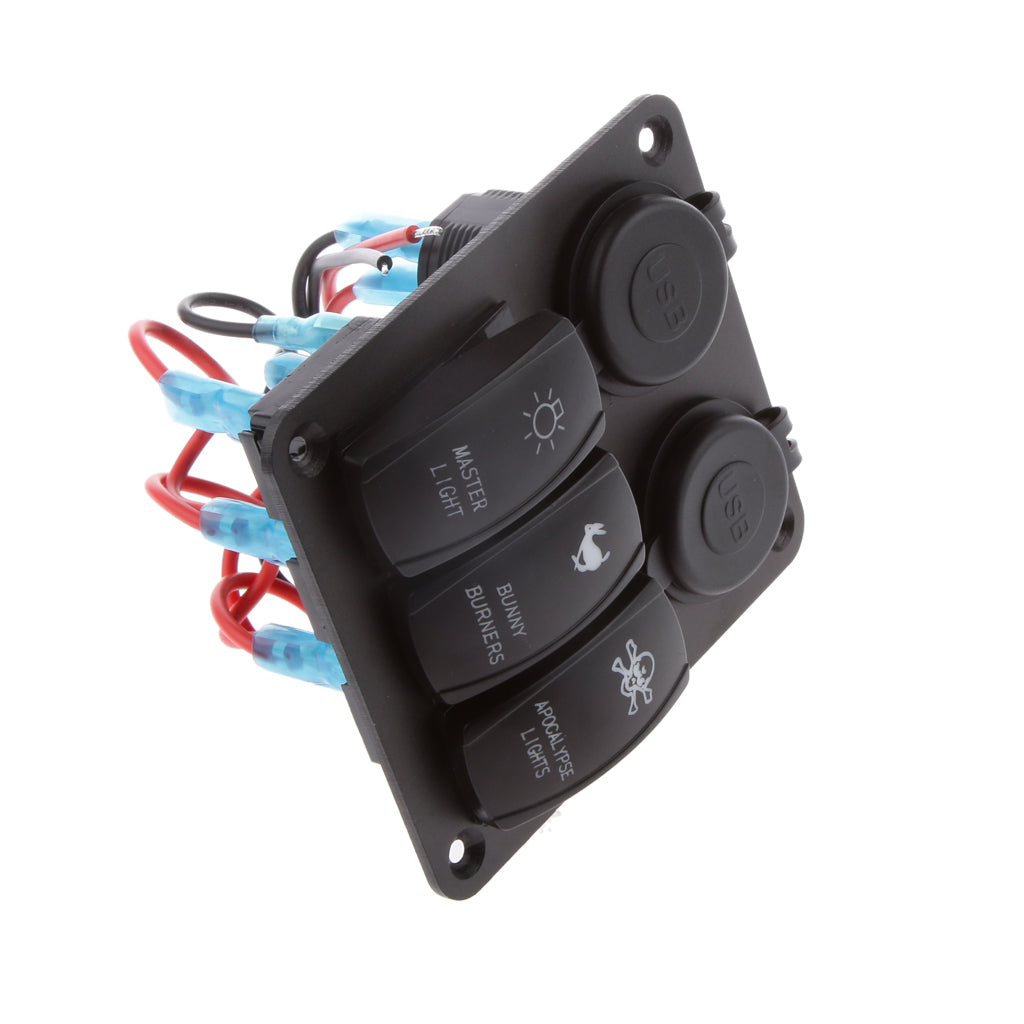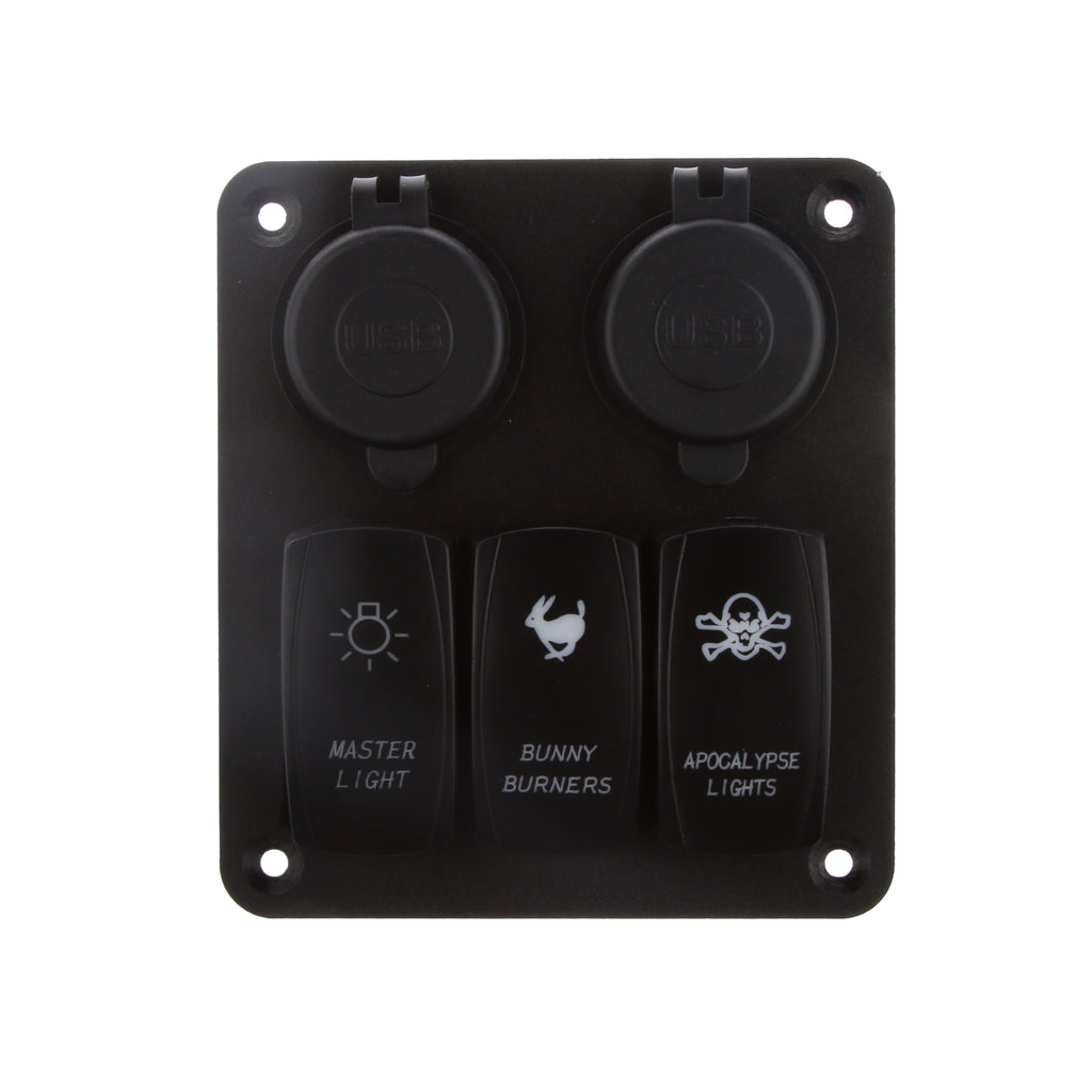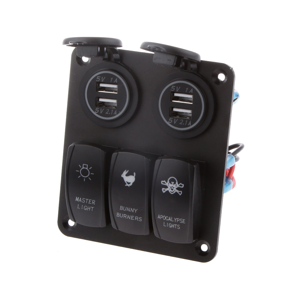 3 Gang Rocker Switch Panel Breaker Blue LED Car Marine Boat Circuit Waterproof 4 USB Charger Port