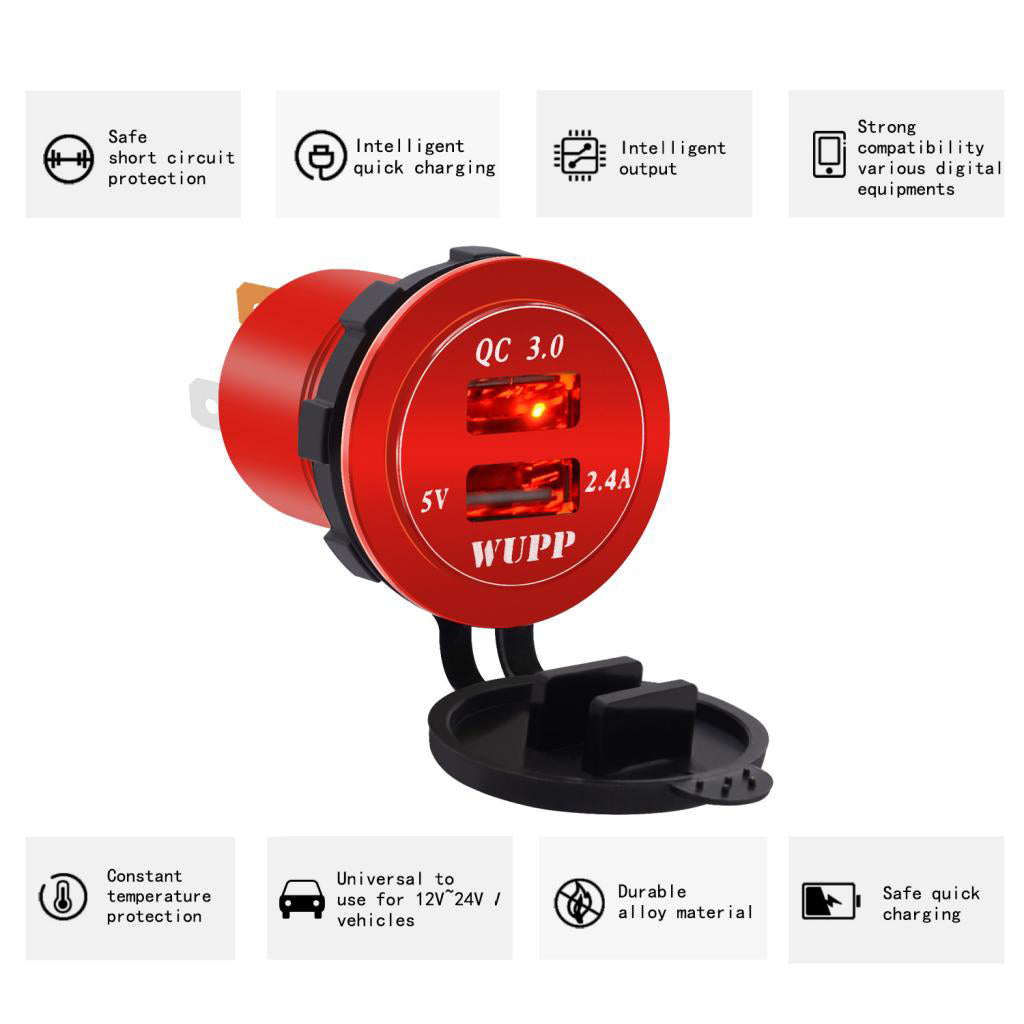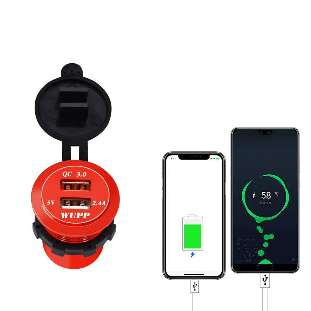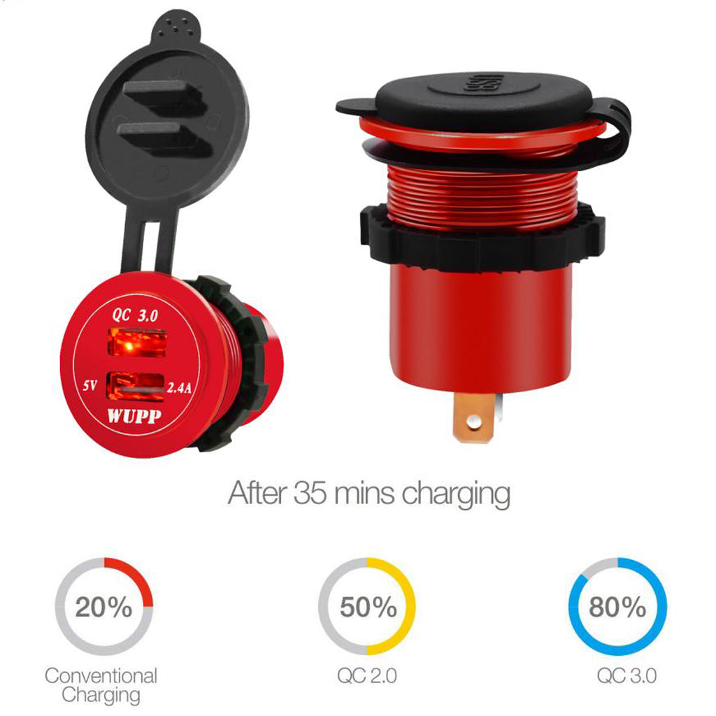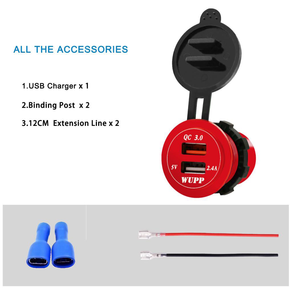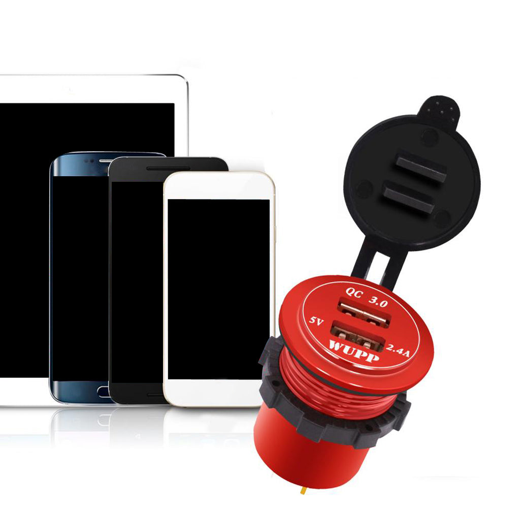 The main car charger is equipped with 5V, 2.4A ports, and an extended charger with Quick Charge 3.0.