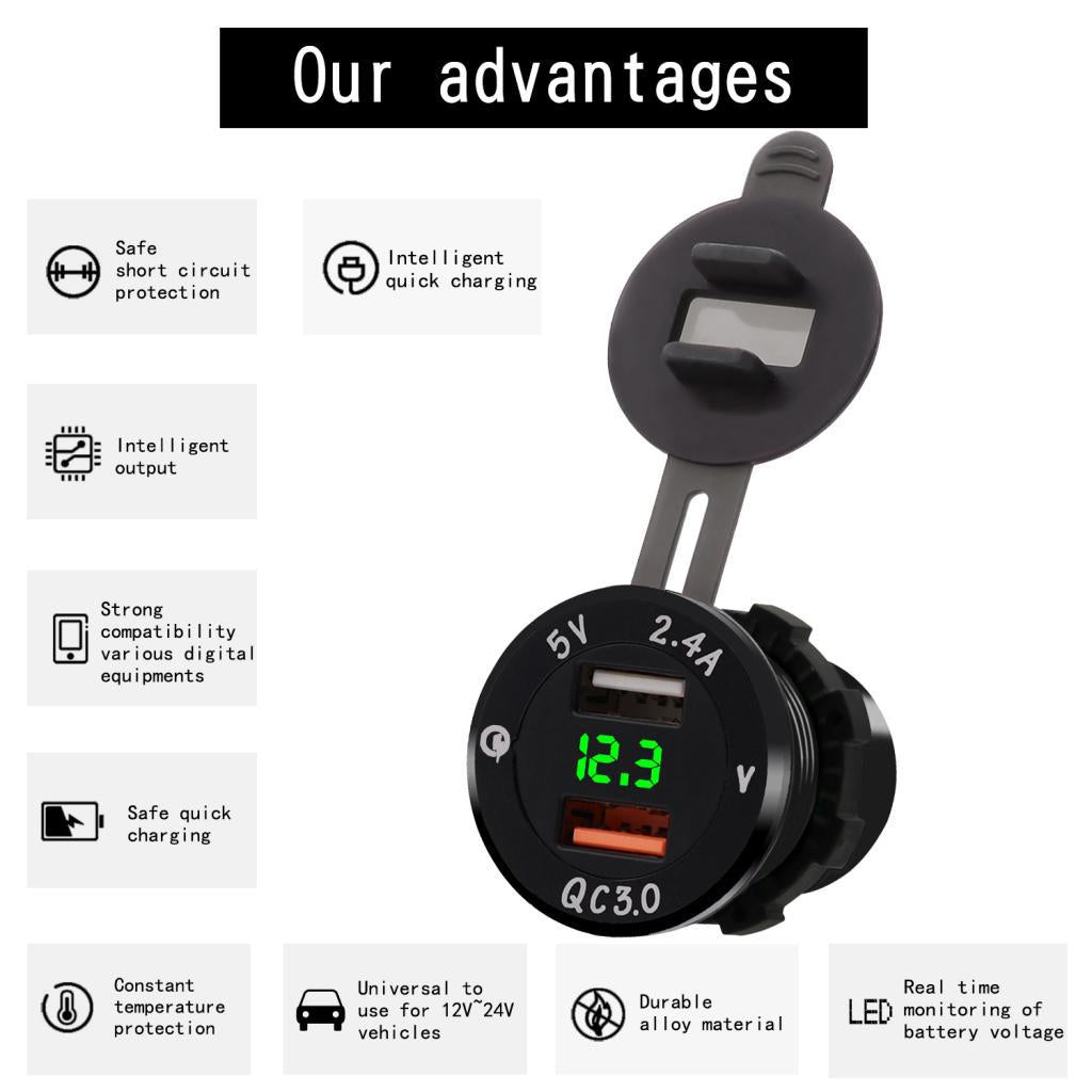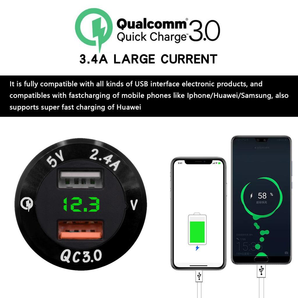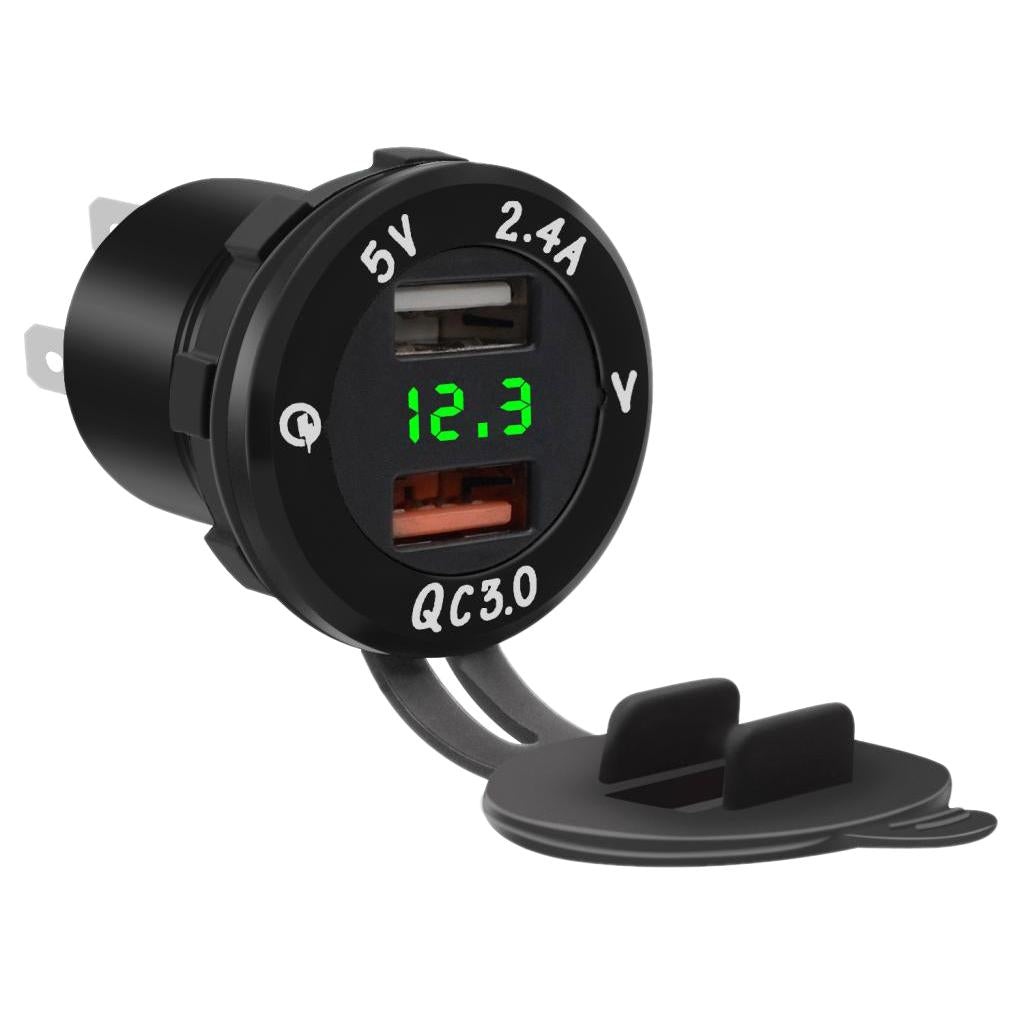 The main car charger is equipped with 5V, 2.4A ports, and an extended charger with Quick Charge 3.0.