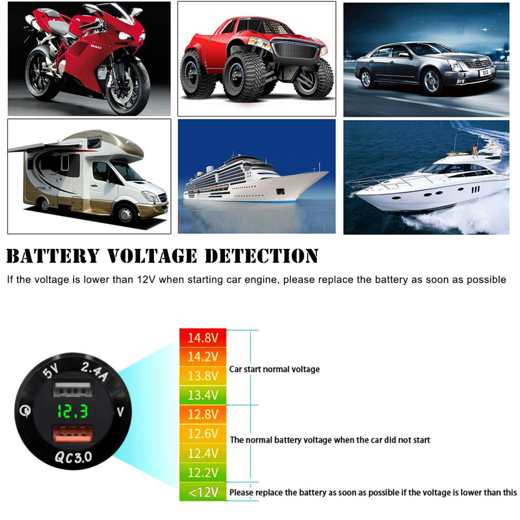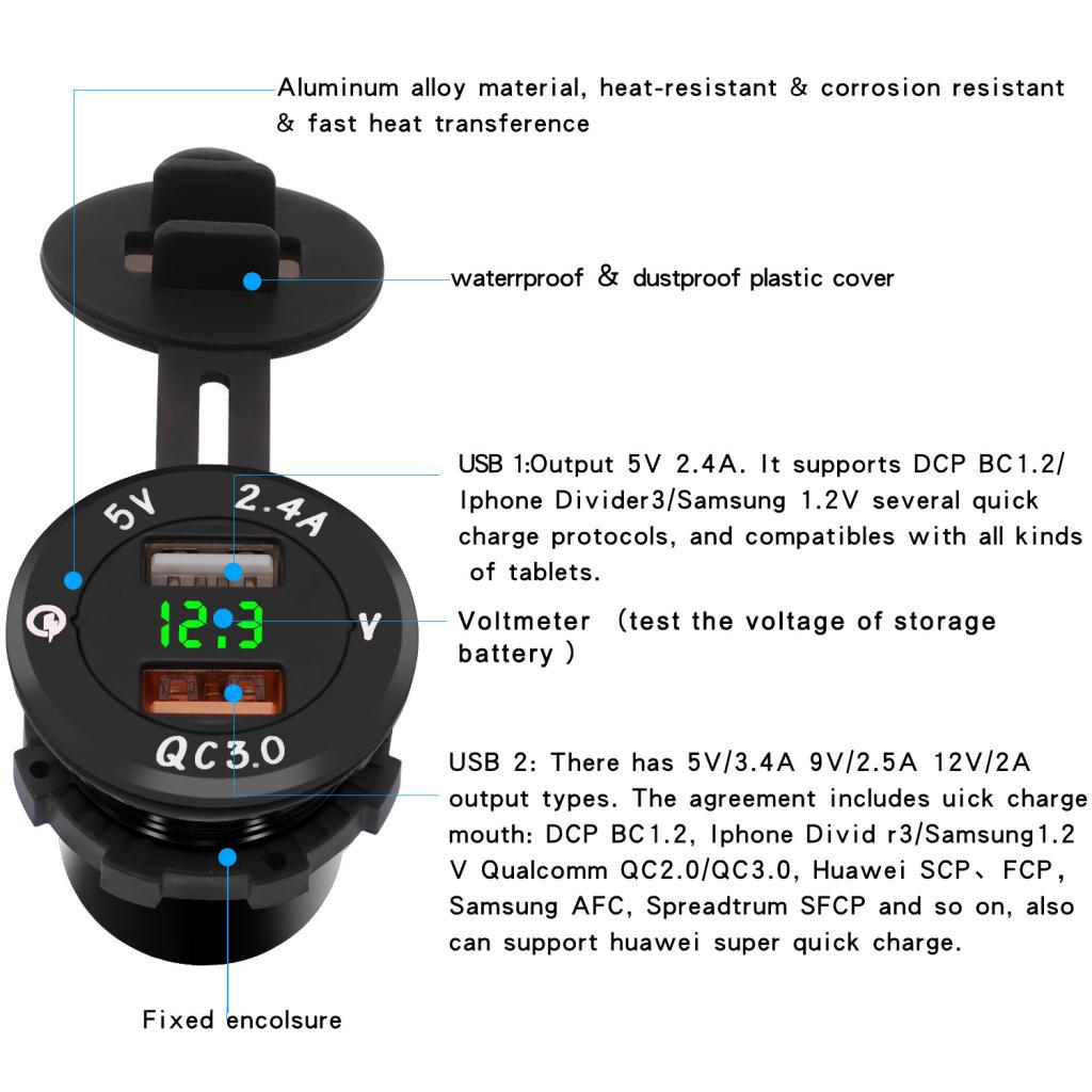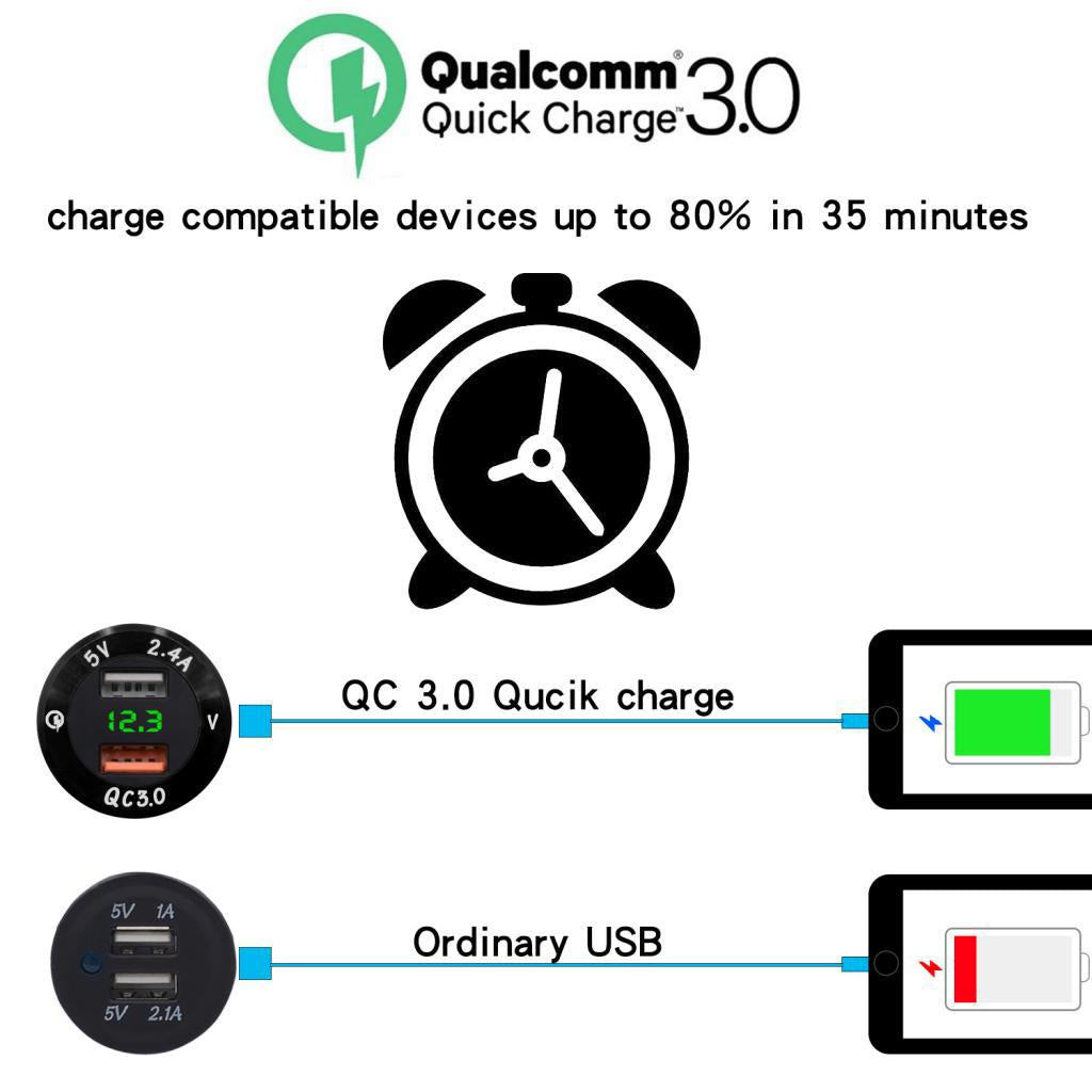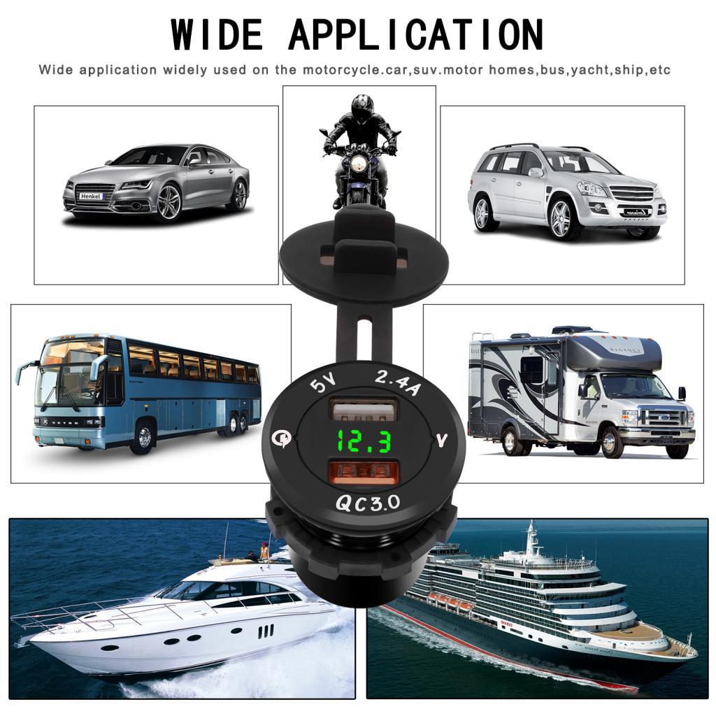 The main car charger is equipped with 5V, 2.4A ports, and an extended charger with Quick Charge 3.0.