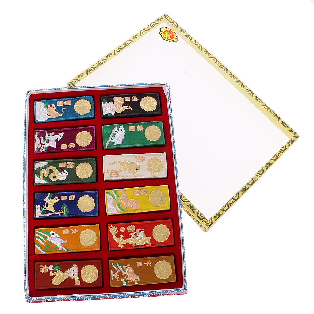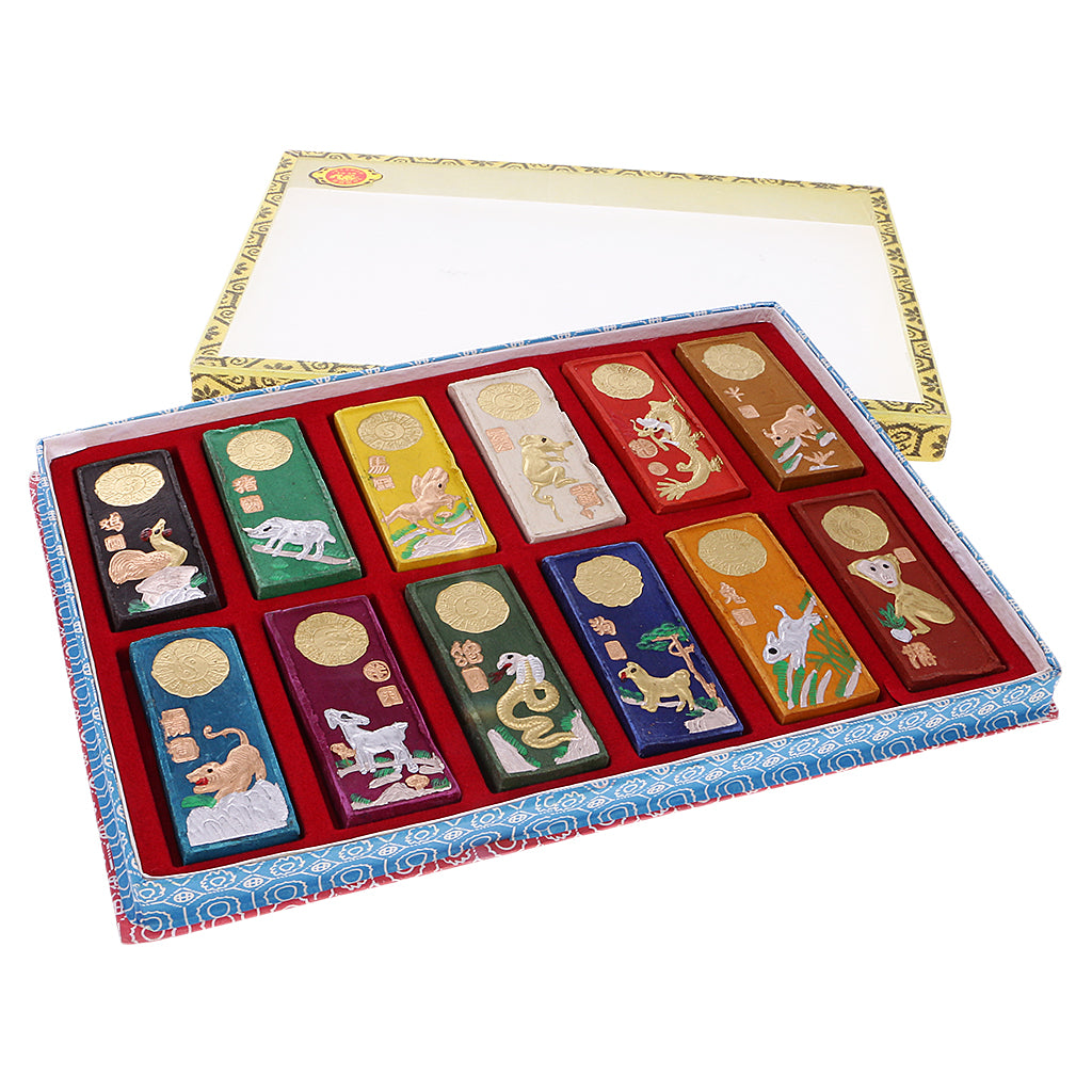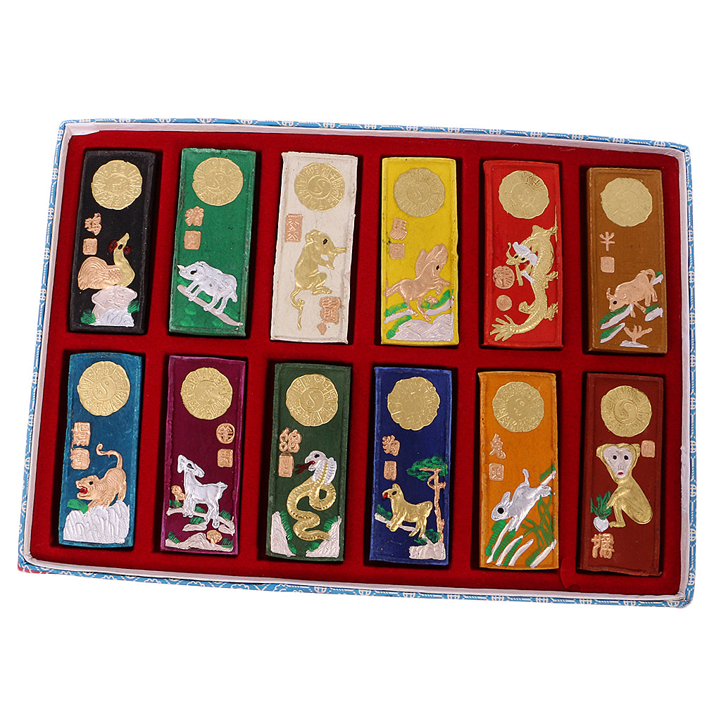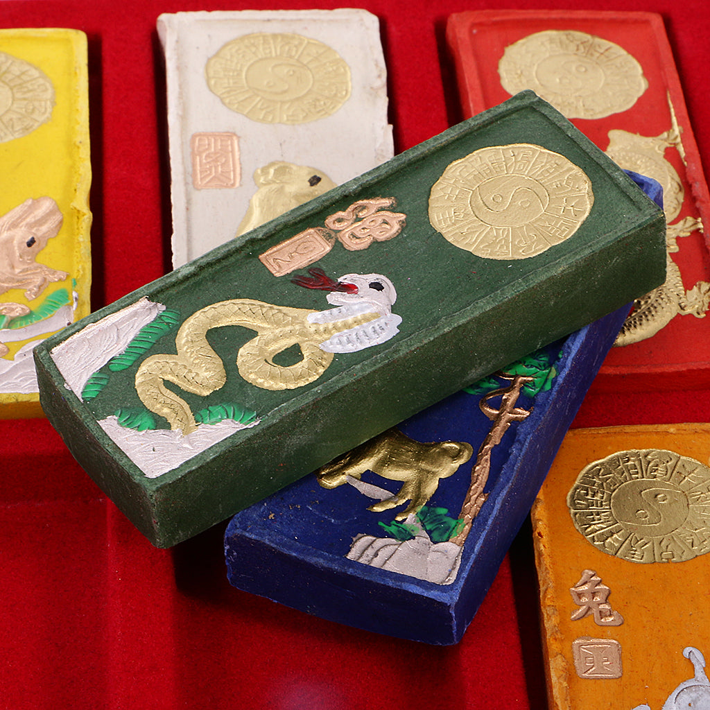 Asia Old 7 Colors Carved Zodiac Chinese Calligraphy Painting Ink Stick