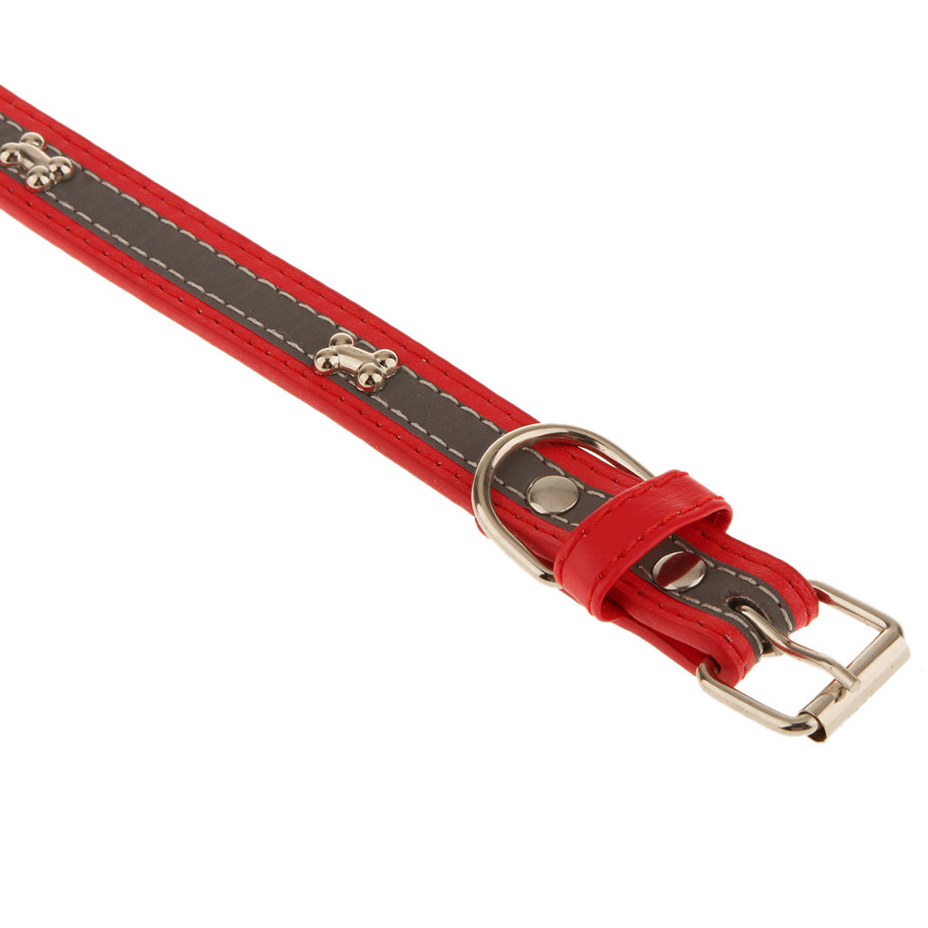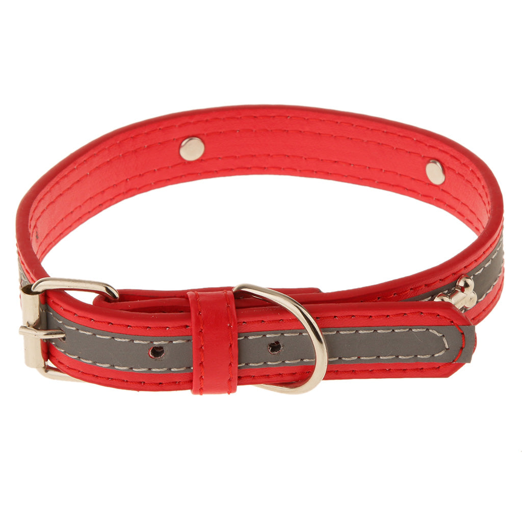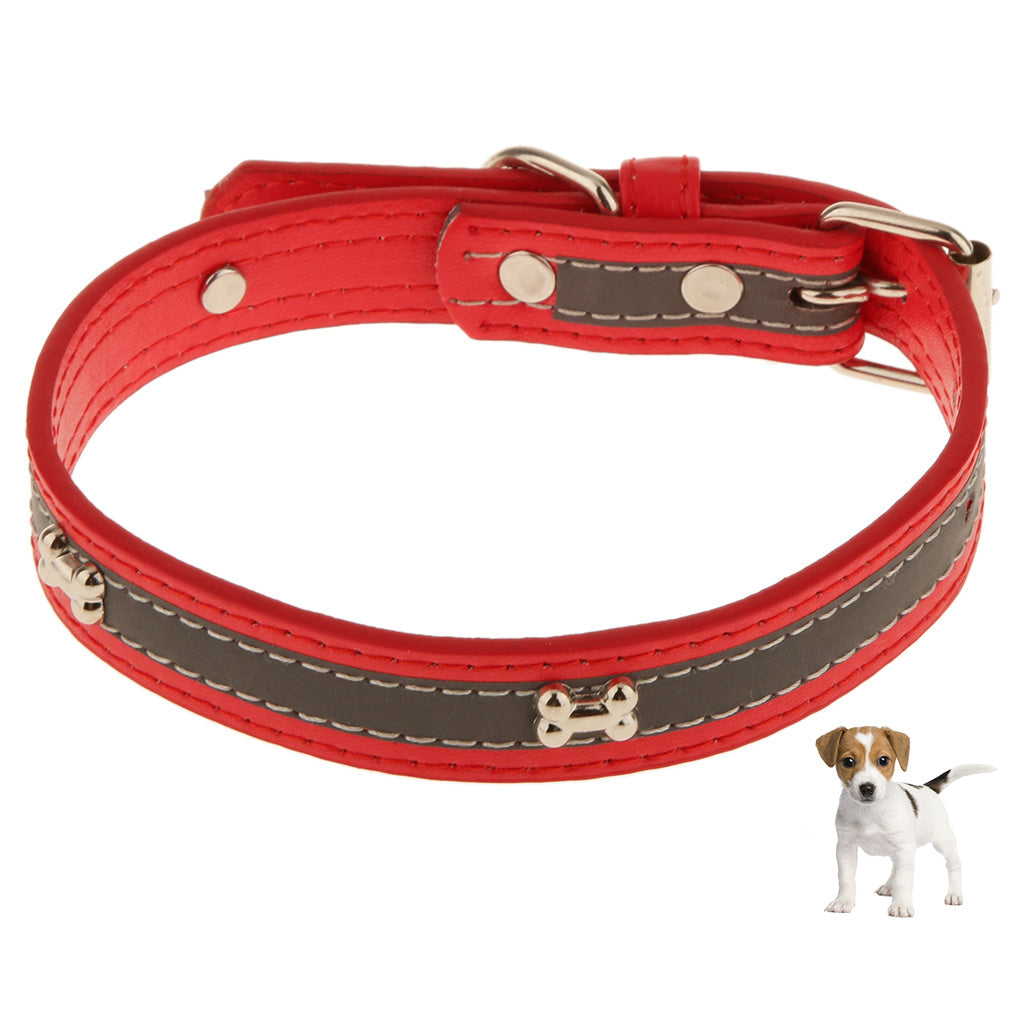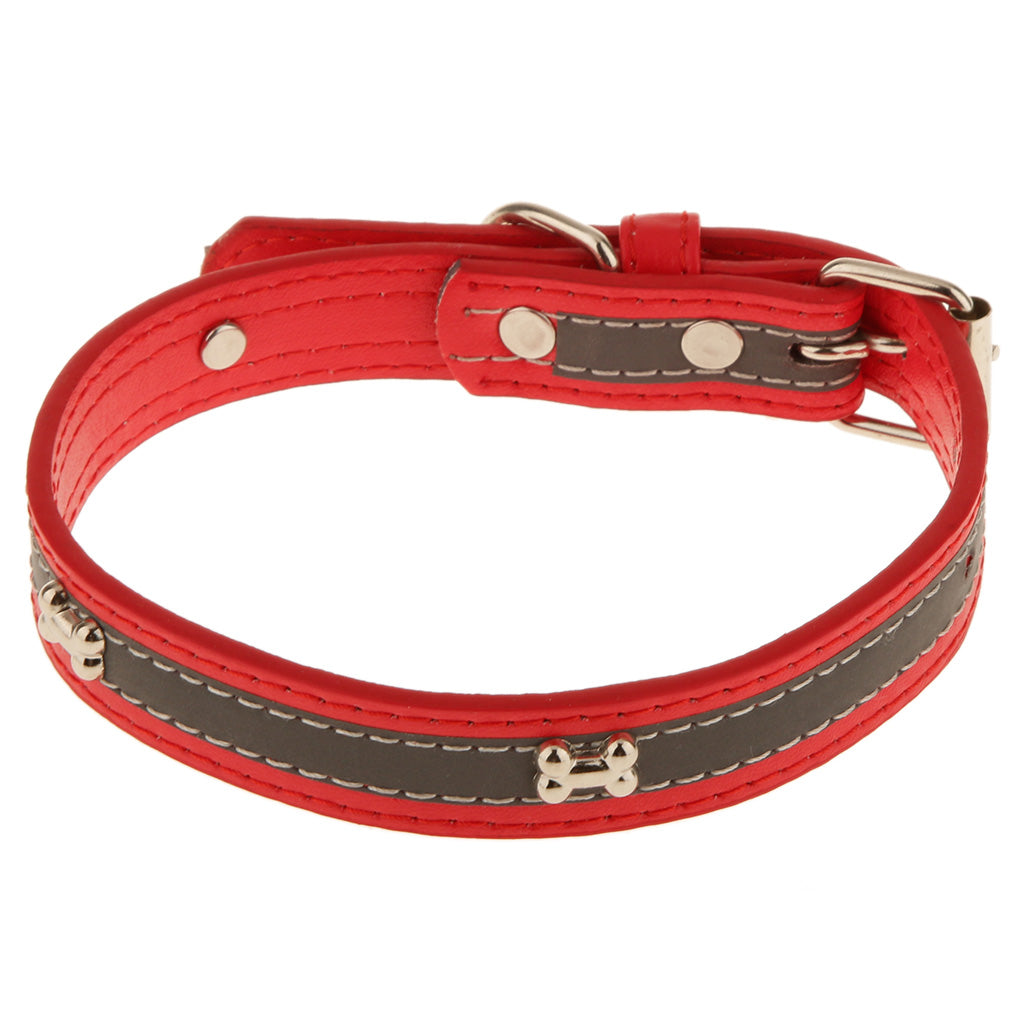 Adjustable Puppy PU Leather Bone Reflective Safety Buckle Dog Collar-Red