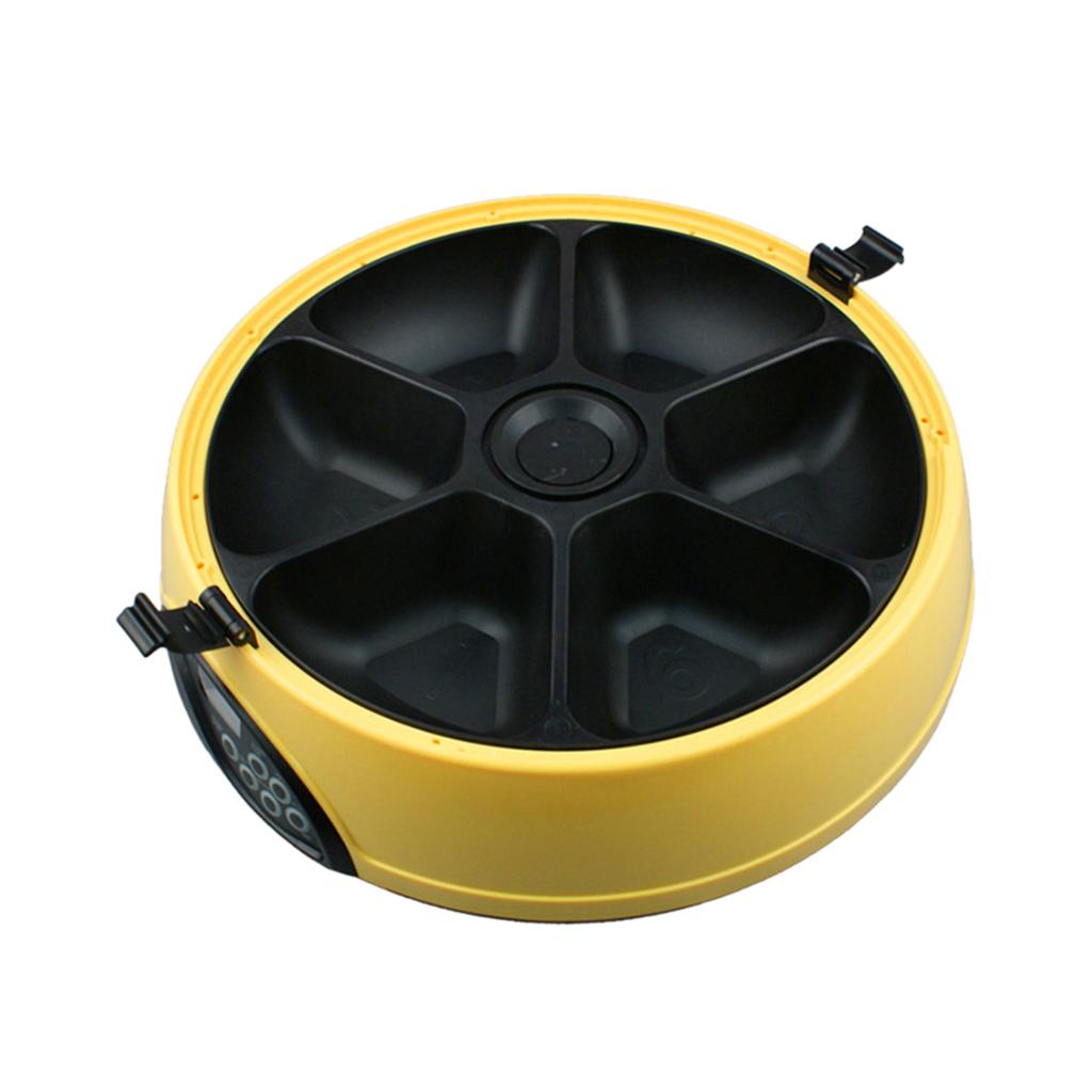 6 compartments (6 x 150g) for use with dry, packaged moist and wet food (or even Treats & Medication). Removable cover and food tray, easy to clean (dishwasher safe). It also has built-in water sink, can solve the problem that pets drinking water.