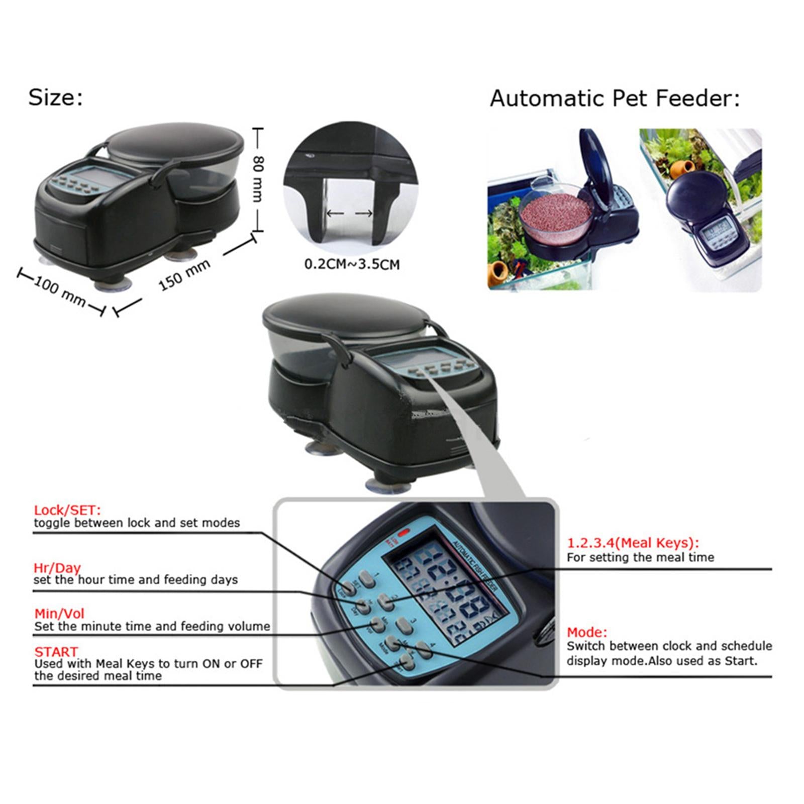 The capacity of feeder is 80g, 1-9g per meal. You can set the number of meals and time per day (only set the whole point of time), the least is 1 VOL, while the most is 9 VOL. Feed time is up to is 4 times a day. The maximum can be set to 99 days.
