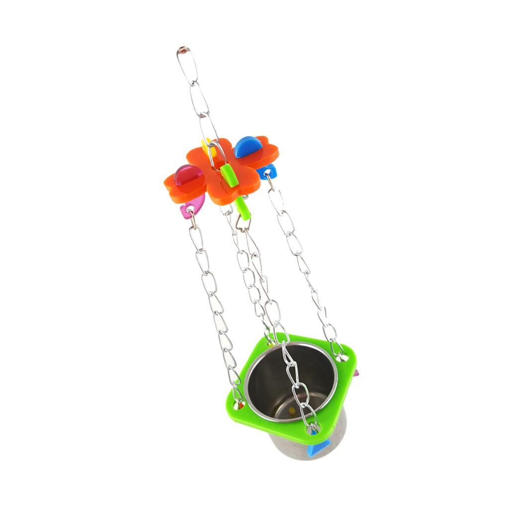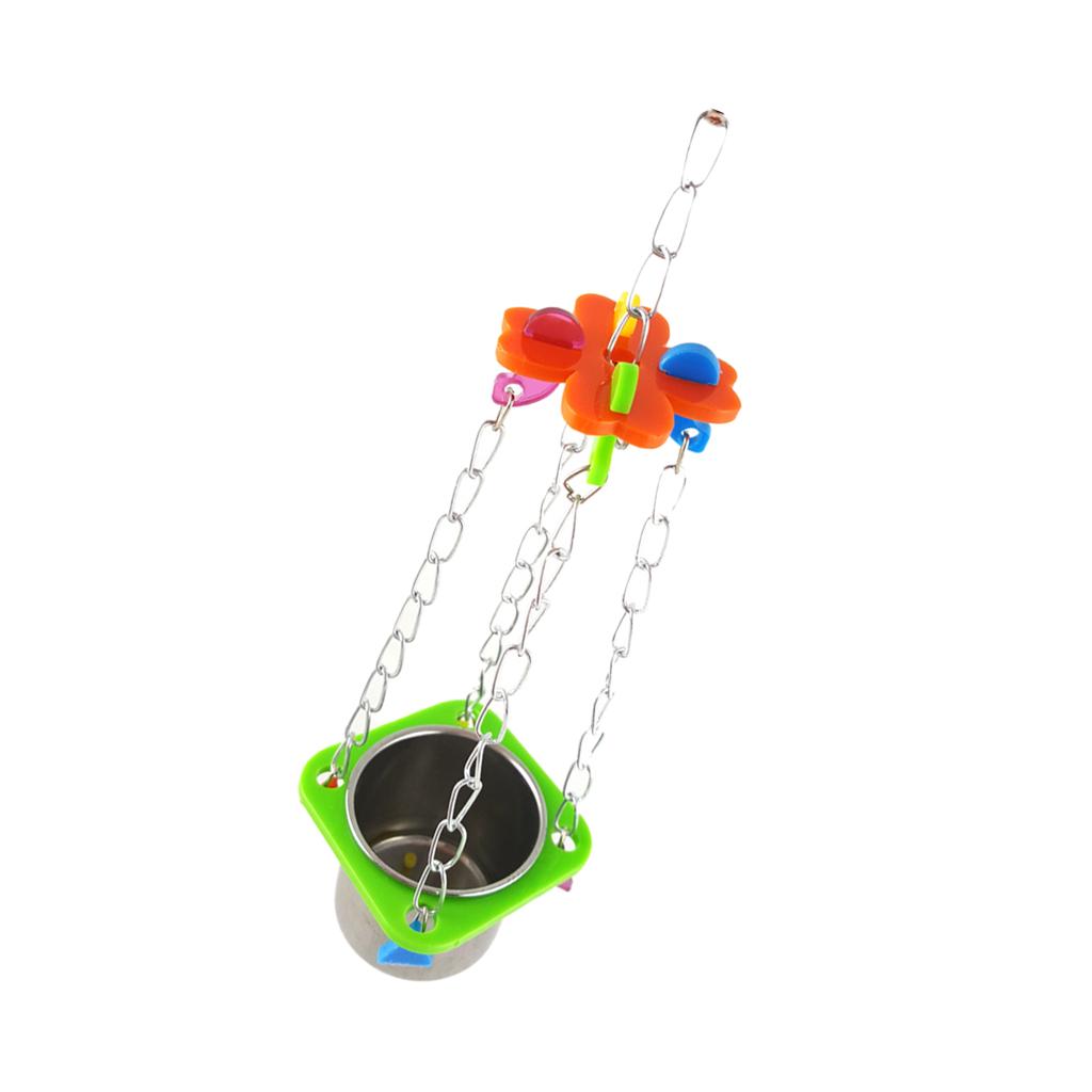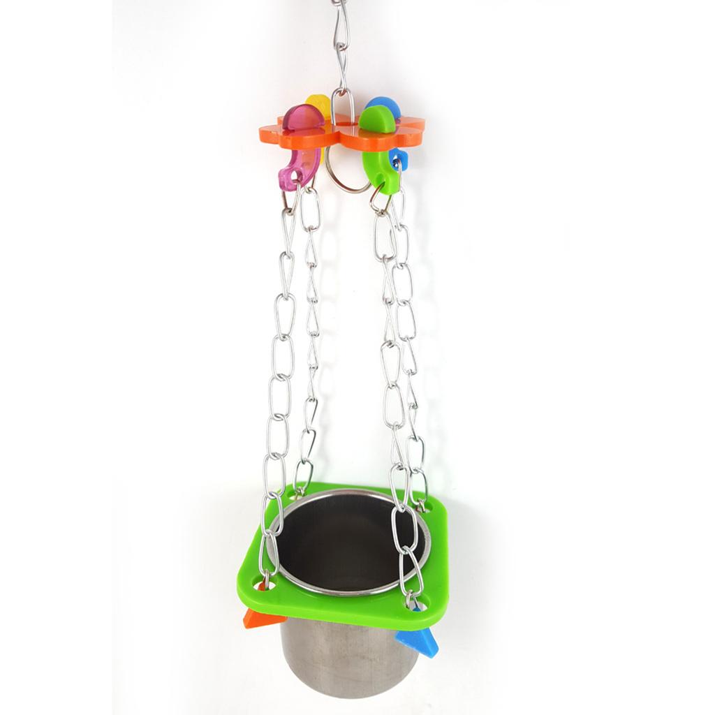 Muti-purppse design--with the stainless steel cup it is a food or water tray for your pets; when you take off the cup, it becomes a colorful swing toy.