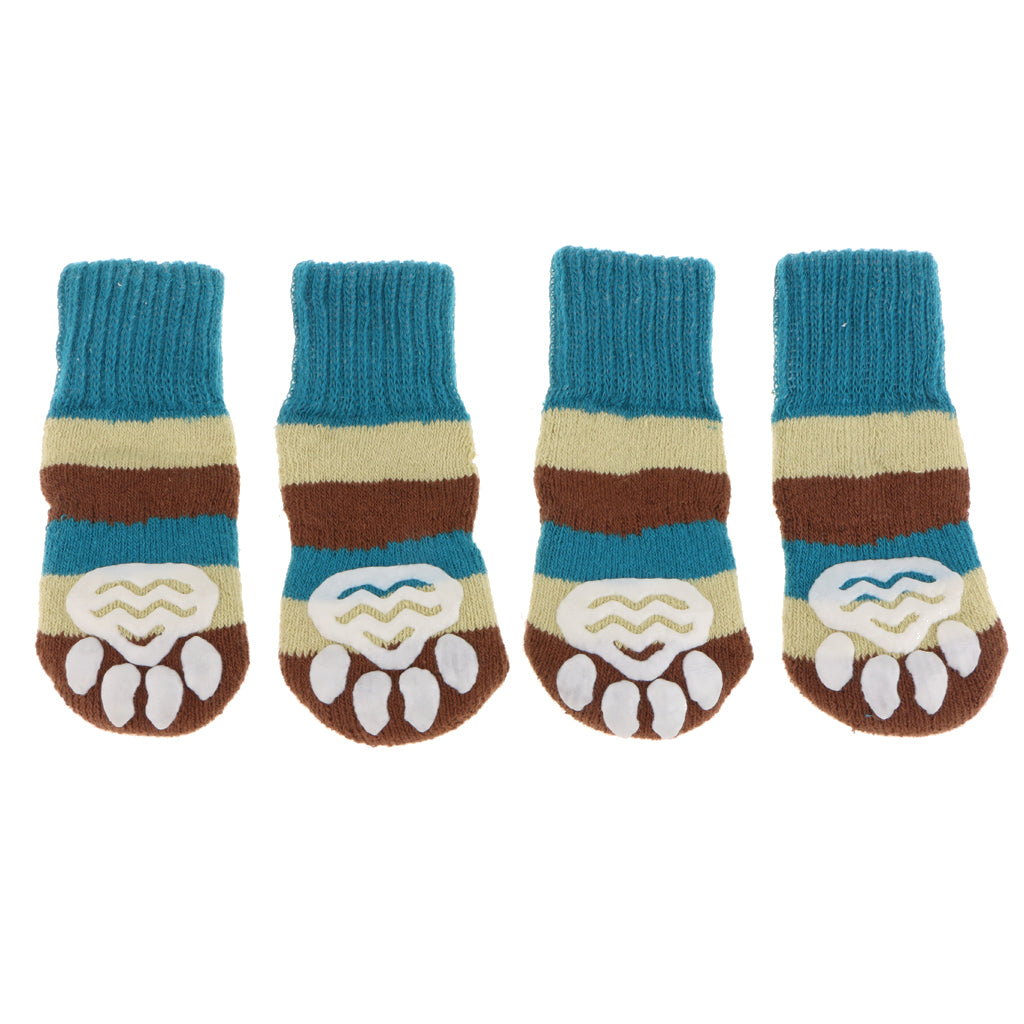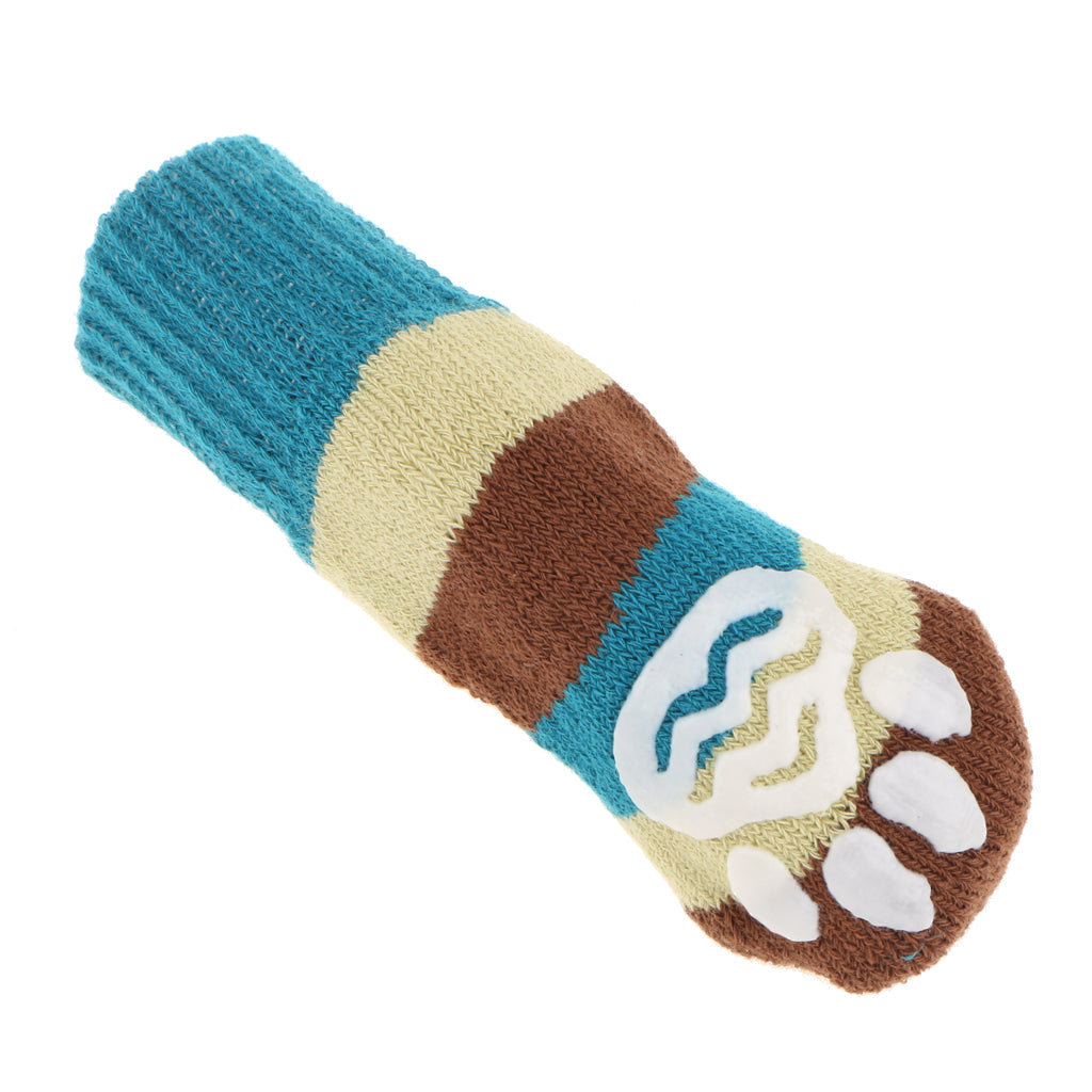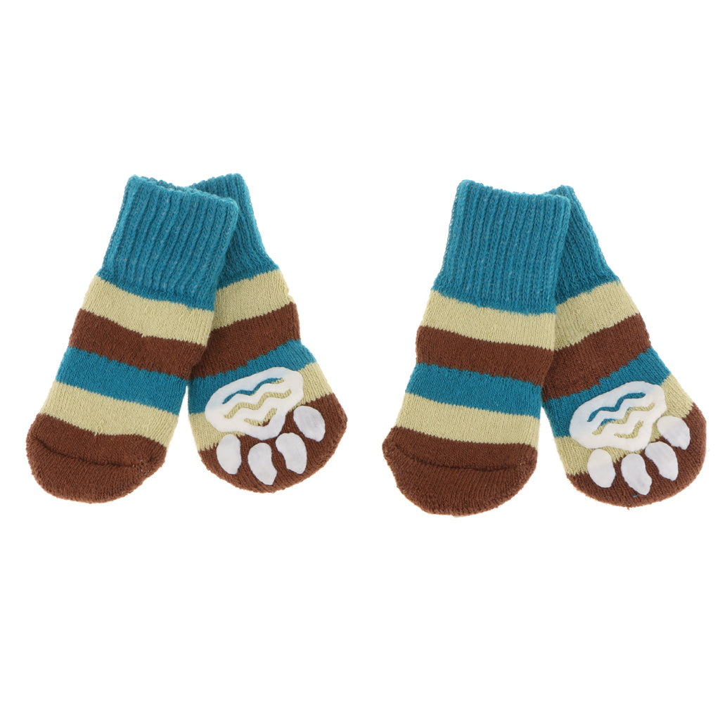Pet dog winter socks with cute paw prints, colorful stripe pattern;