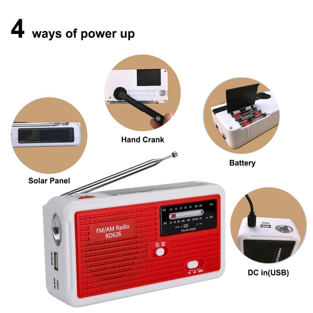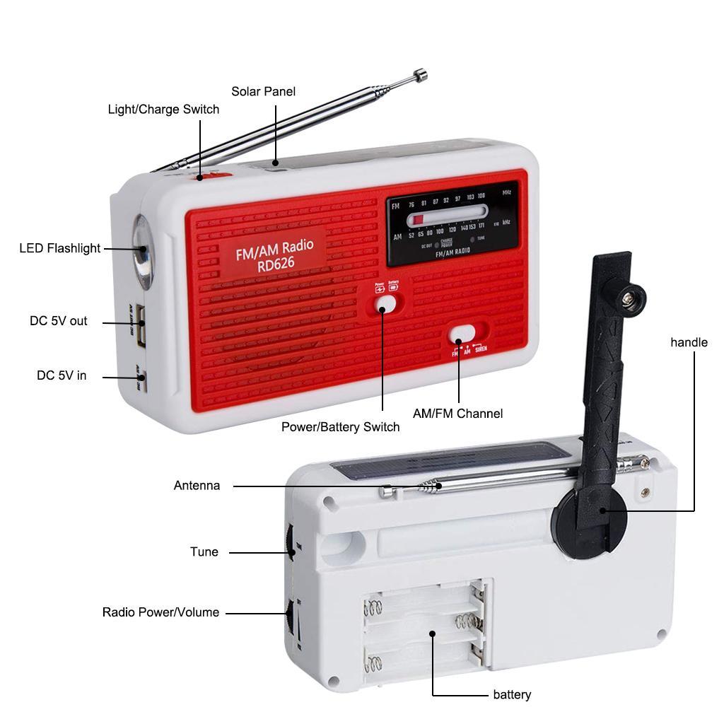 -Wide Application: Music player, LED lighting, Emergency alert, Phone charging, FM AM NOAA radio.