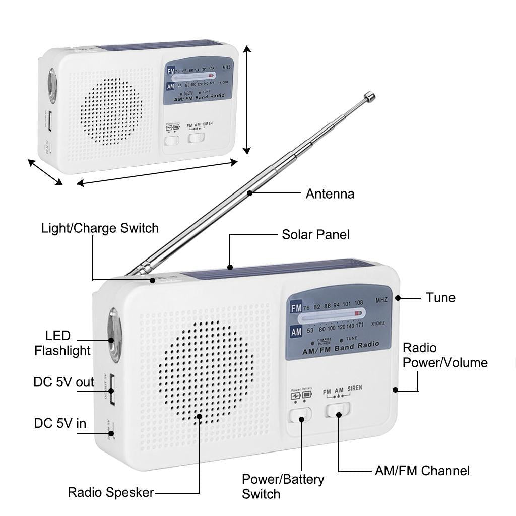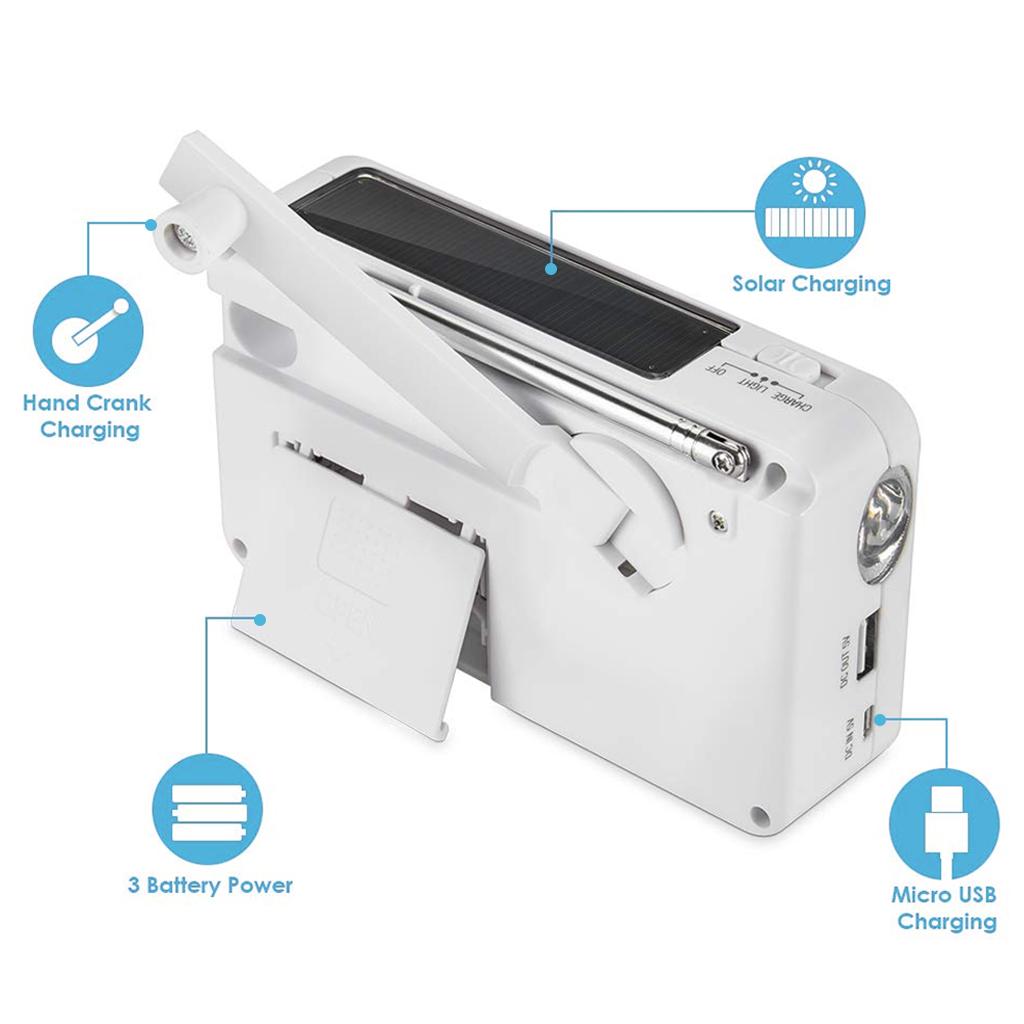 -Wide Application: Music player, LED lighting, Emergency alert, Phone charging, FM AM NOAA radio.
