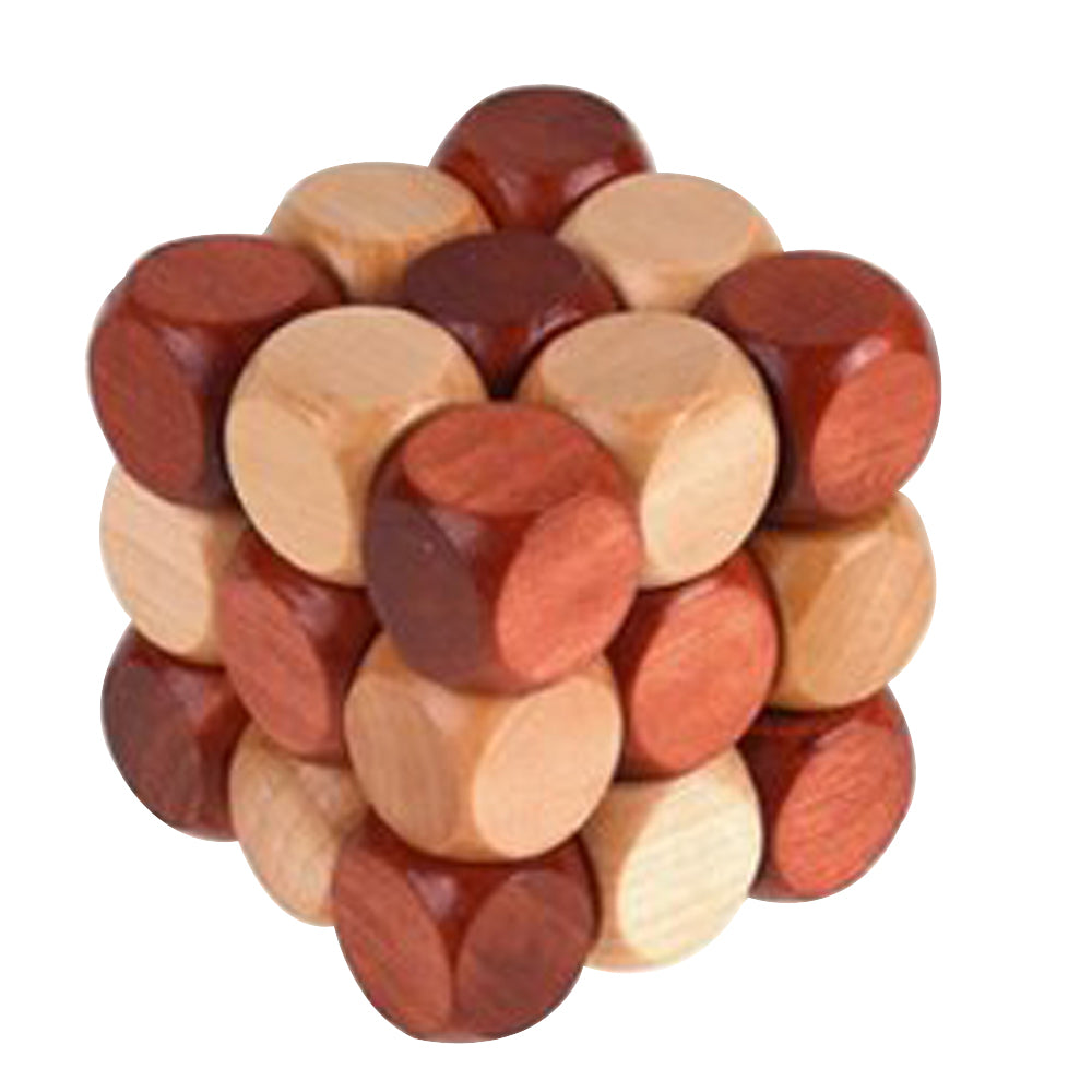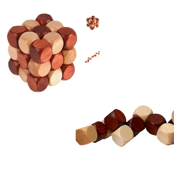 This Kongming Luban lock cube toy can bring you lots of fun and puzzle. Made of 27 painted dices linked by a rope and the dices can be twisted. This Kong Ming lock cube wooden puzzle toy can exercize fingers, develop patience and intelligence, a great toy fits for all ages.
