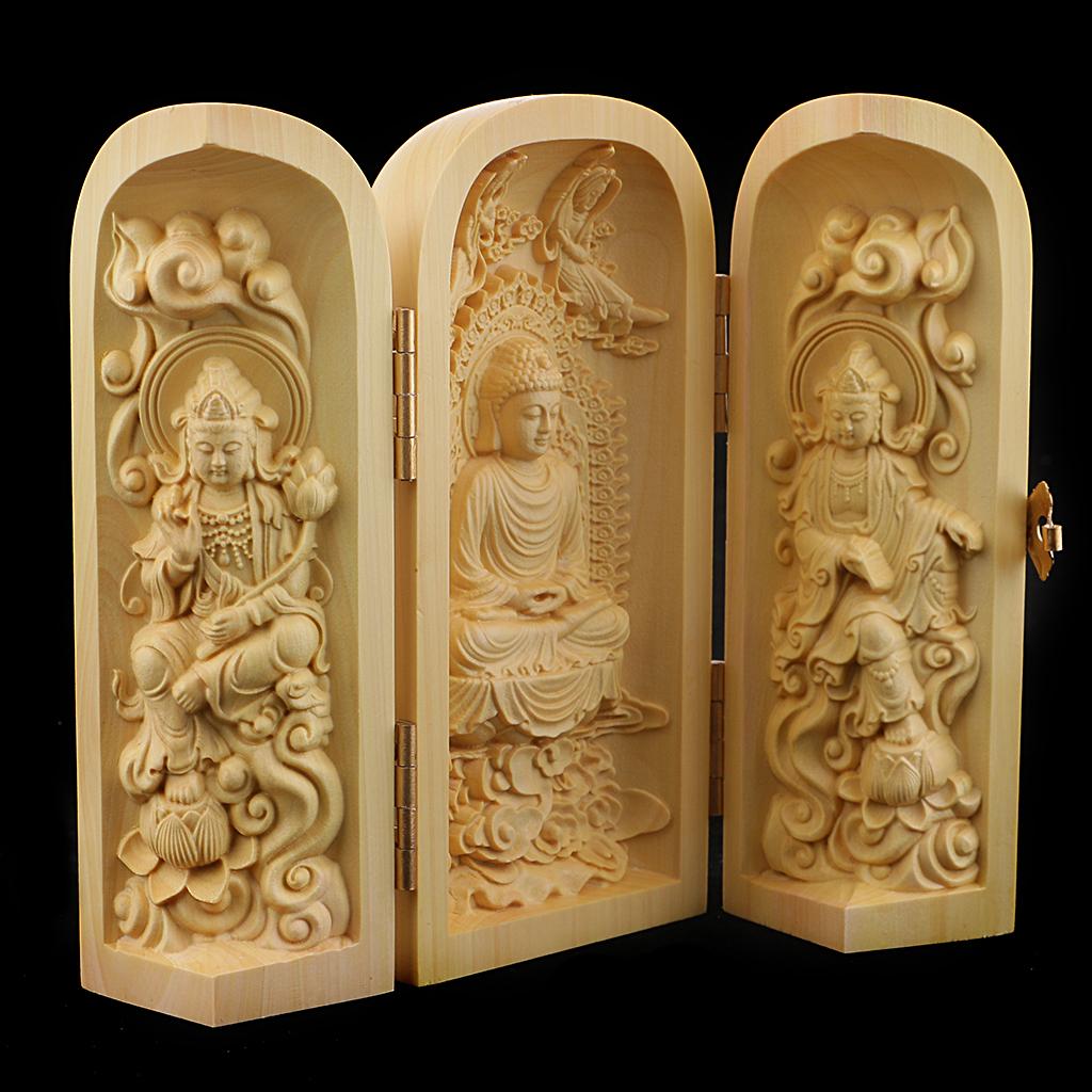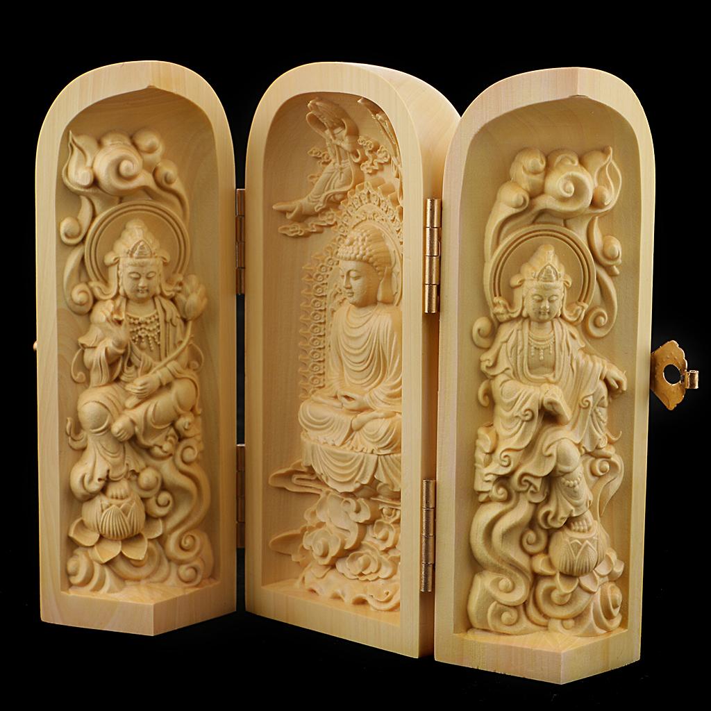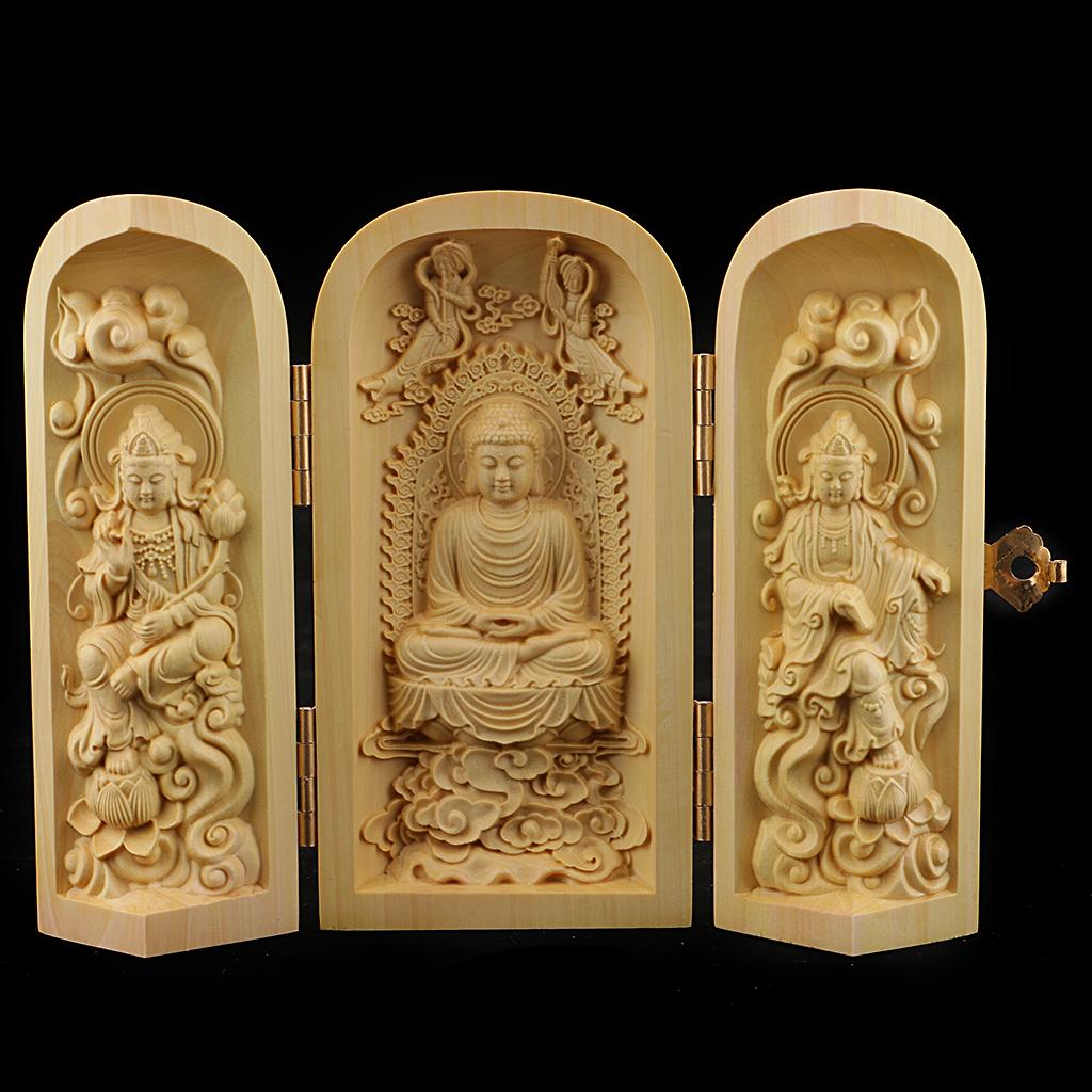 Tibet buddhism Boxwood Carving kwan-yin Avalokitesvara buddha 3 God Statue Box
