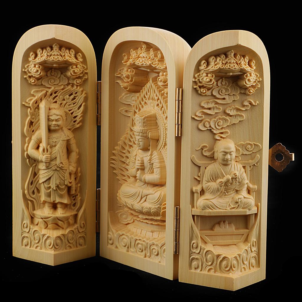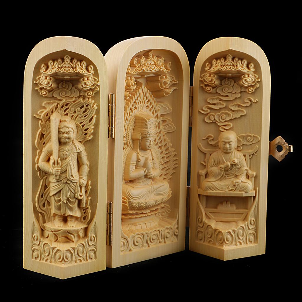 Tibet buddhism Boxwood Carving kwan-yin Avalokitesvara buddha 3 God Statue Box