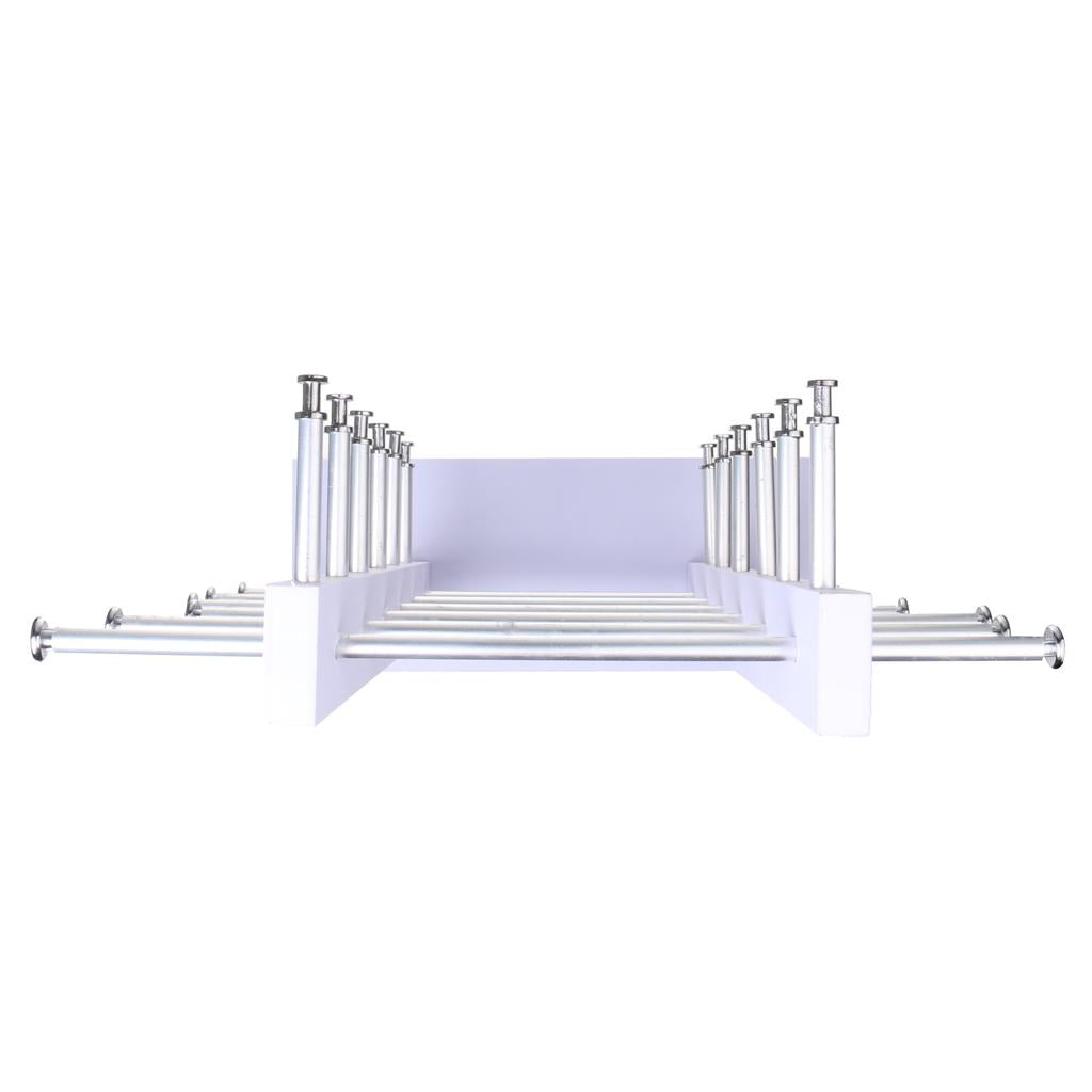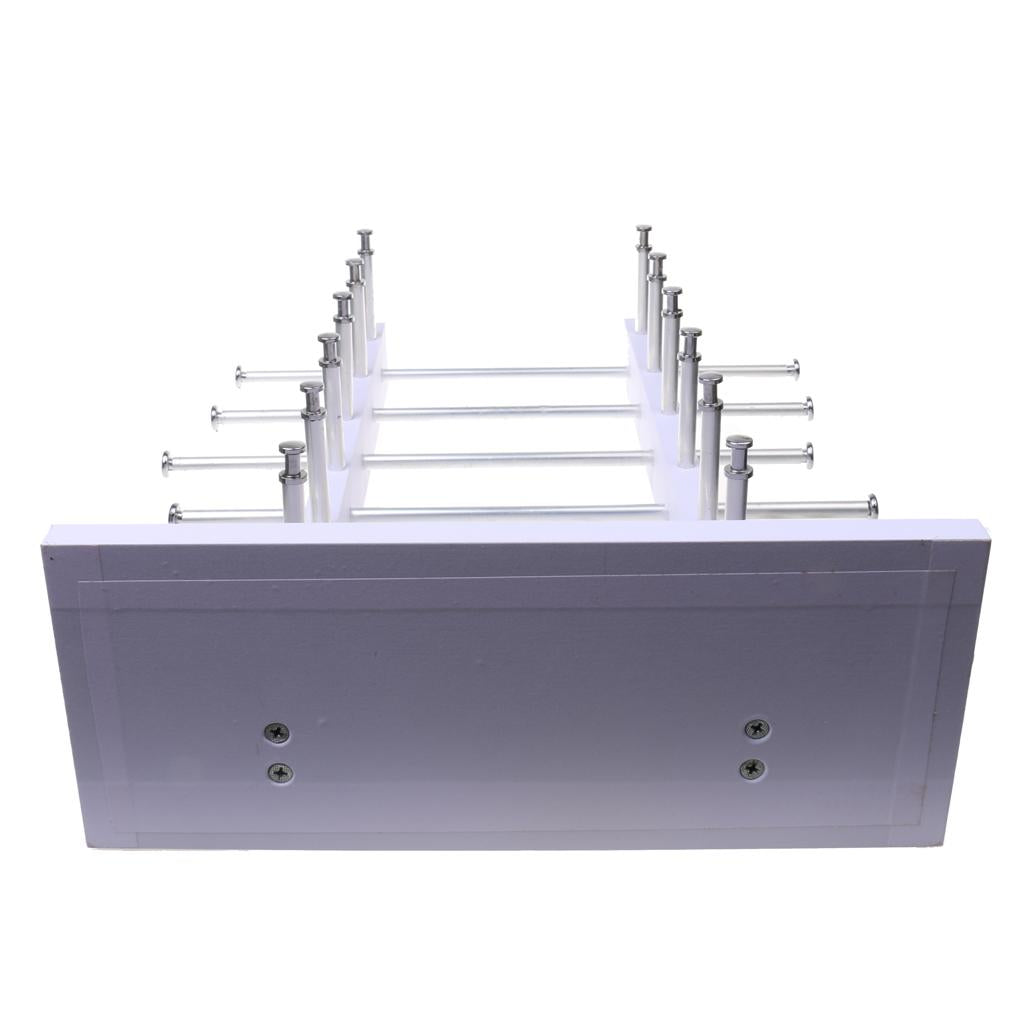 Please push the metal bar through holes on base plate and wood bars slightly, be careful and poke the hole-film one by one, outside to in.