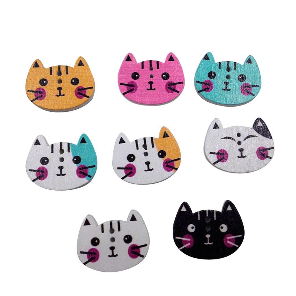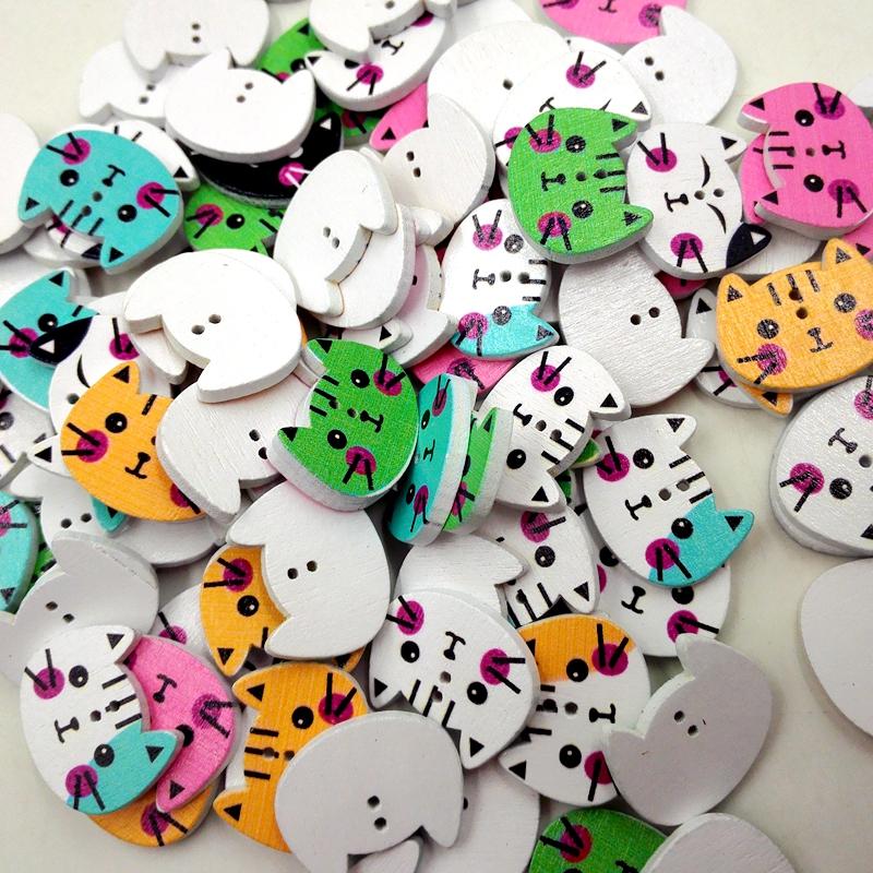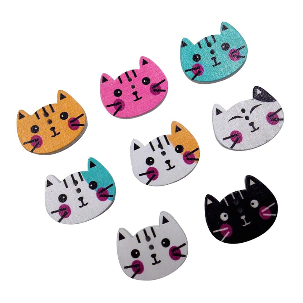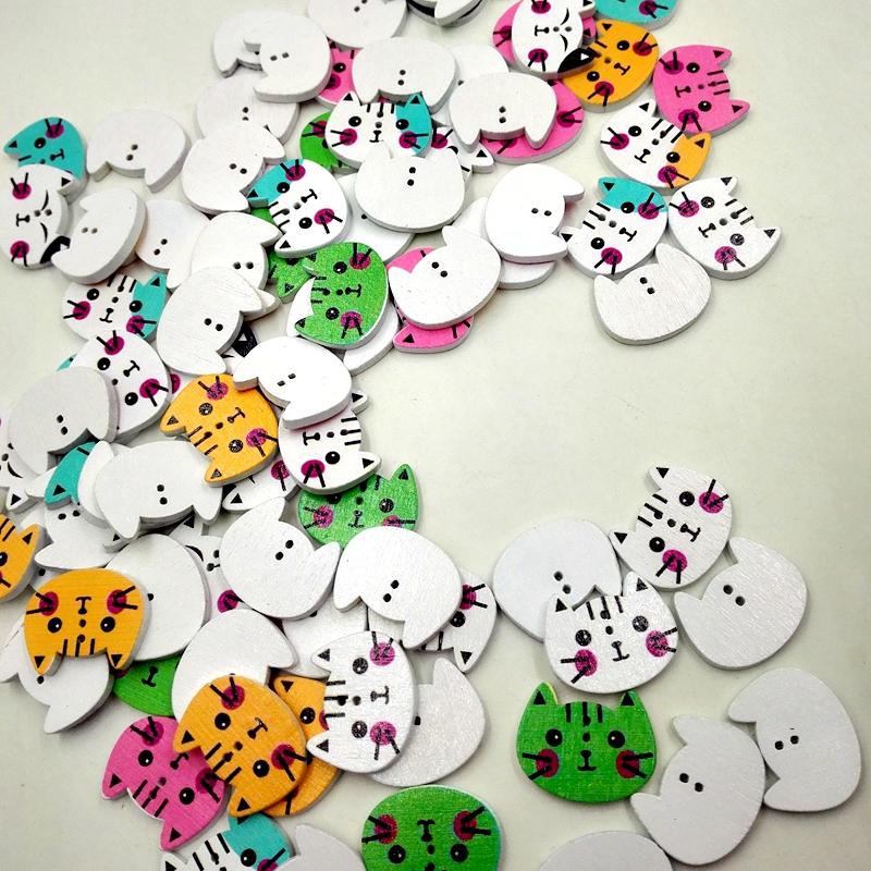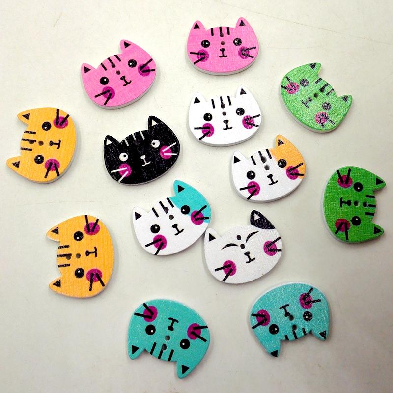 100Pcs Mixed Color Cat Shape Print Wooden Sewing Button