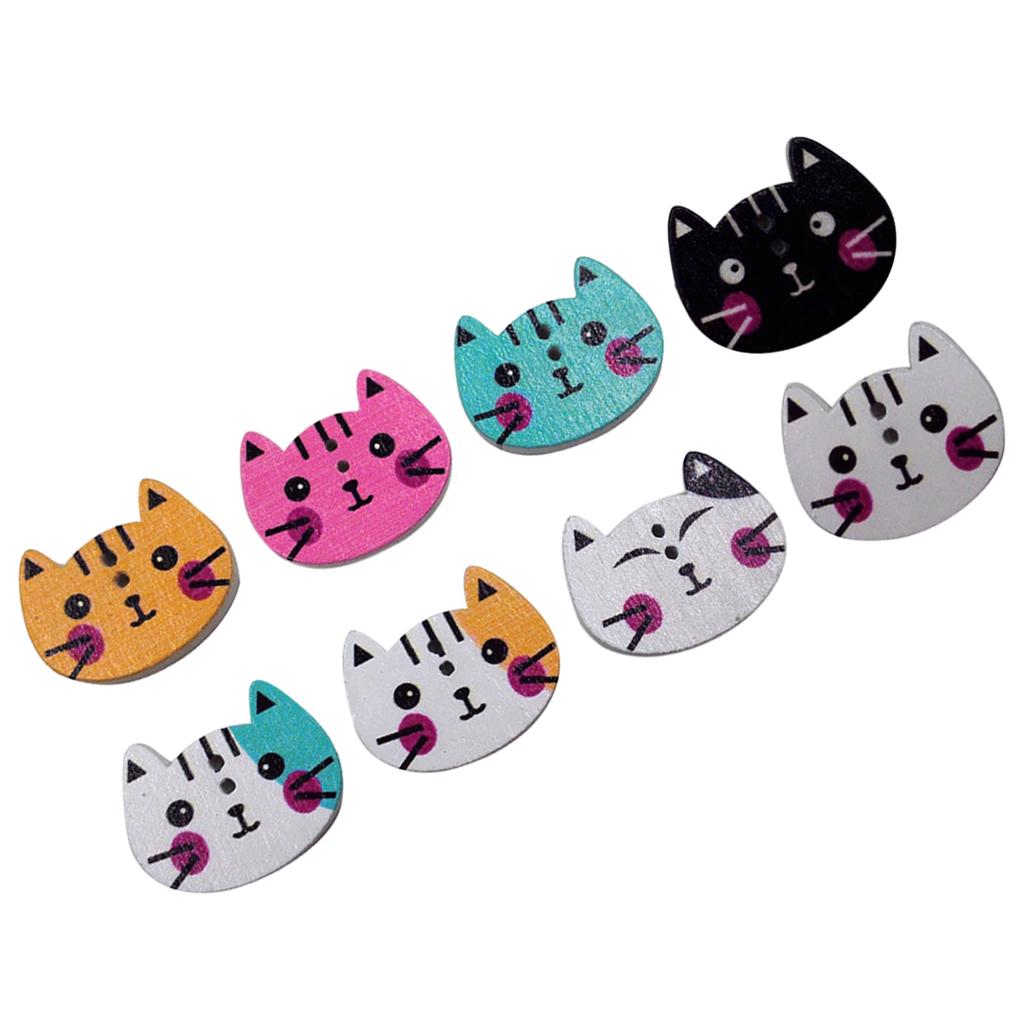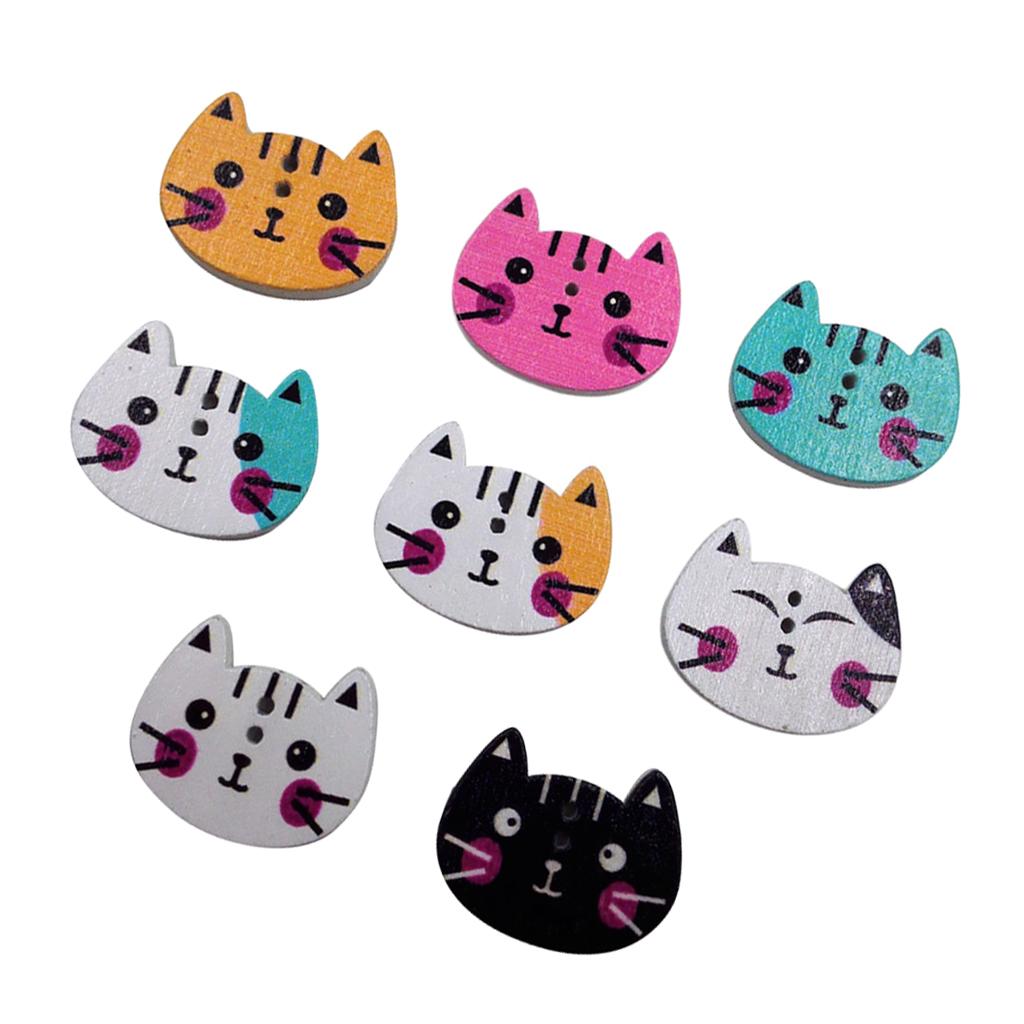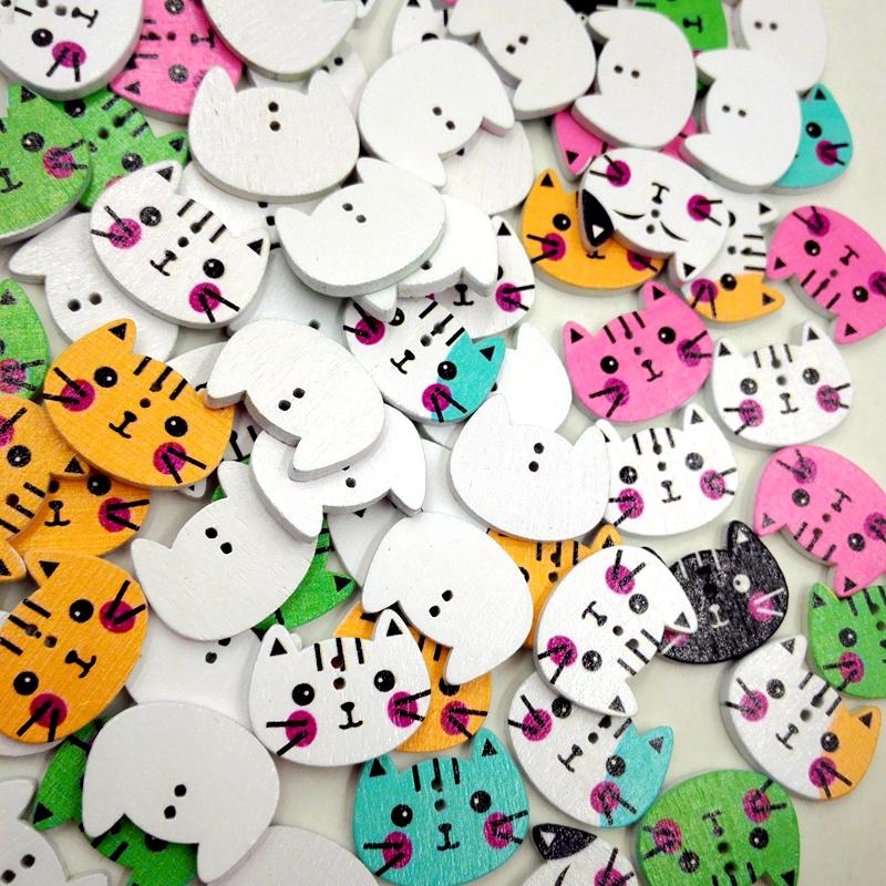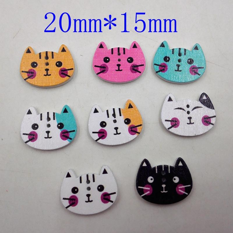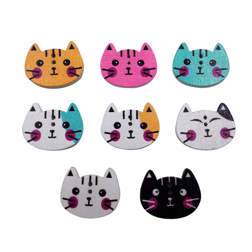 100Pcs Mixed Color Cat Shape Print Wooden Sewing Button