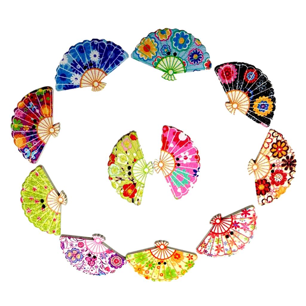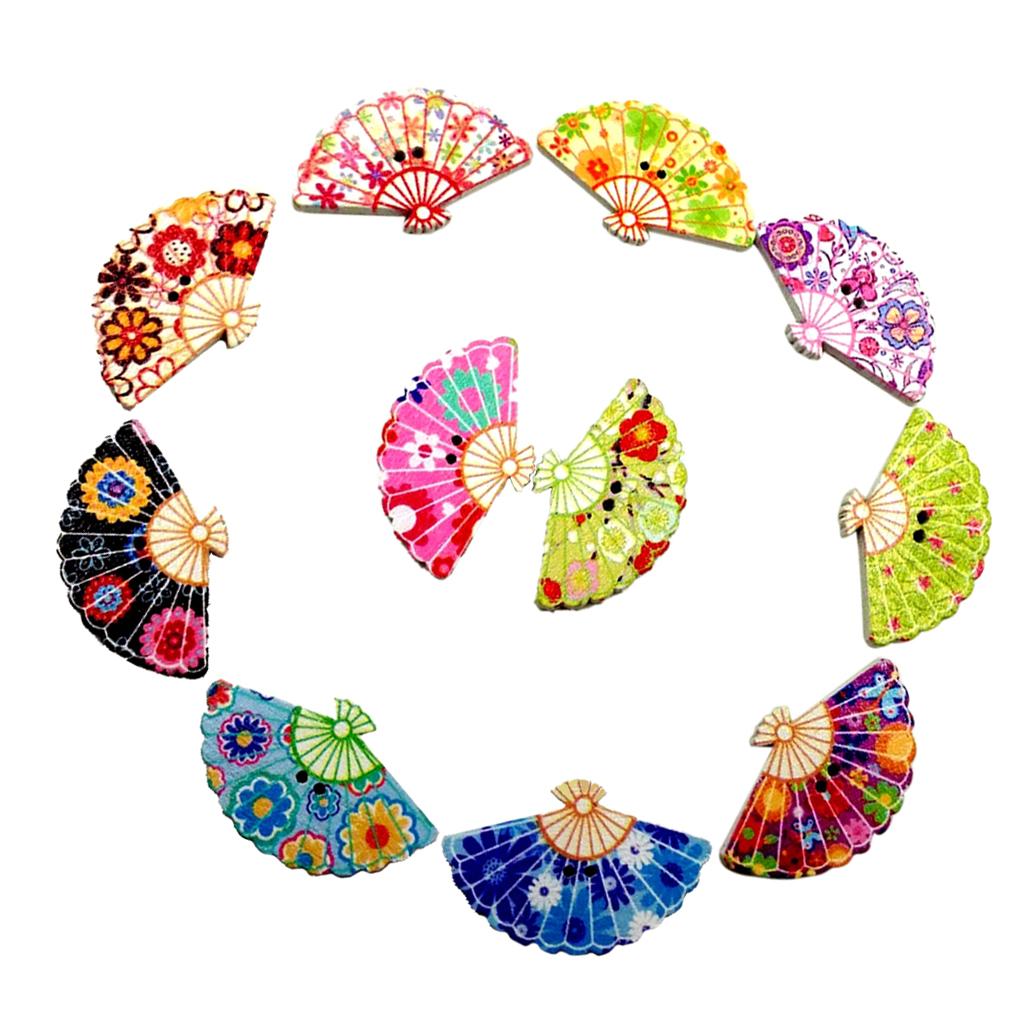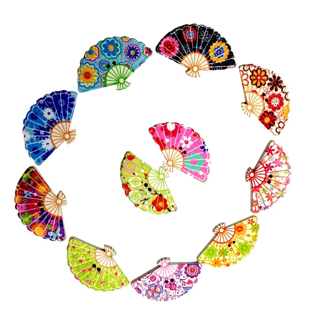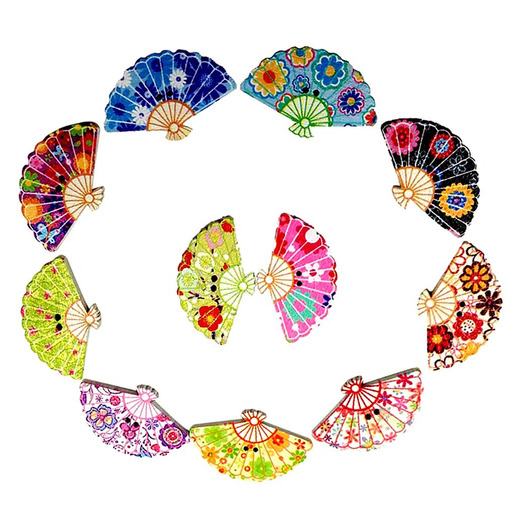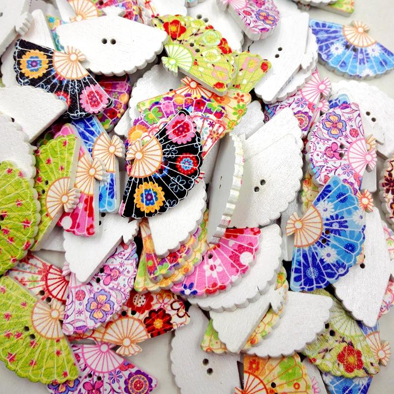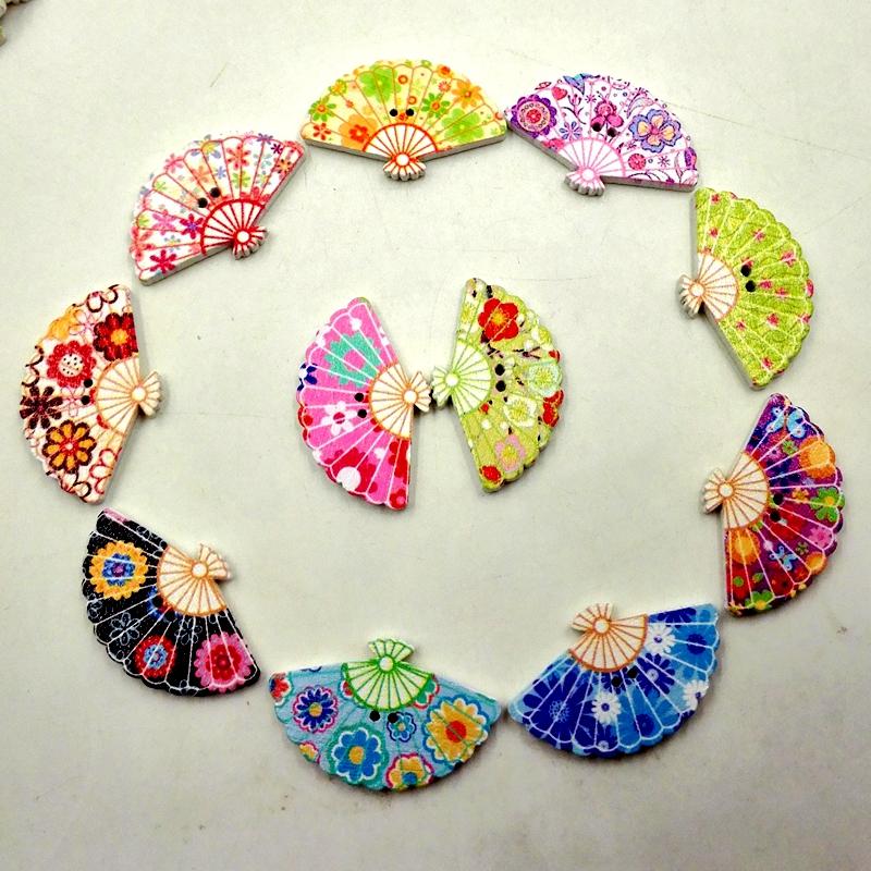 100Pcs Mixed Color Printed Fan Shape Wooden Buttons with Hole DIY Craft