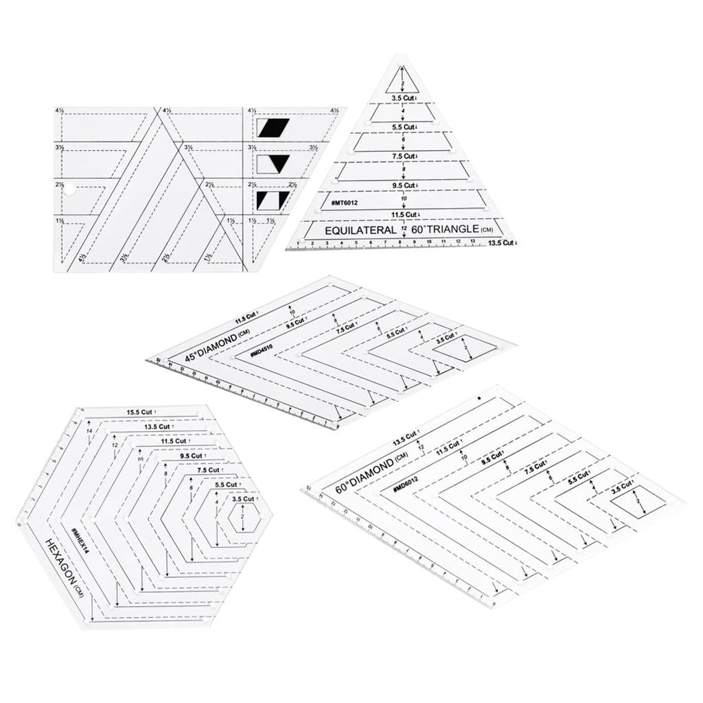 Assorted 5 square styles: Triangle ruler, 45° Diamond patchwork ruler, 60° Diamond patchwork ruler, Hexagonal quilting ruler and Trapezoid ruler, different shapes can meet your multiple needs