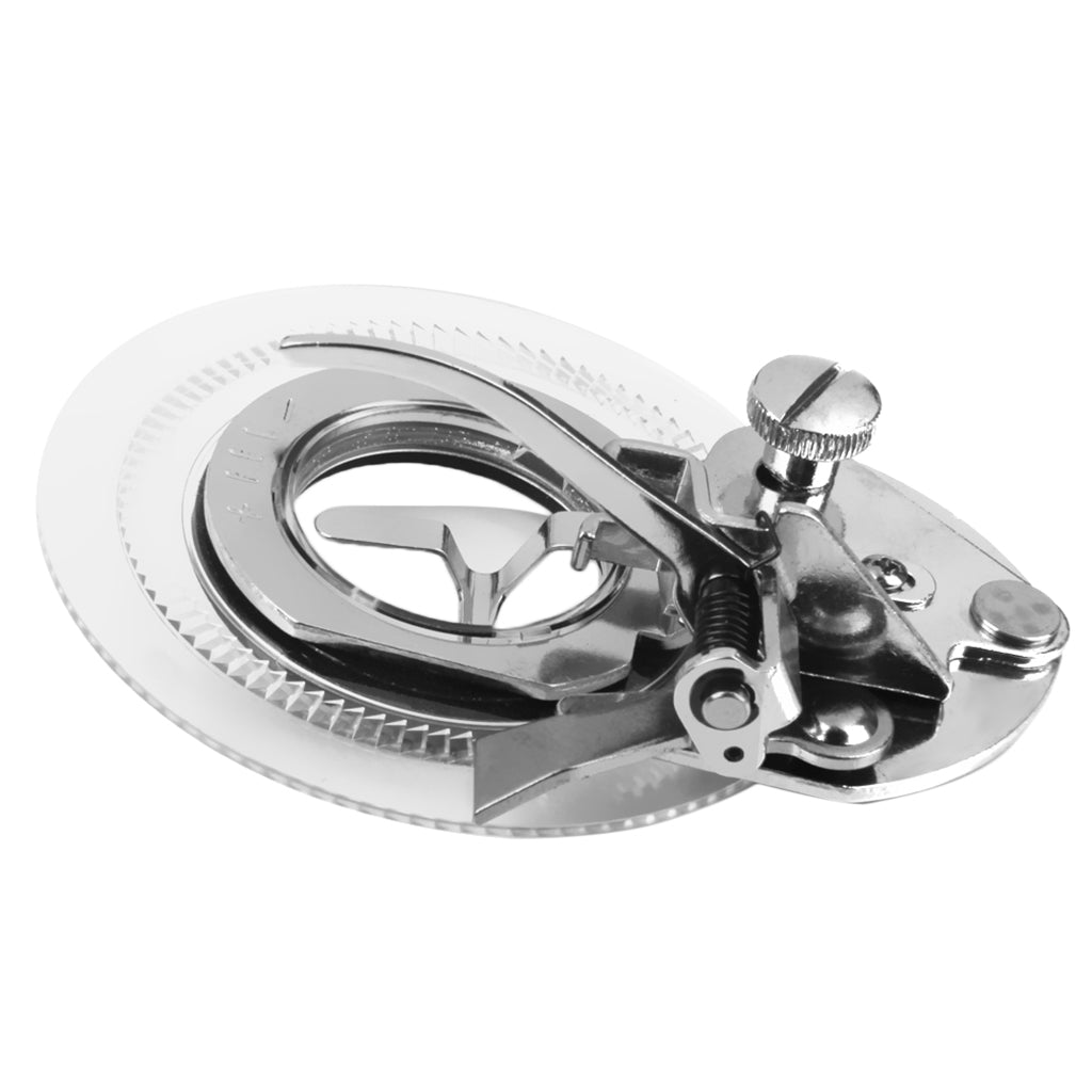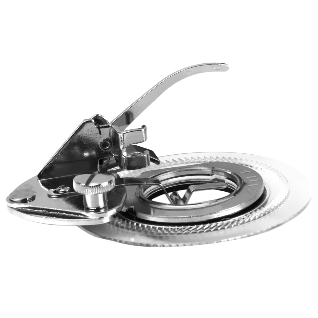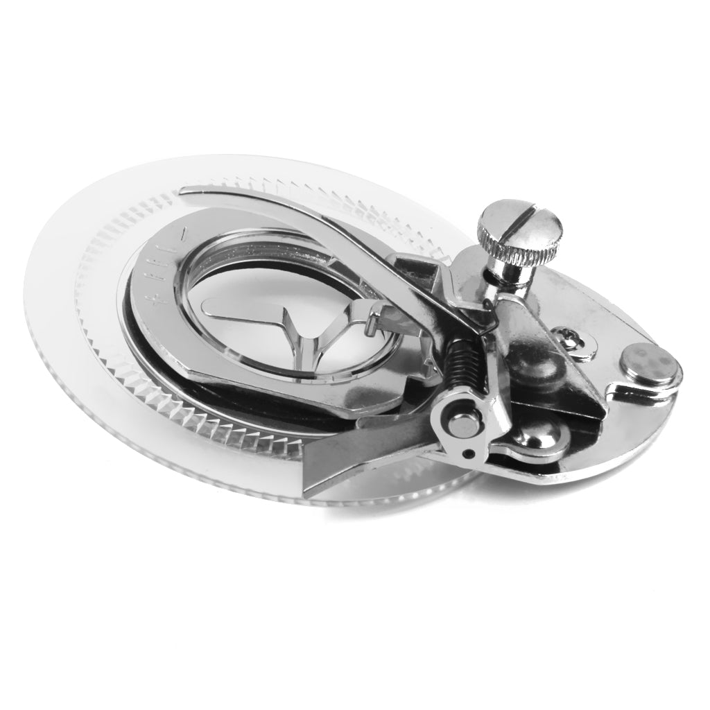 Attach to your presser bar and needle clamp to make circles, flowers, and eyelets on placemats, button covers, soft jewelry, and cuffs—without a hoop! The foam ring on the bottom of the foot grips the fabric to allow even stitching around the eyelet. Expand flower designs by adjusting the needle position and/or using different decorative zigzag stitches. With a simple adjustment of the foot and a change in stitch width on your machine, you can create circles and eyelets of various sizes, approximately 1/2" to 1". Use a twin needle or sew around the circle multiple times and you will be able to achieve some very interesting designs.