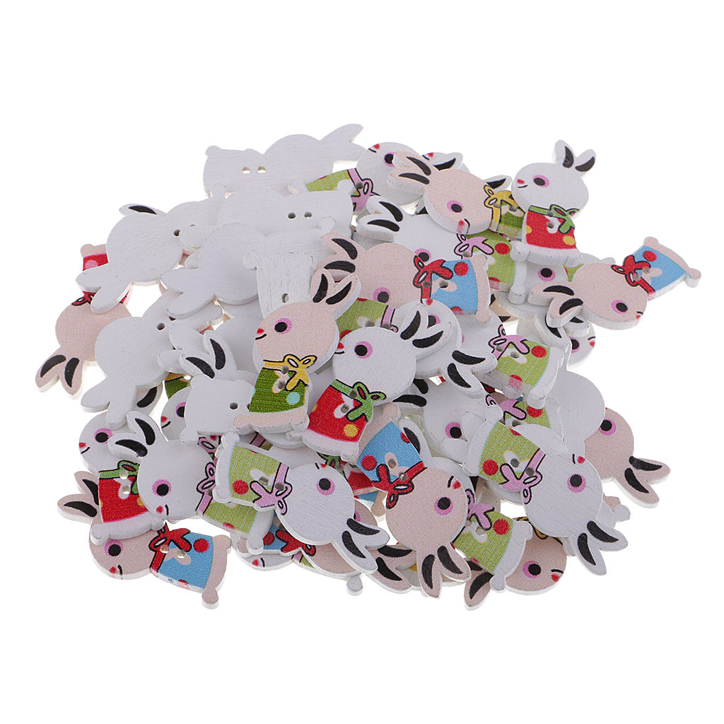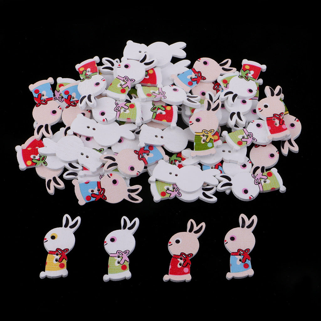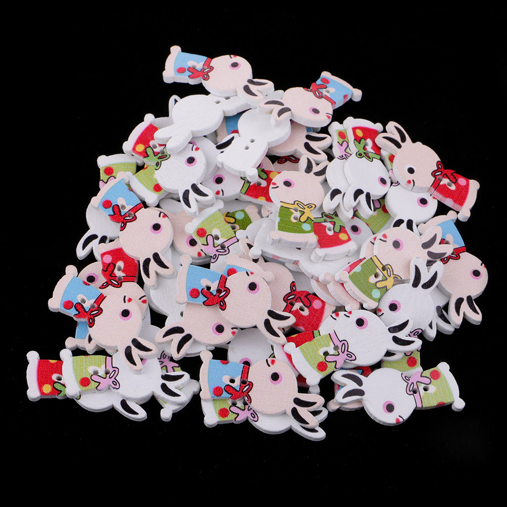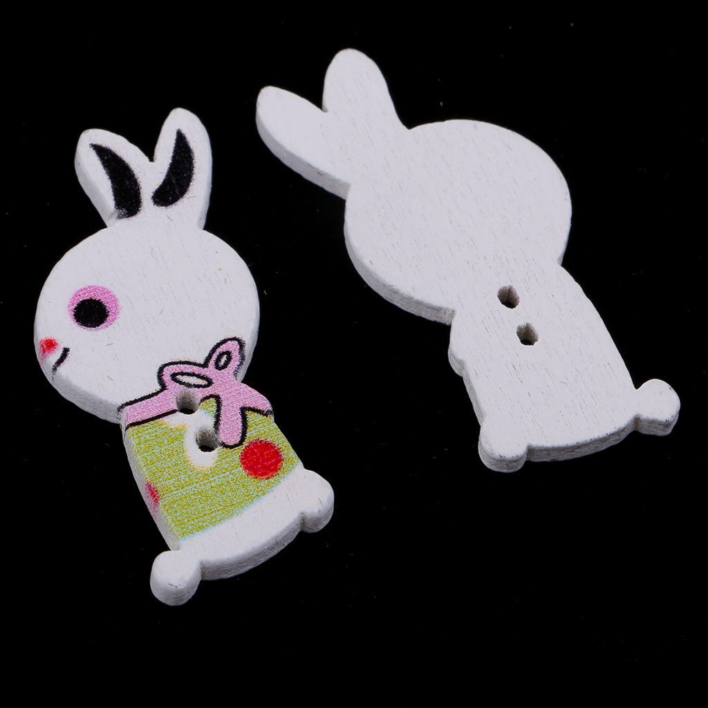 Material: Wood. 50pcs 2 hole wooden buttons, cartoon rabbit shape.