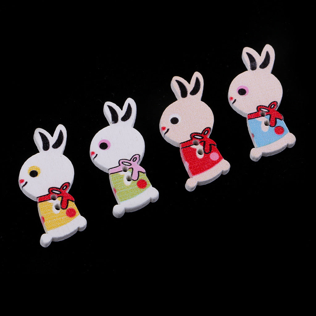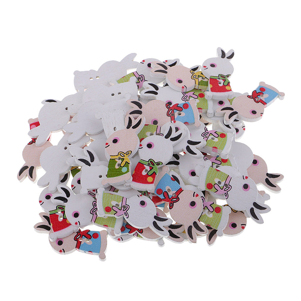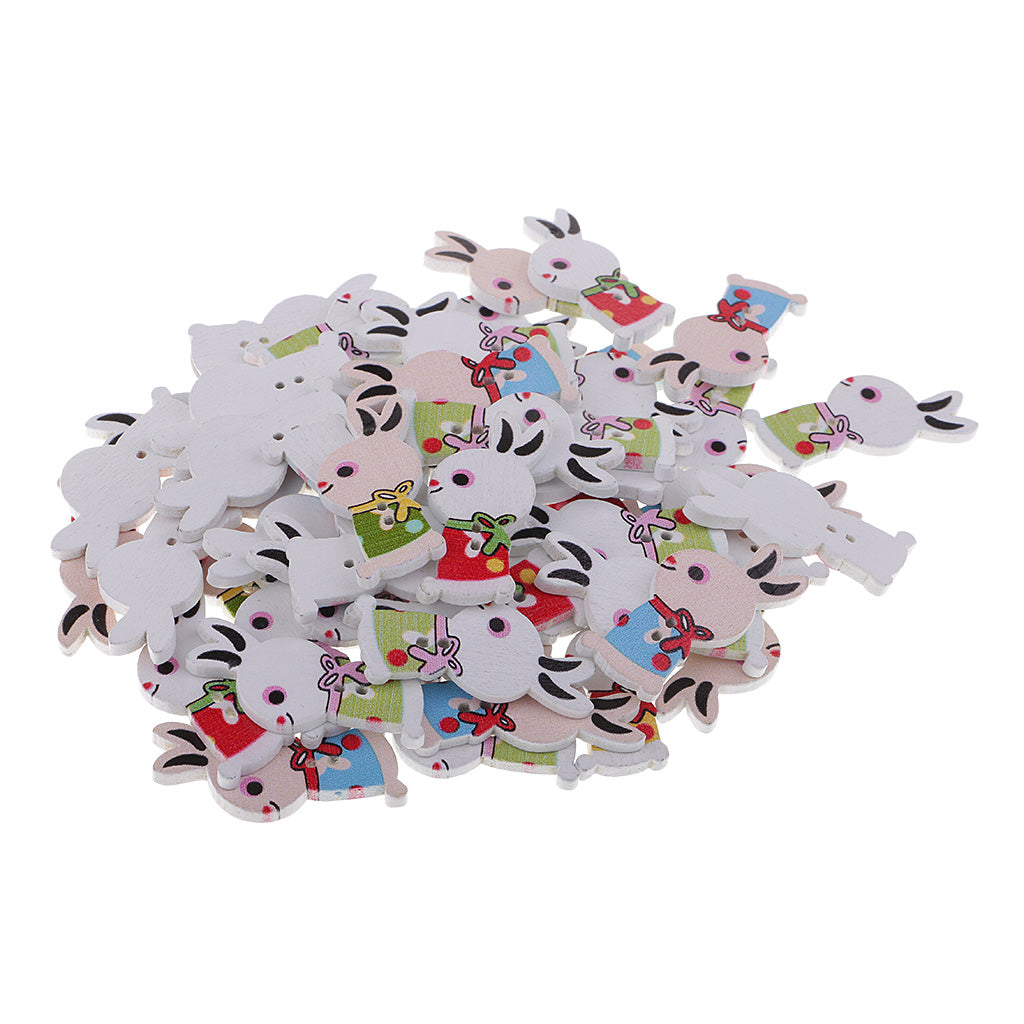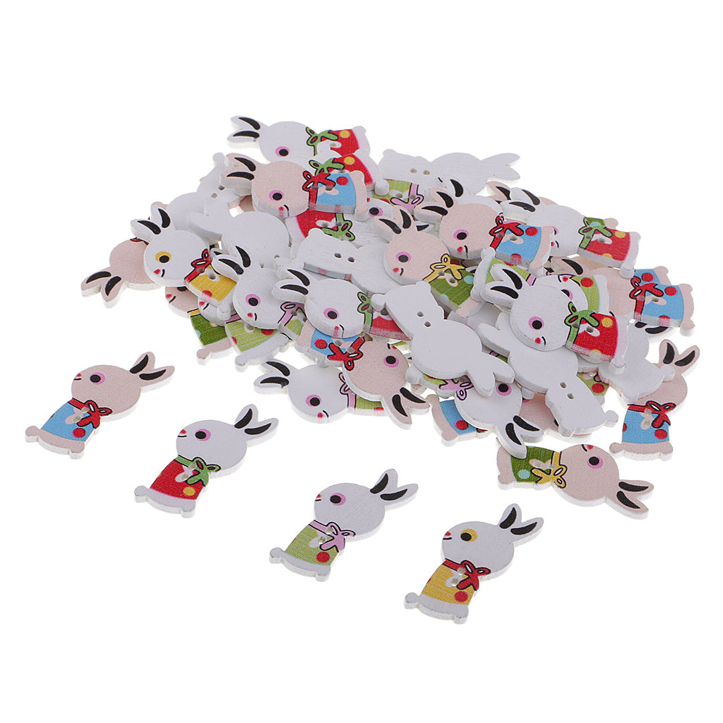 Material: Wood. 50pcs 2 hole wooden buttons, cartoon rabbit shape.