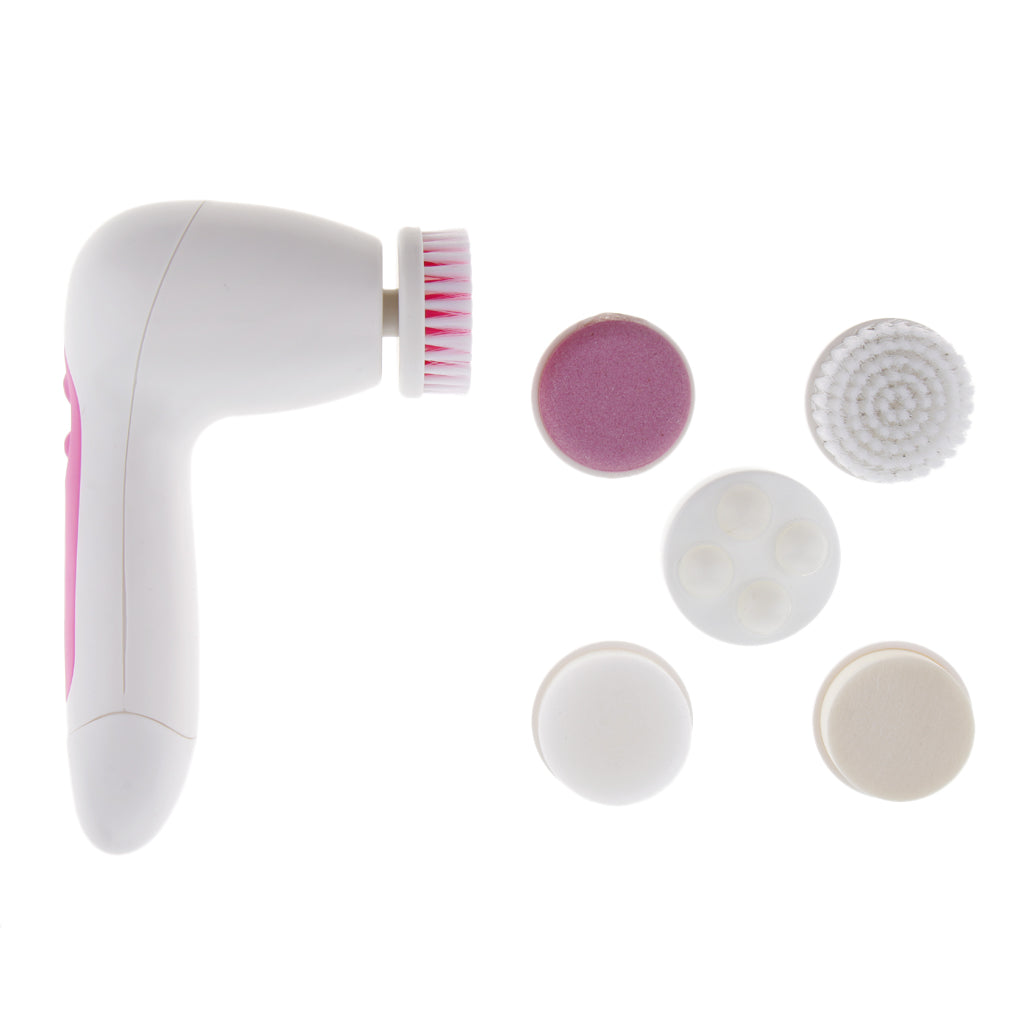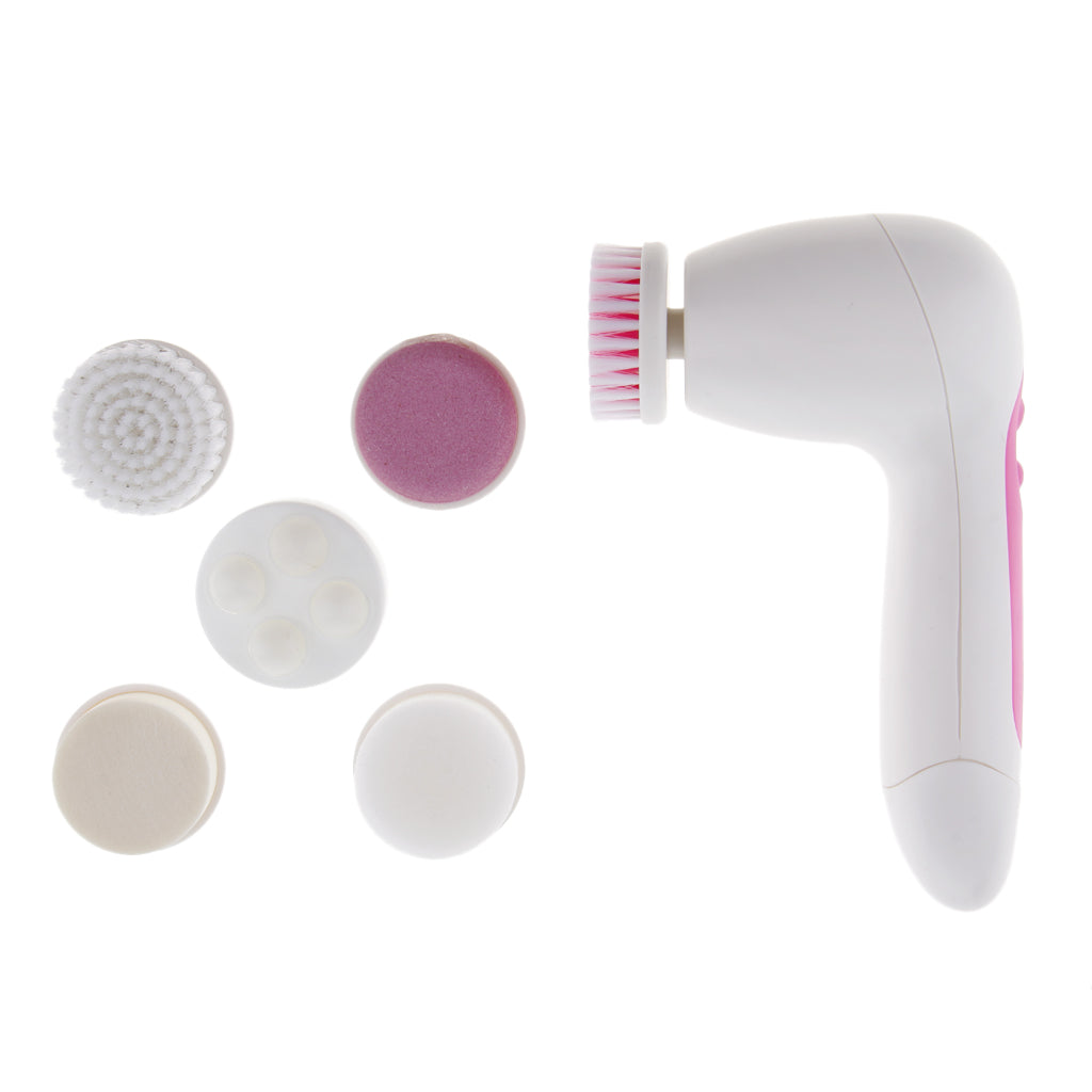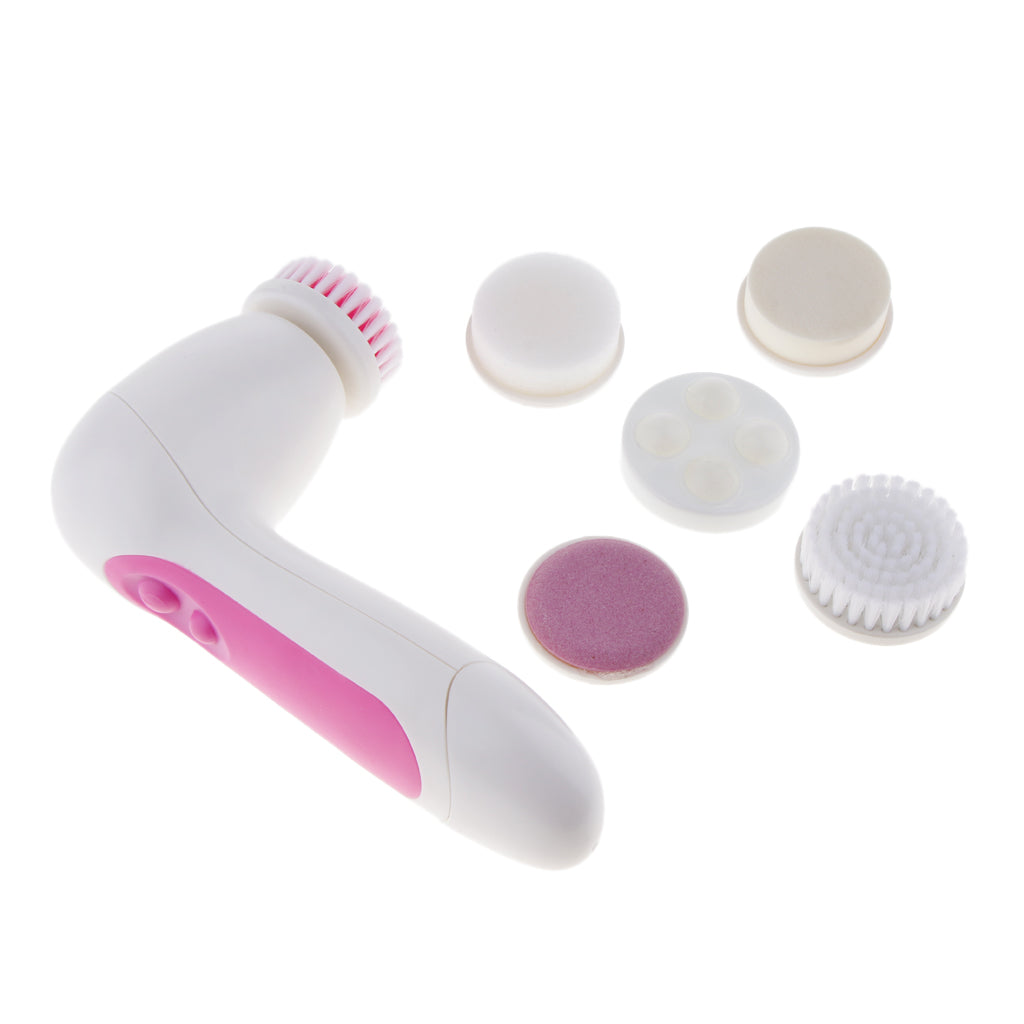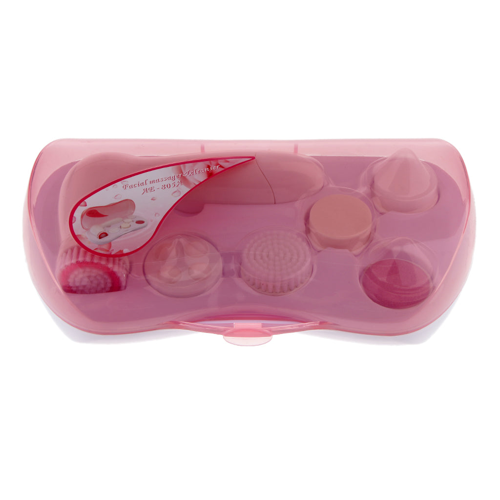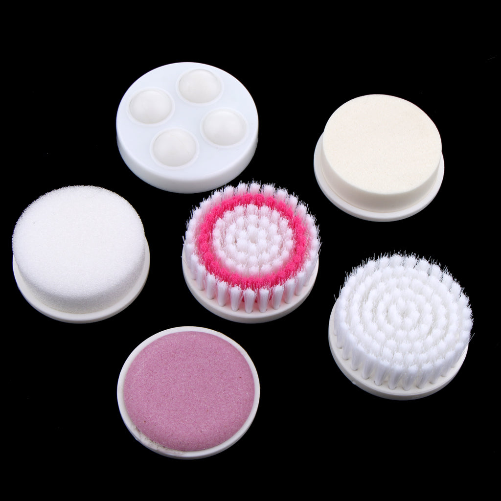 6 in 1 facial electric cleaning brush set comes with superfine brush, latex puff, sponge brush head and massager head.