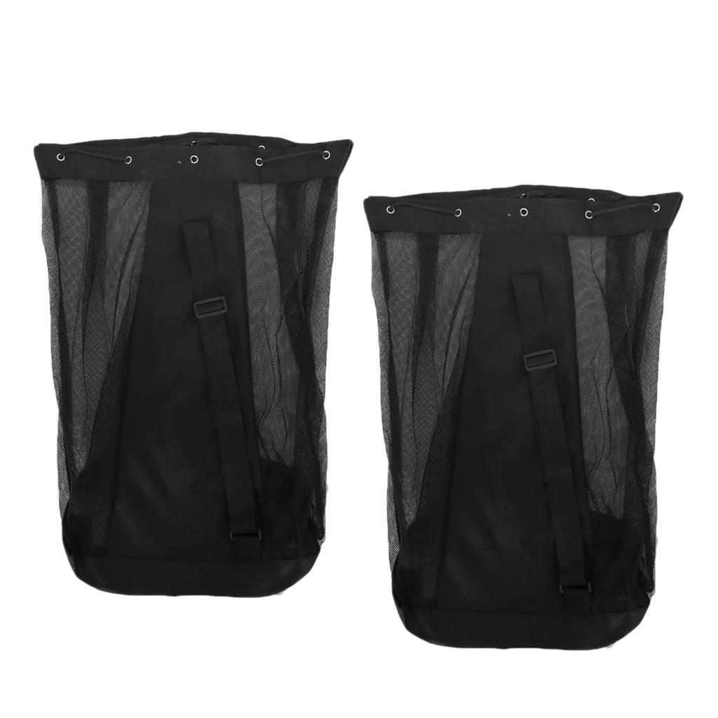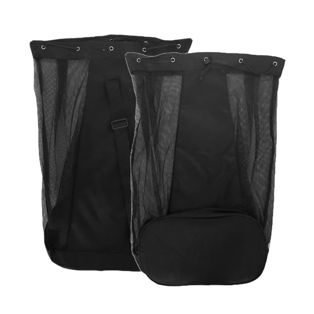 Heavy duty mesh equipment bag with adjustable shoulder strap for easy carrying.