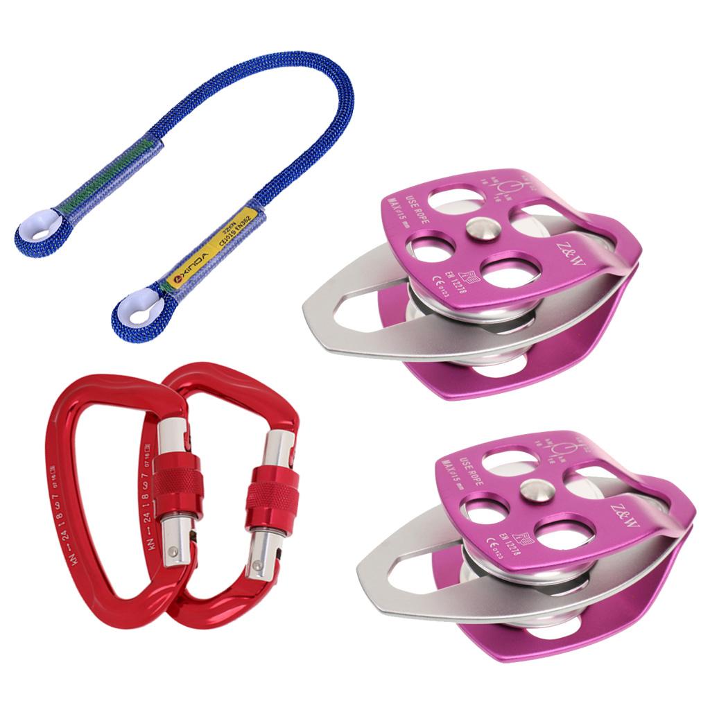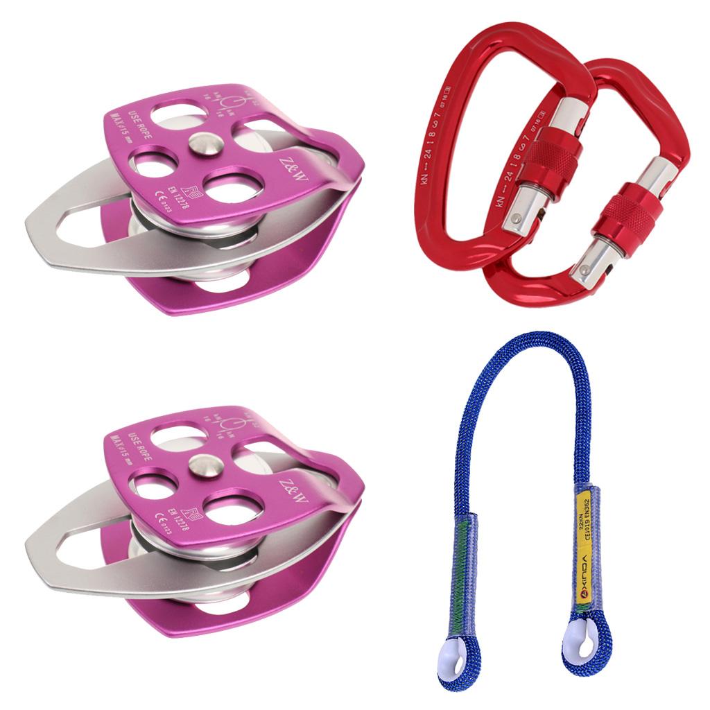2 Pieces 32KN climbing rope pulleys, 2 pieces 24KN screw locking carabiner with 1 piece 100cm fall protection rope