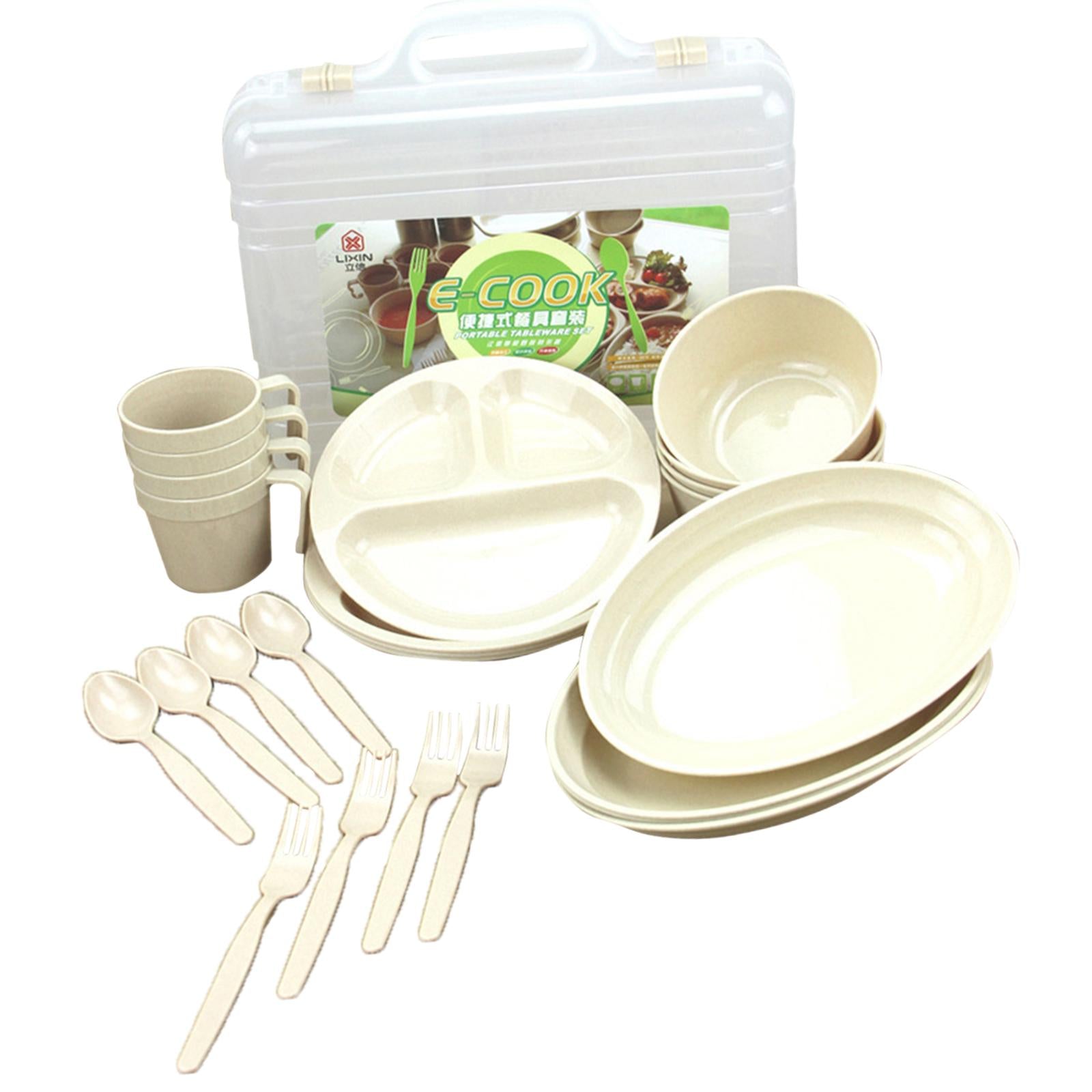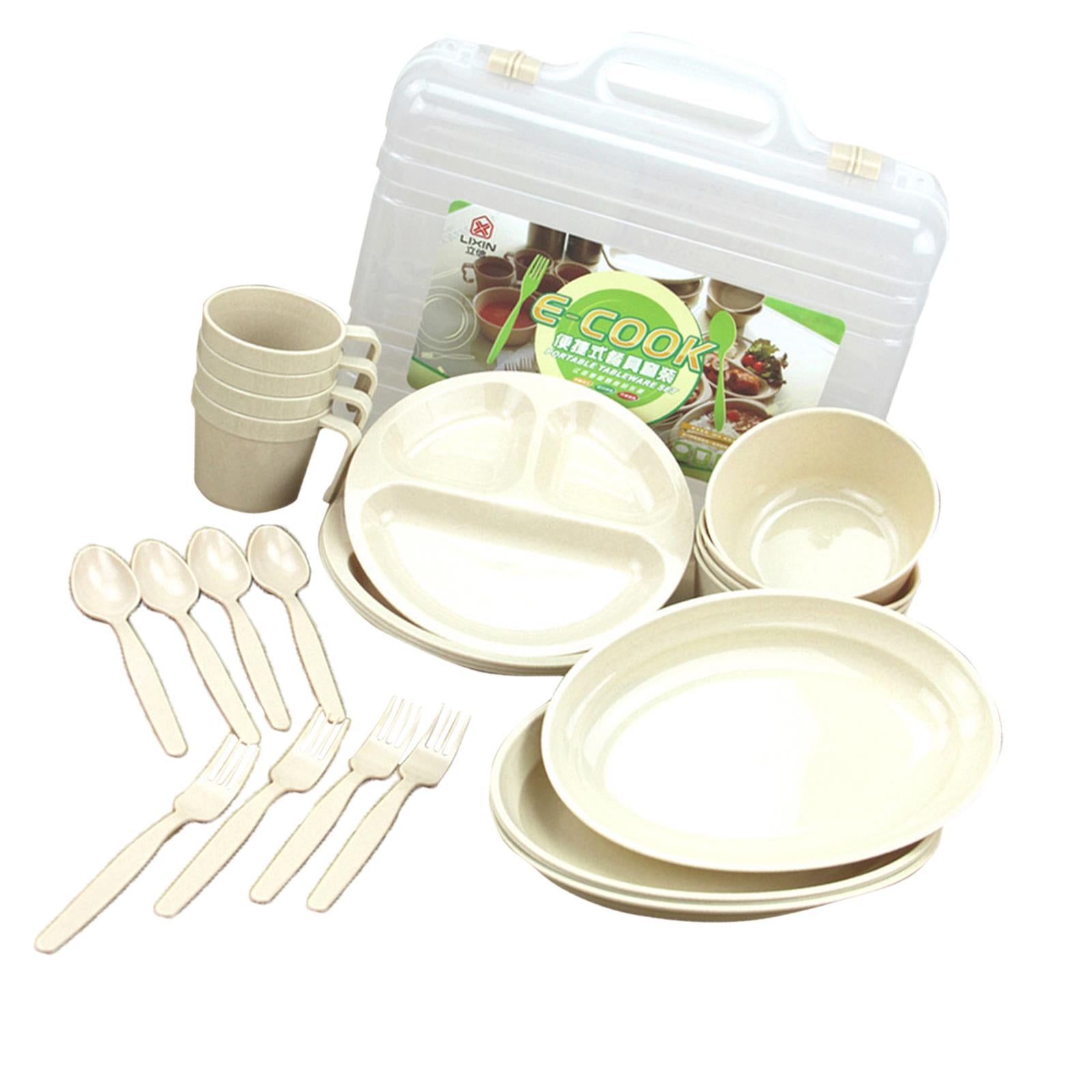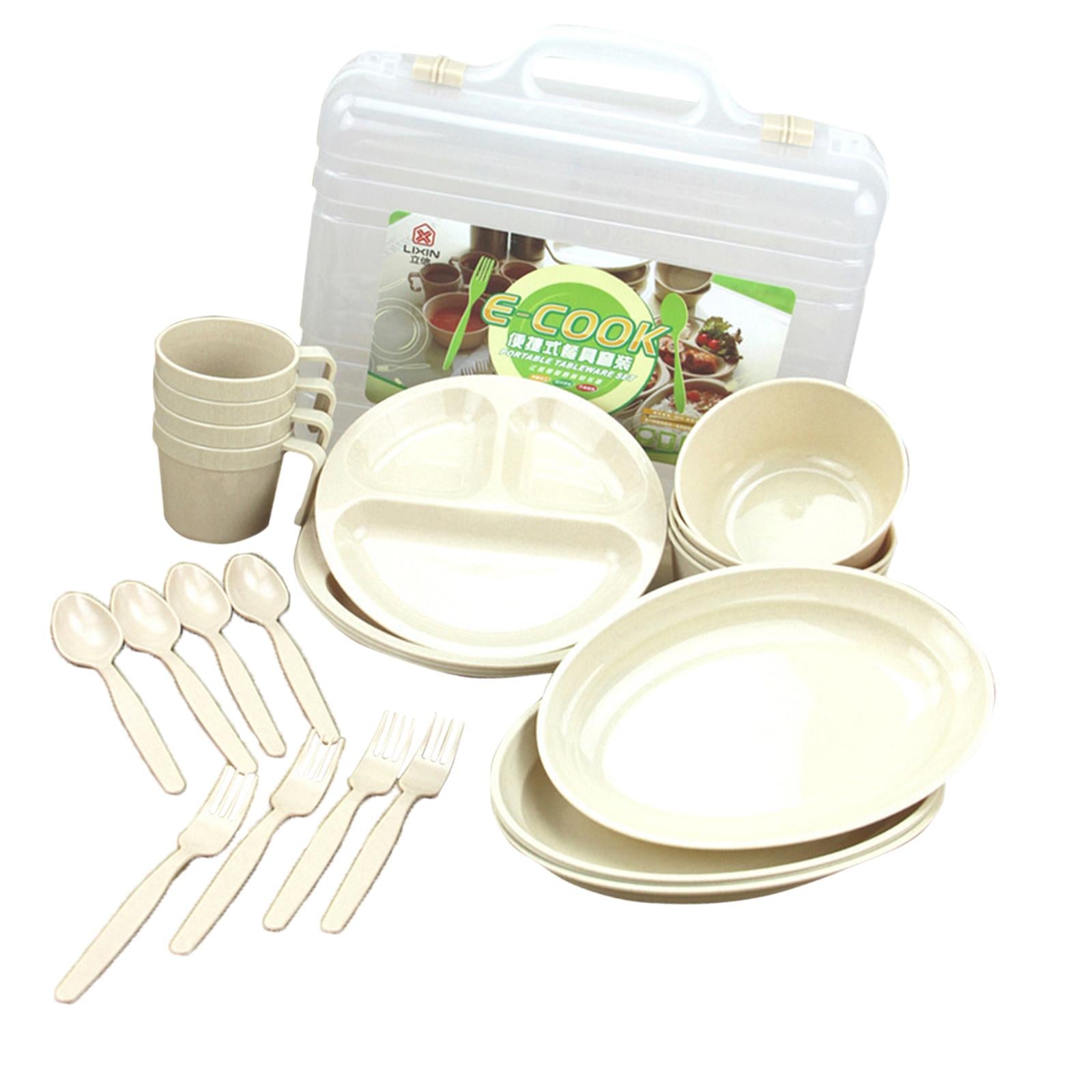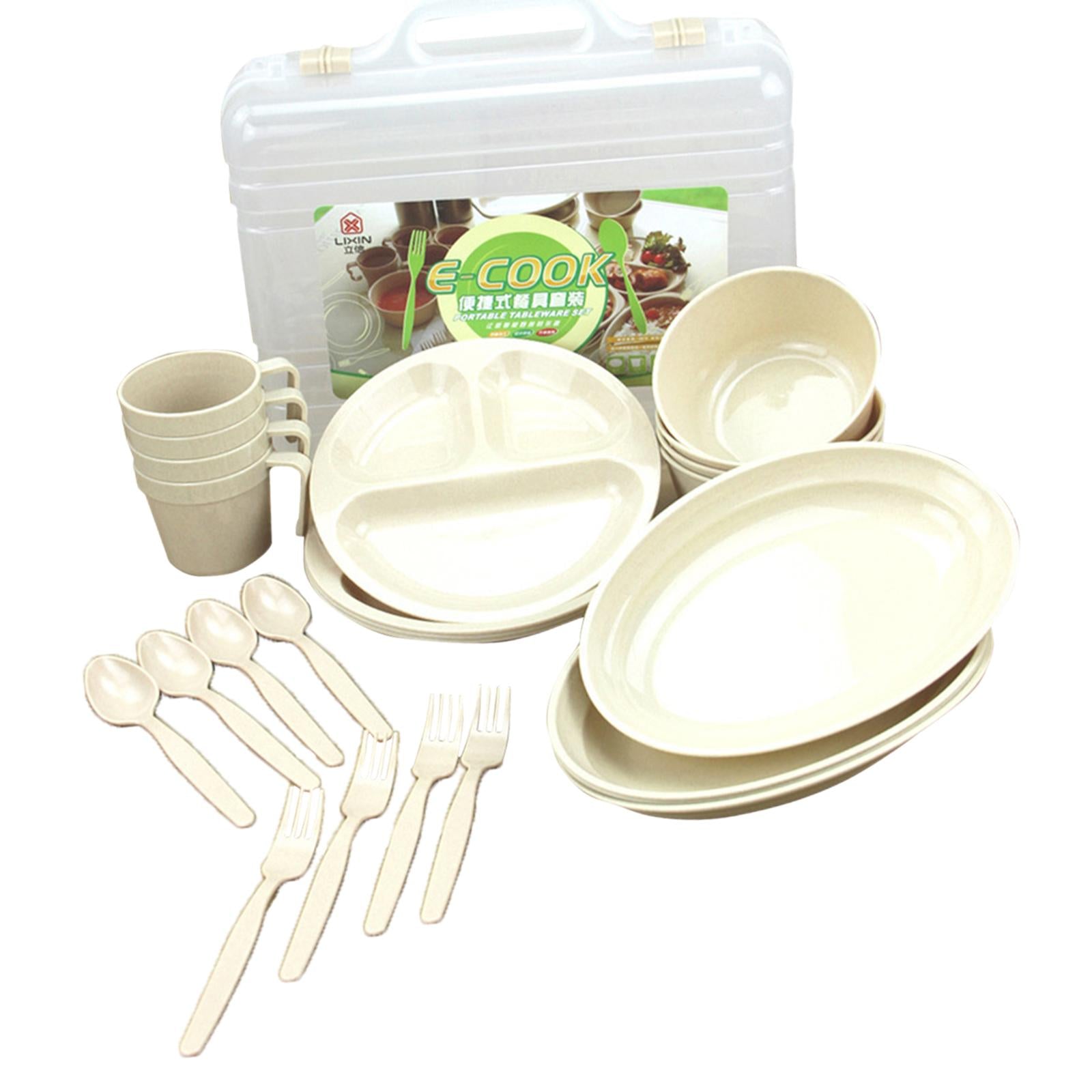 24 Pieces Plastic Reusable Tableware Set - 4 Mugs, 4 Long Plates, 4 Divided Plates, 4 Forks, 4 Spoons, 4 Soup Bowls and 1 Carry Case.