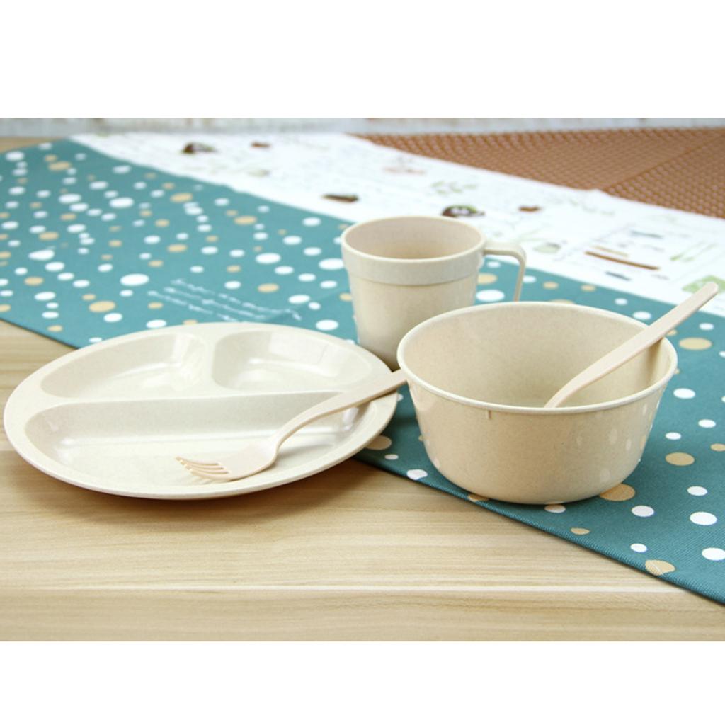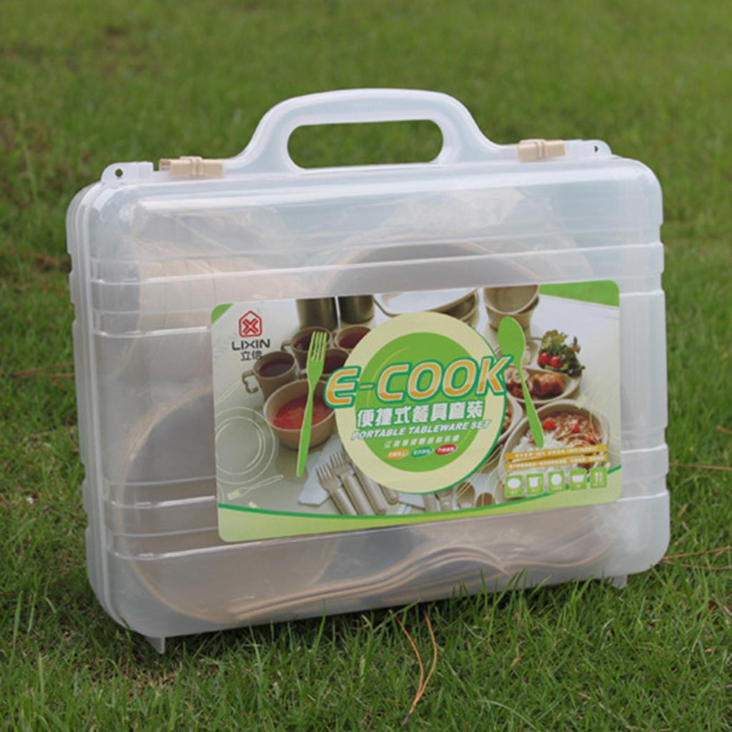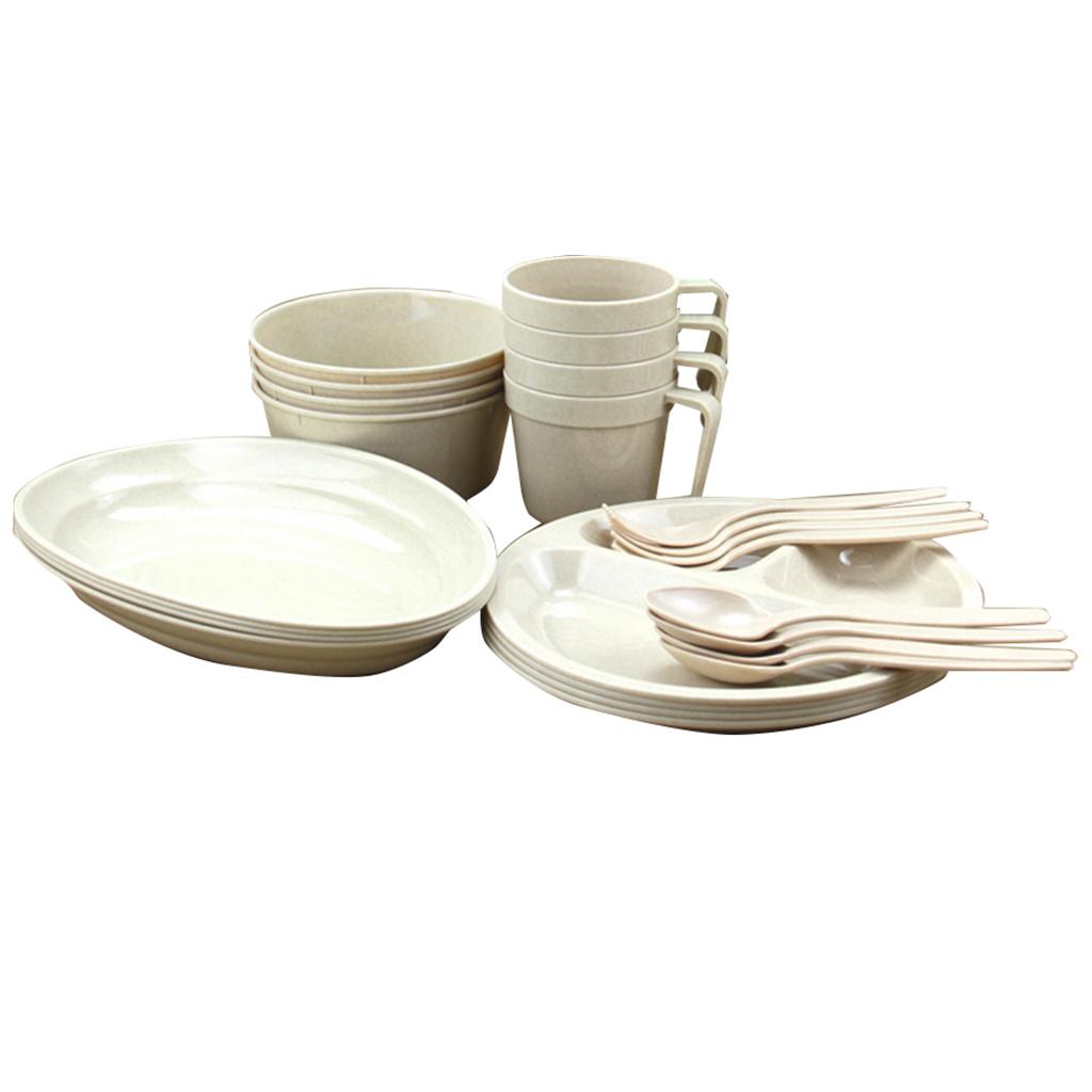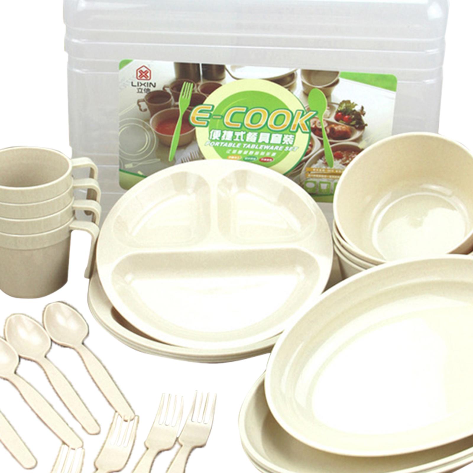 24 Pieces Plastic Reusable Tableware Set - 4 Mugs, 4 Long Plates, 4 Divided Plates, 4 Forks, 4 Spoons, 4 Soup Bowls and 1 Carry Case.