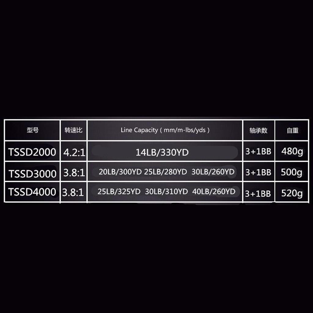 TSSD3000L; Line capacity (lb/yd): 20/300, 25/280, 30/260; Gear ratio: 3.8:1