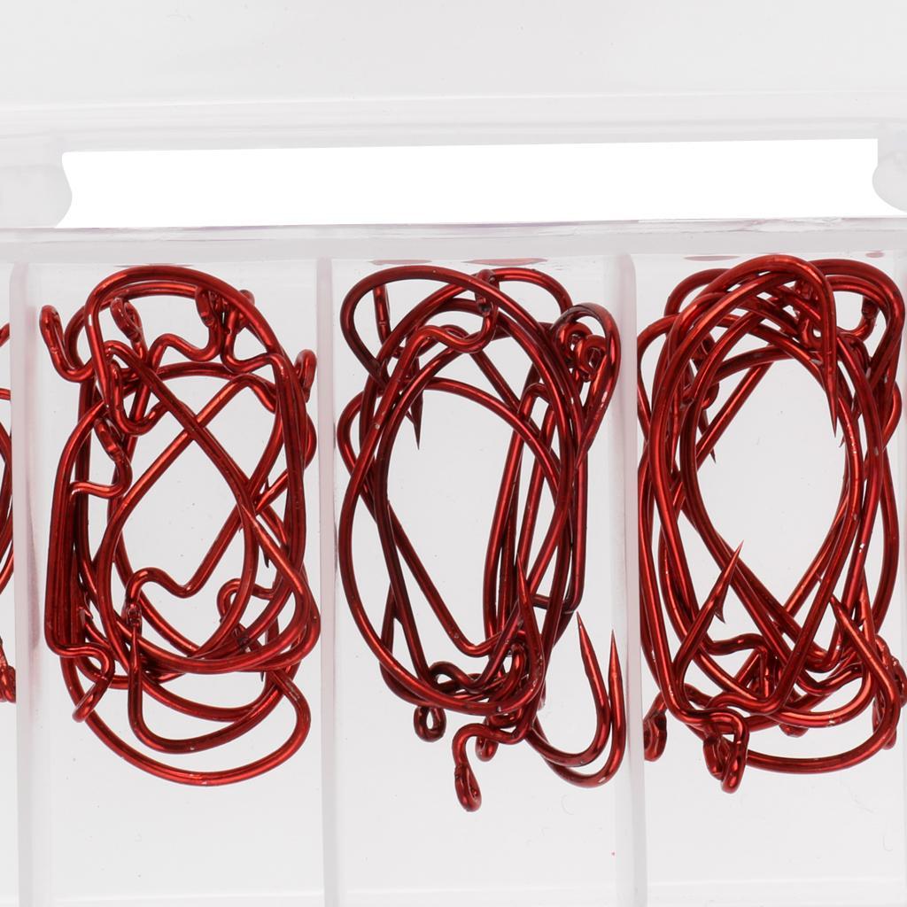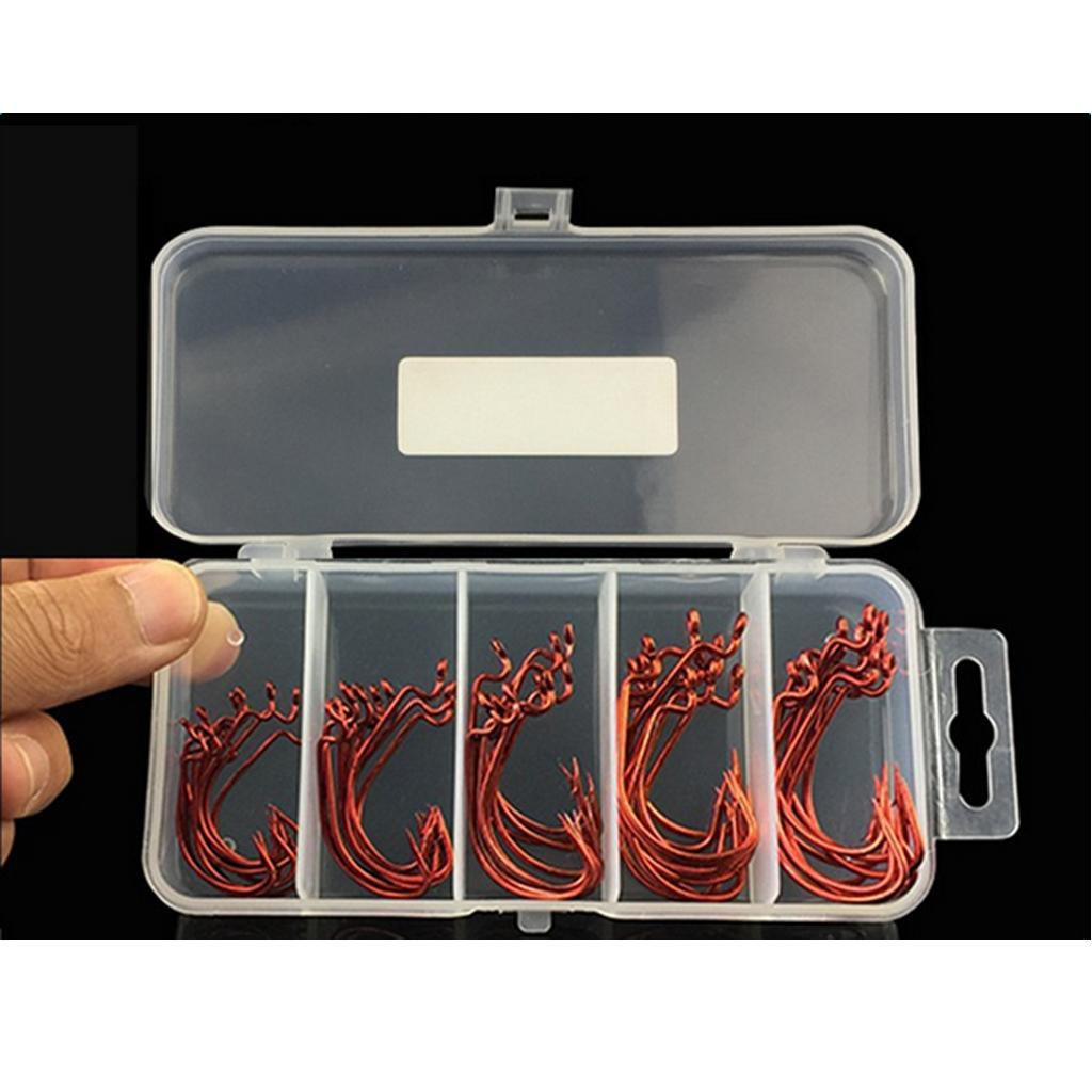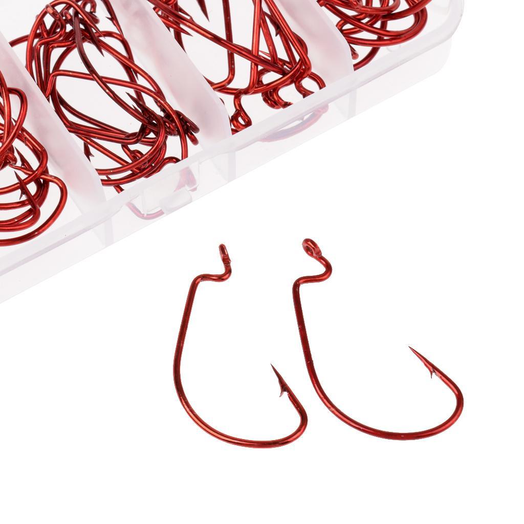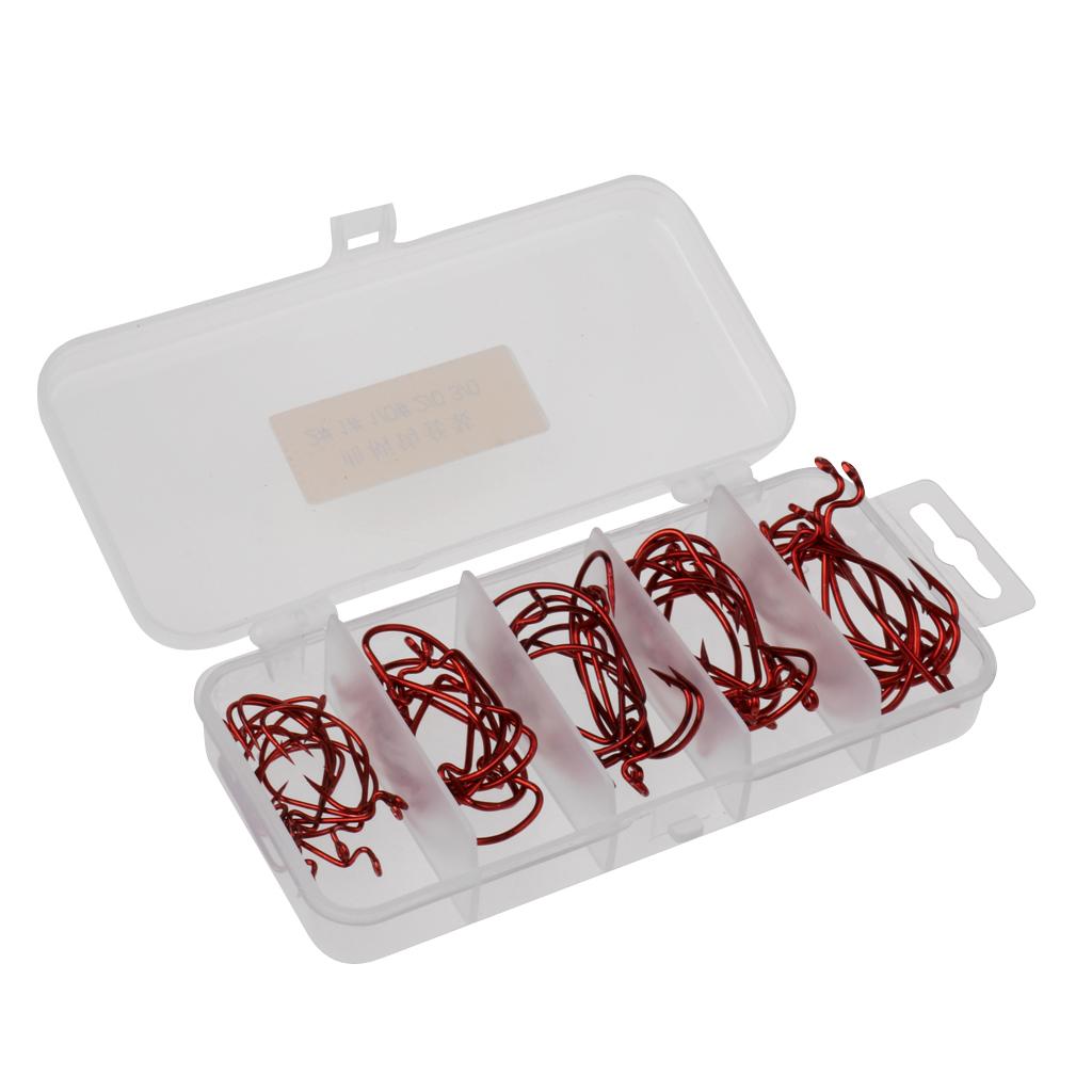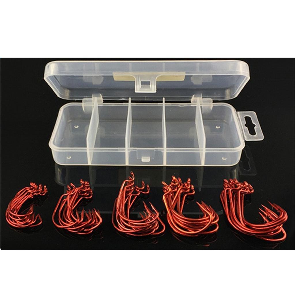 50 Pieces Various Sizes High Carbon Steel Crank Hook Wide Gap Barbed Bass Shad Jig Hooks with 5 Compartments Fishing Box Red