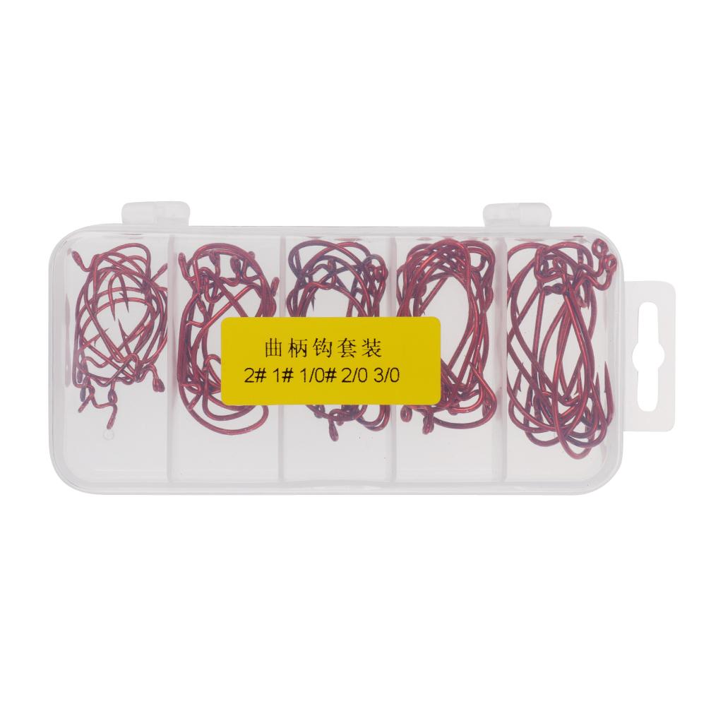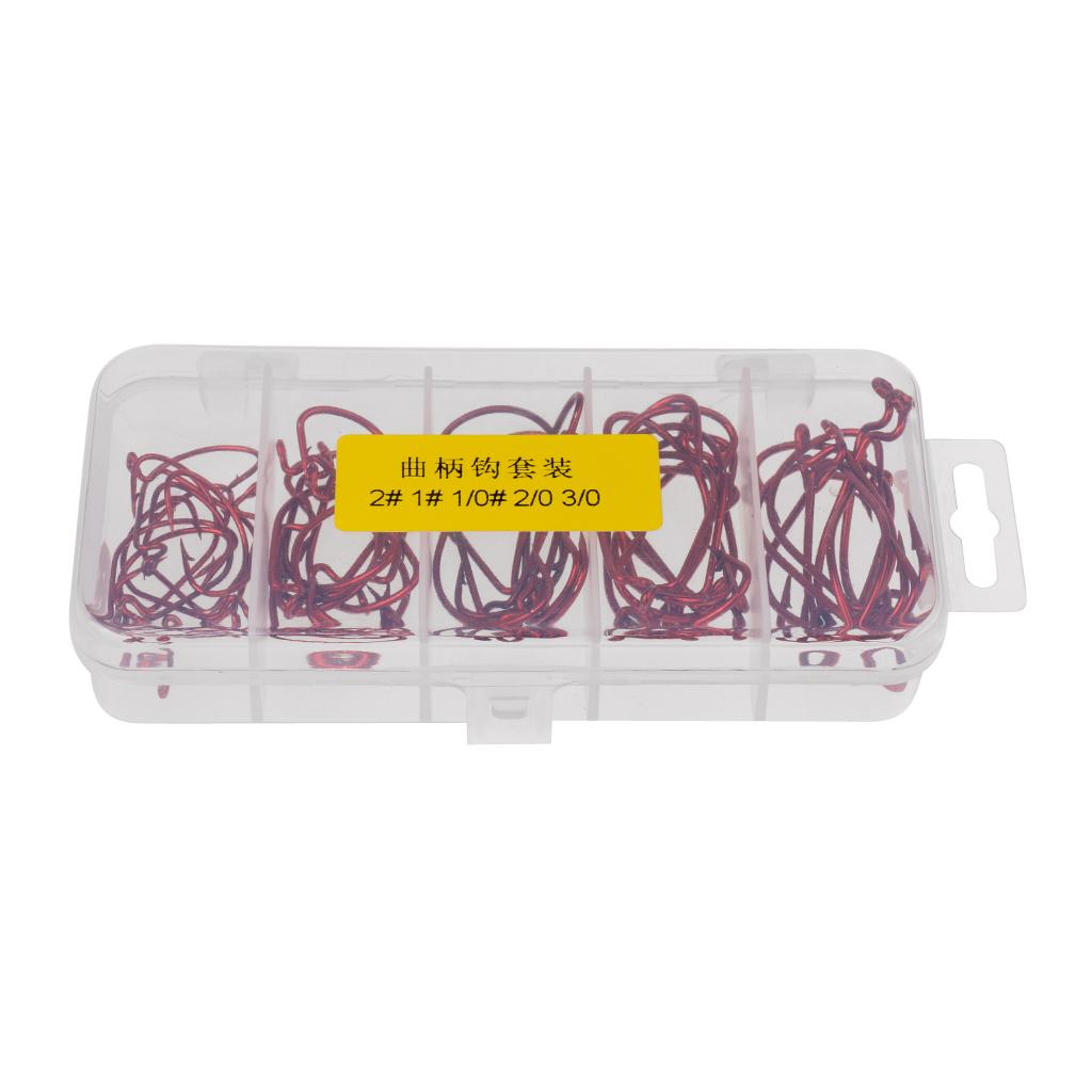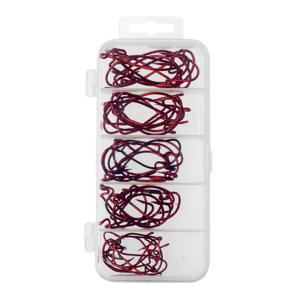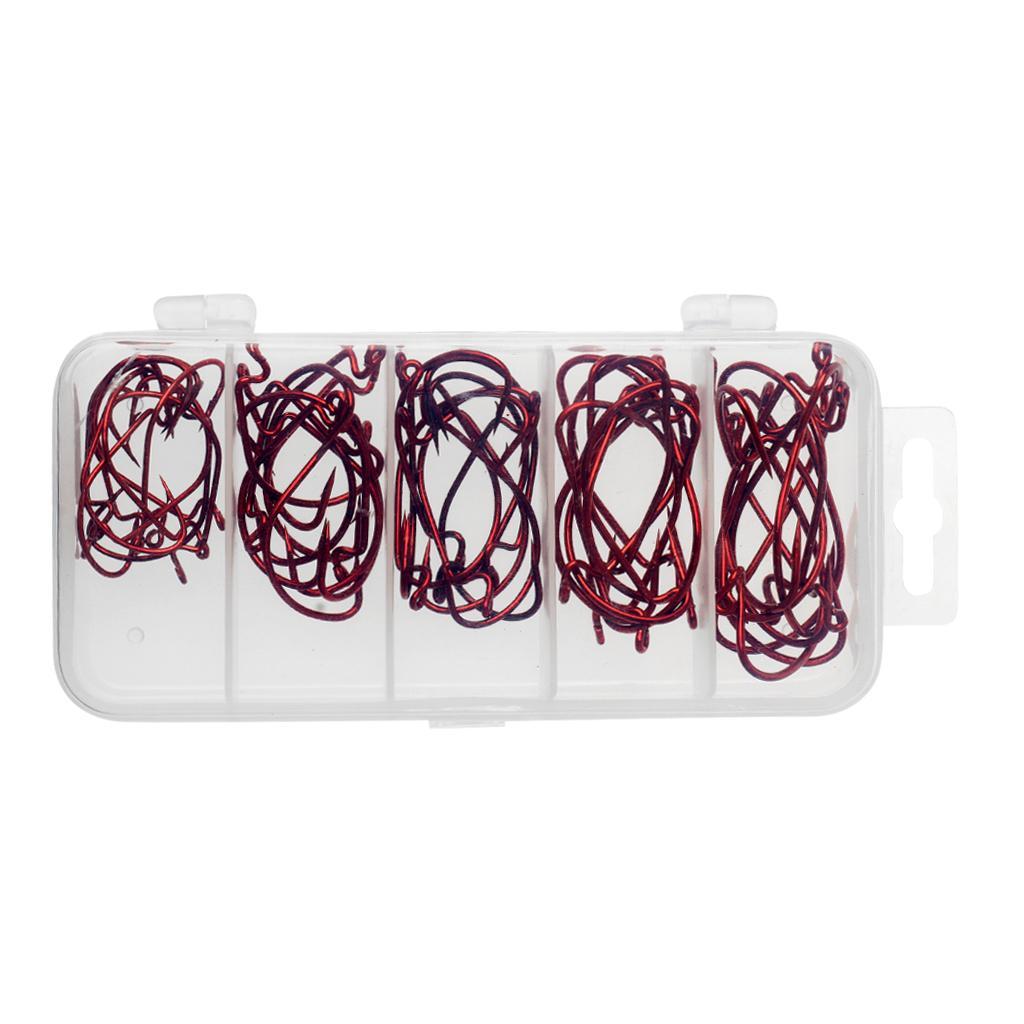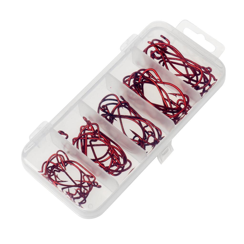 50 Pieces Various Sizes High Carbon Steel Crank Hook Wide Gap Barbed Bass Shad Jig Hooks with 5 Compartments Fishing Box Red