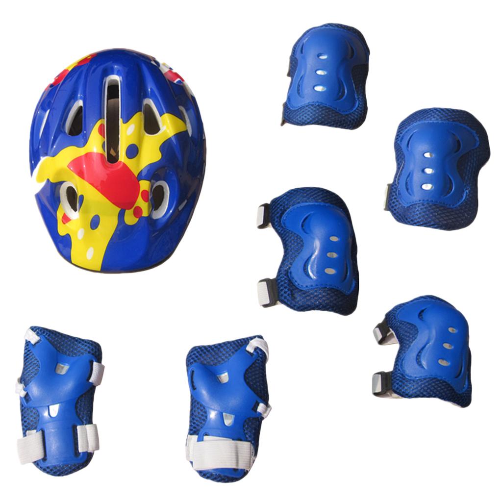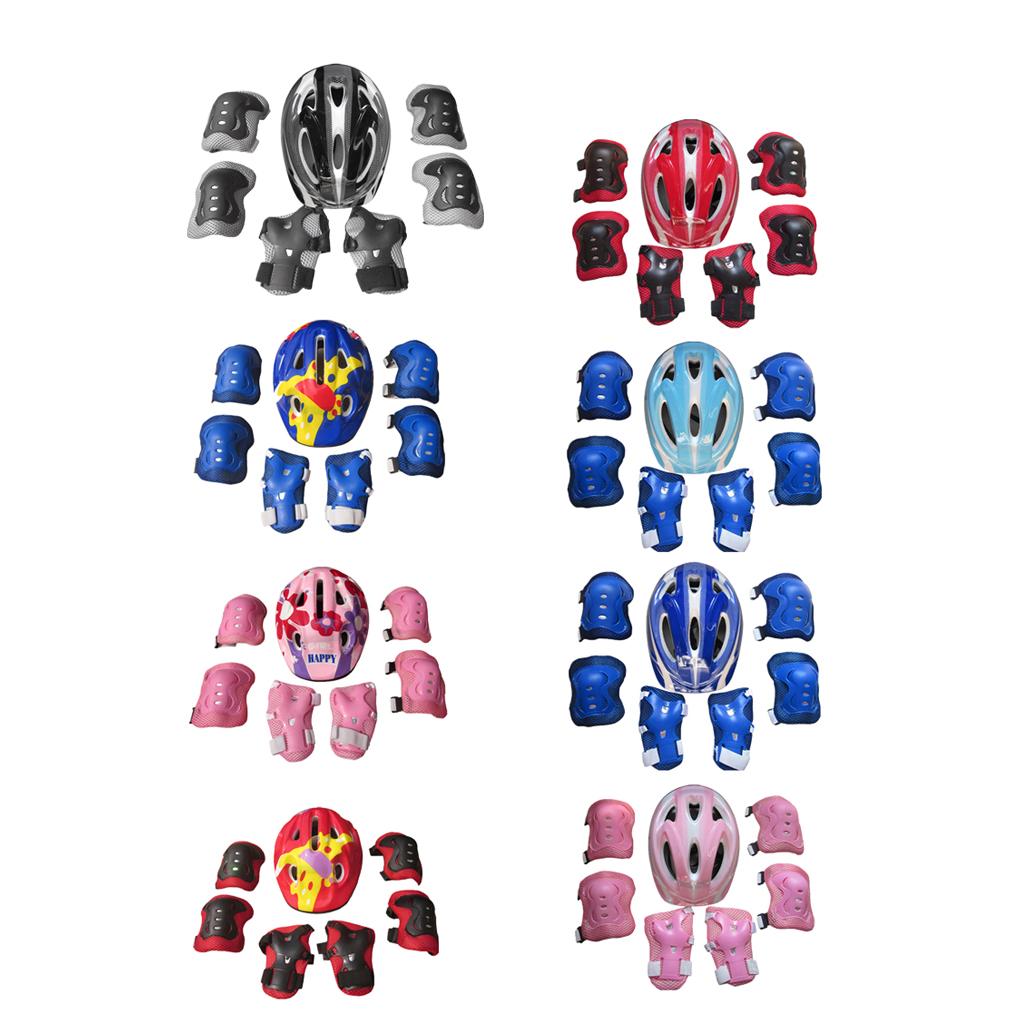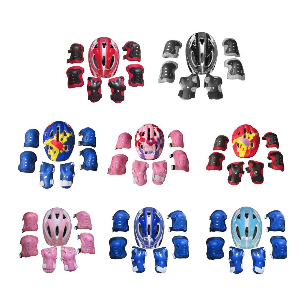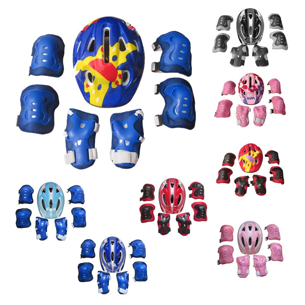 7 Pieces protective helmet, elbow, knee and wrist pad set in vivid pink, red and blue