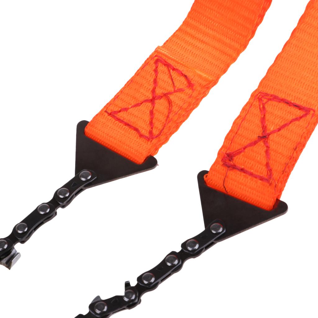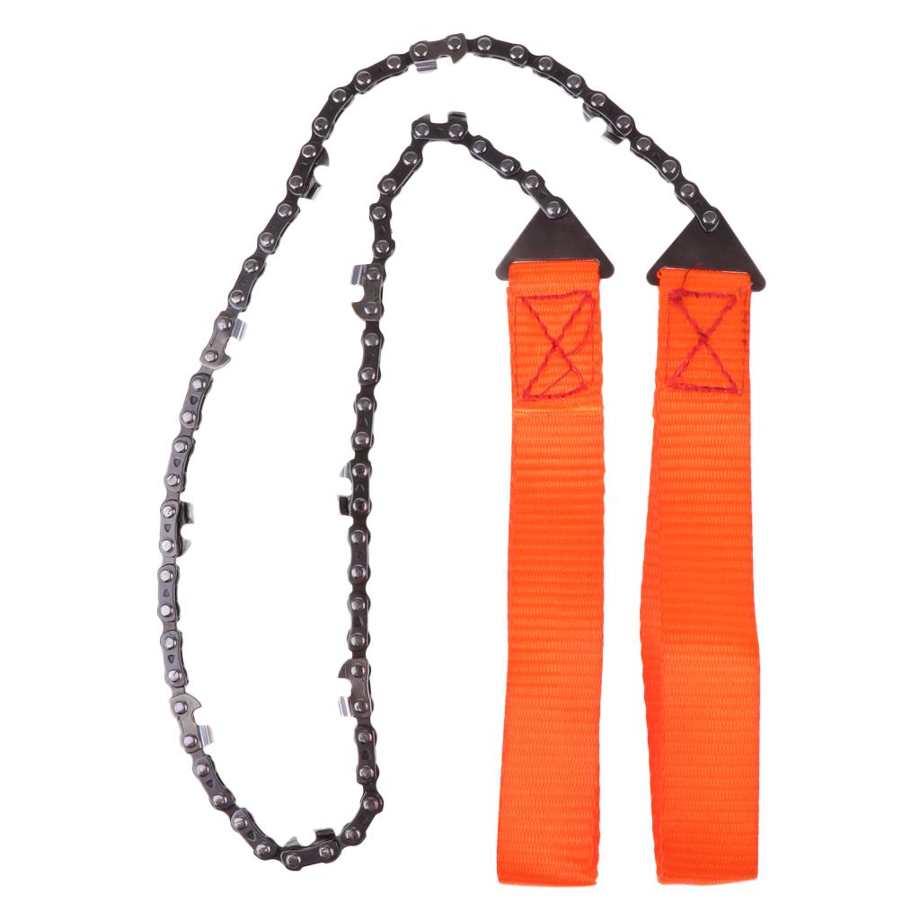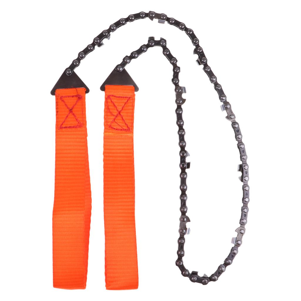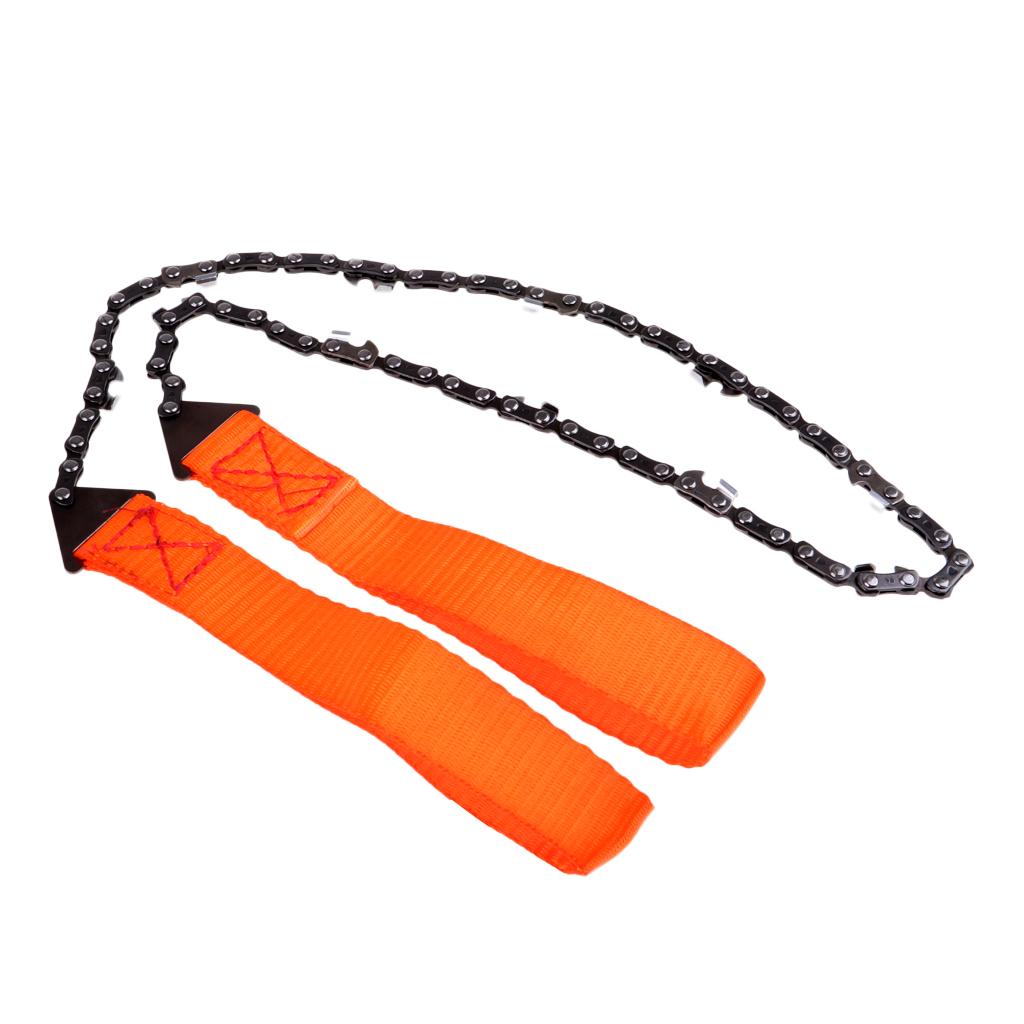 Pocket chain saw with two nylon handle straps, ultralight, portable, flexible, wear-resistant. 65cm long chain can be folded into small size, then packed in carry pouch with locking plastic buckle, then storage in your bag, backpack, tool box, etc.