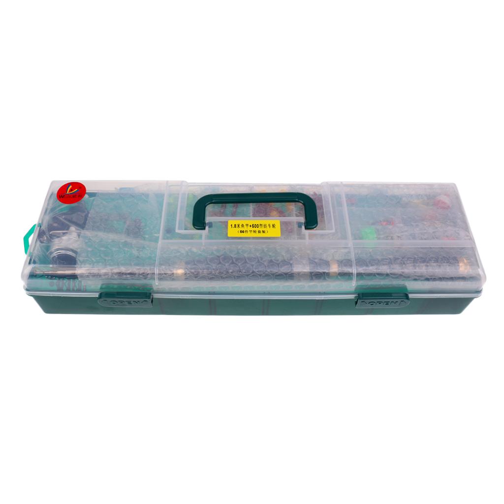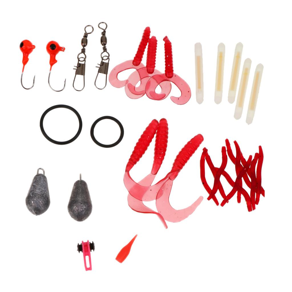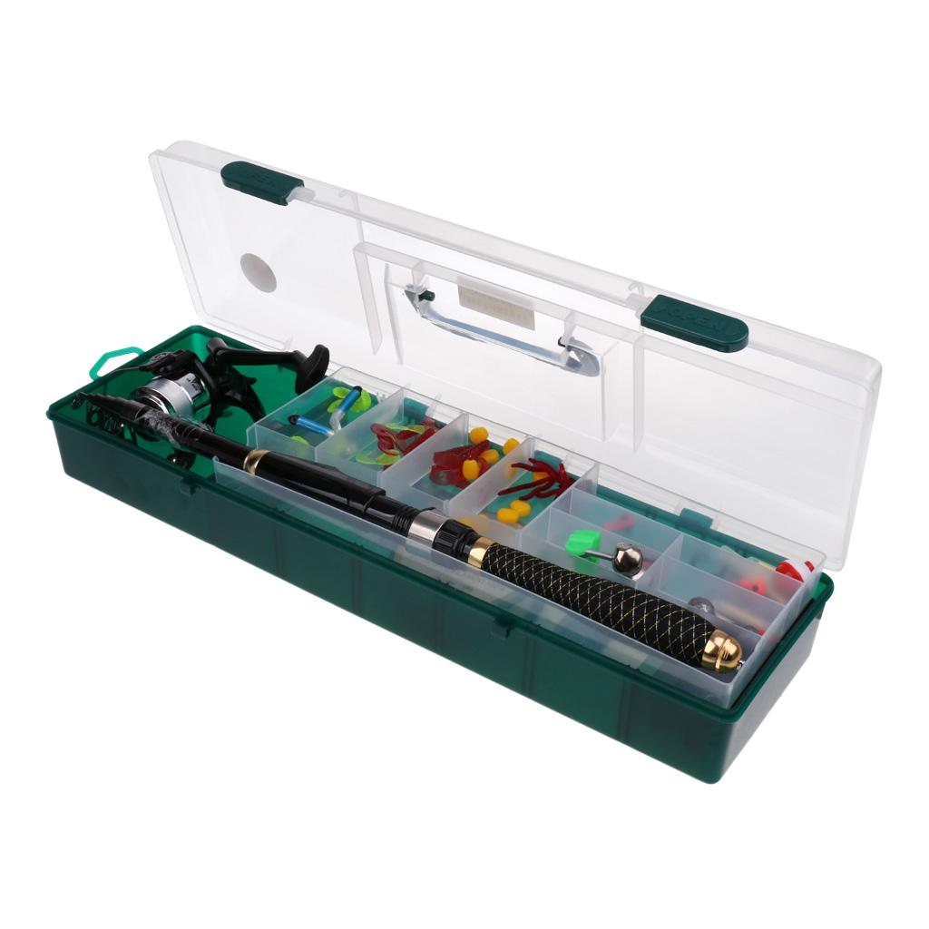 This set contains a fishing tackle box, inside with fishing rod, Spinning wheel, nylon wire ,carp hooks, Round lead hooks, Red earthworm, Artificial Corn grain, Bread bug, Single tailed maggot, Tubular maggot, twin tails, Light stick, Bait hanging device, Fishing Swivels, Bell, Lead Sinker, scissors, and Buoy.